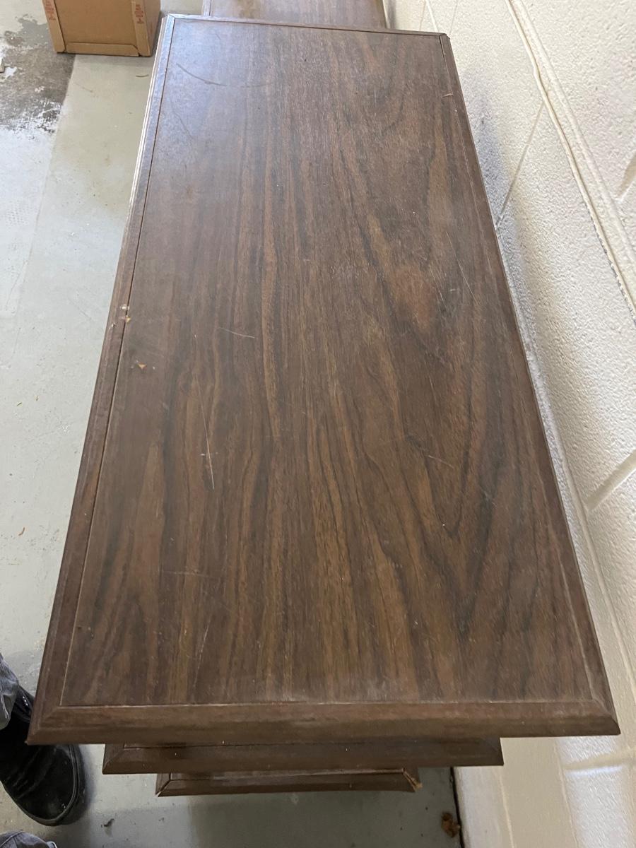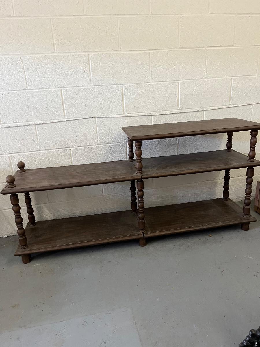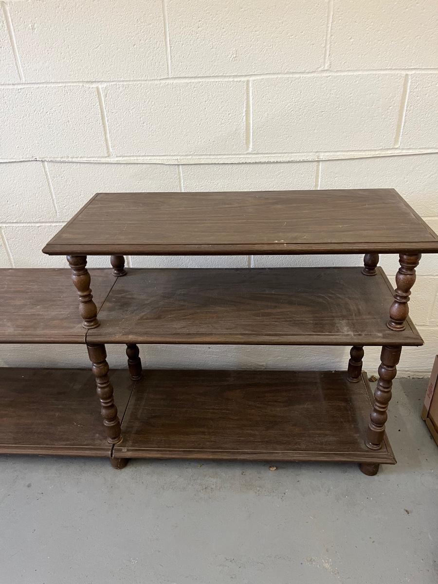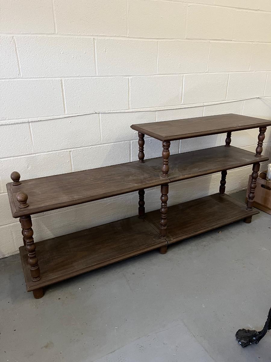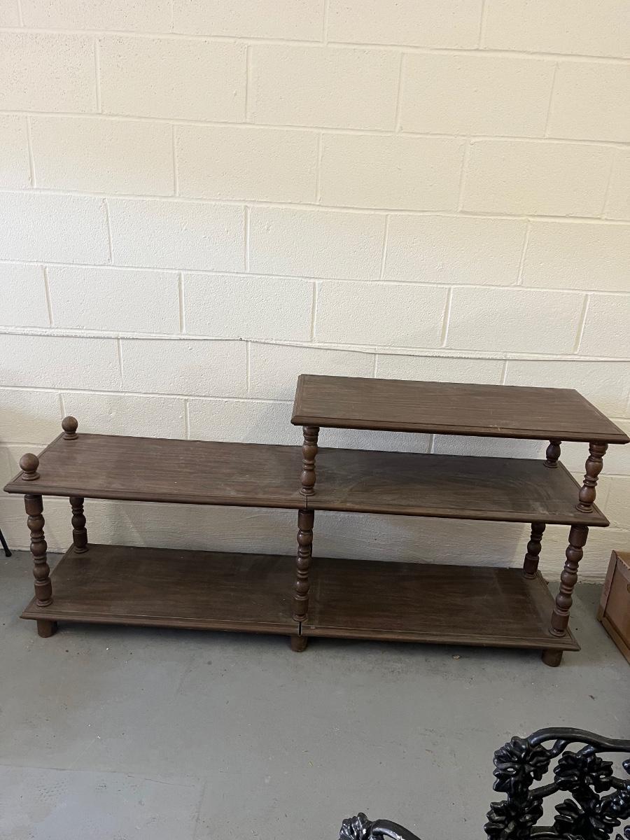 Lot includes a wooden bookcase that measures 62” x 16” x 30”H. Piece appears to be Formica with wood trim and spindles.