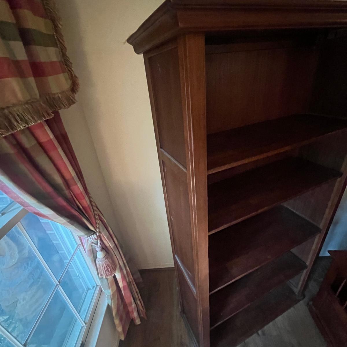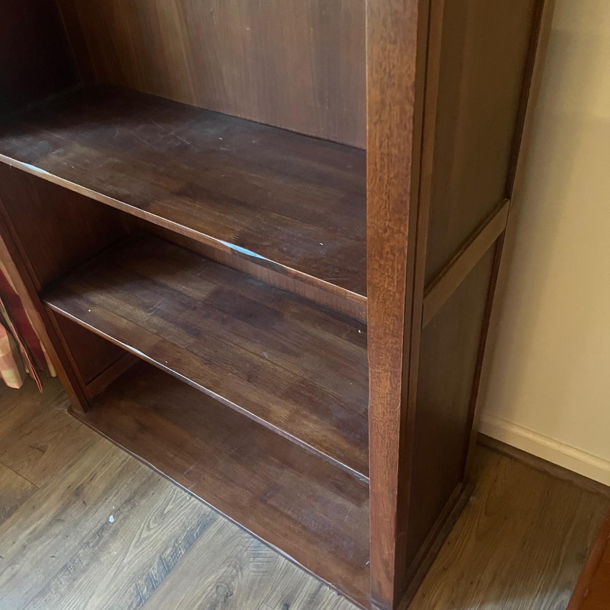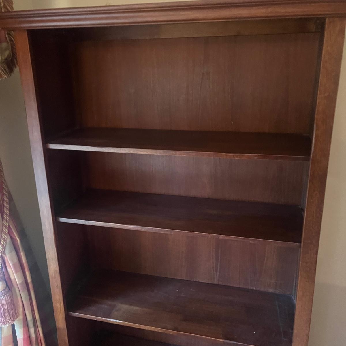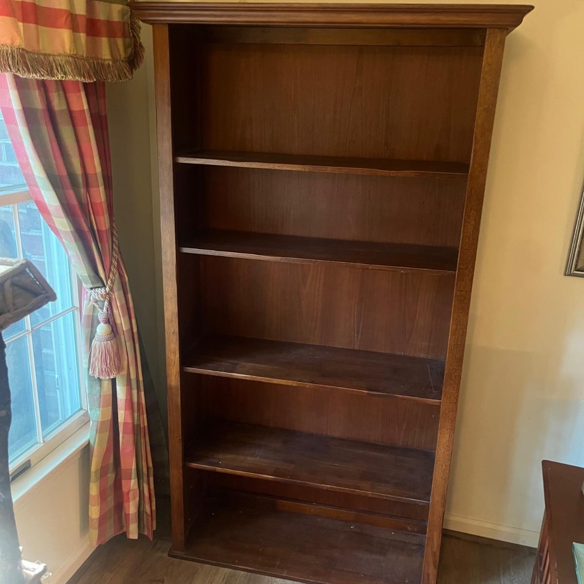 Lot includes a wooden bookcase with two of the shelves adjustable. Bookcase measures 39” x 15” x 69”H. Bookcase has scratches and nicks, see pictures.