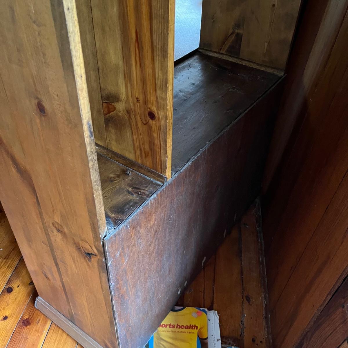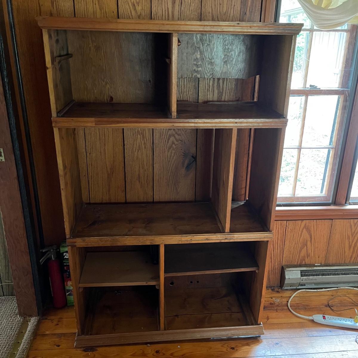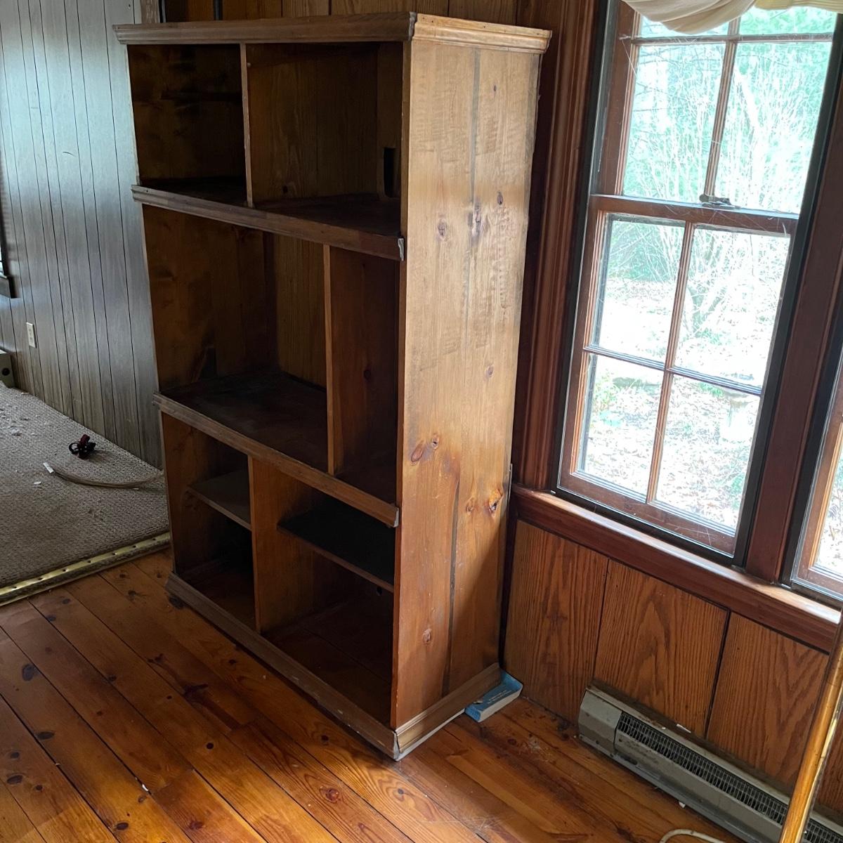This wooden bookcase appears to be mostly solid wood and measures 15” x 39” x 61”. The back is open in parts, see pictures. Bring help item is substantial.