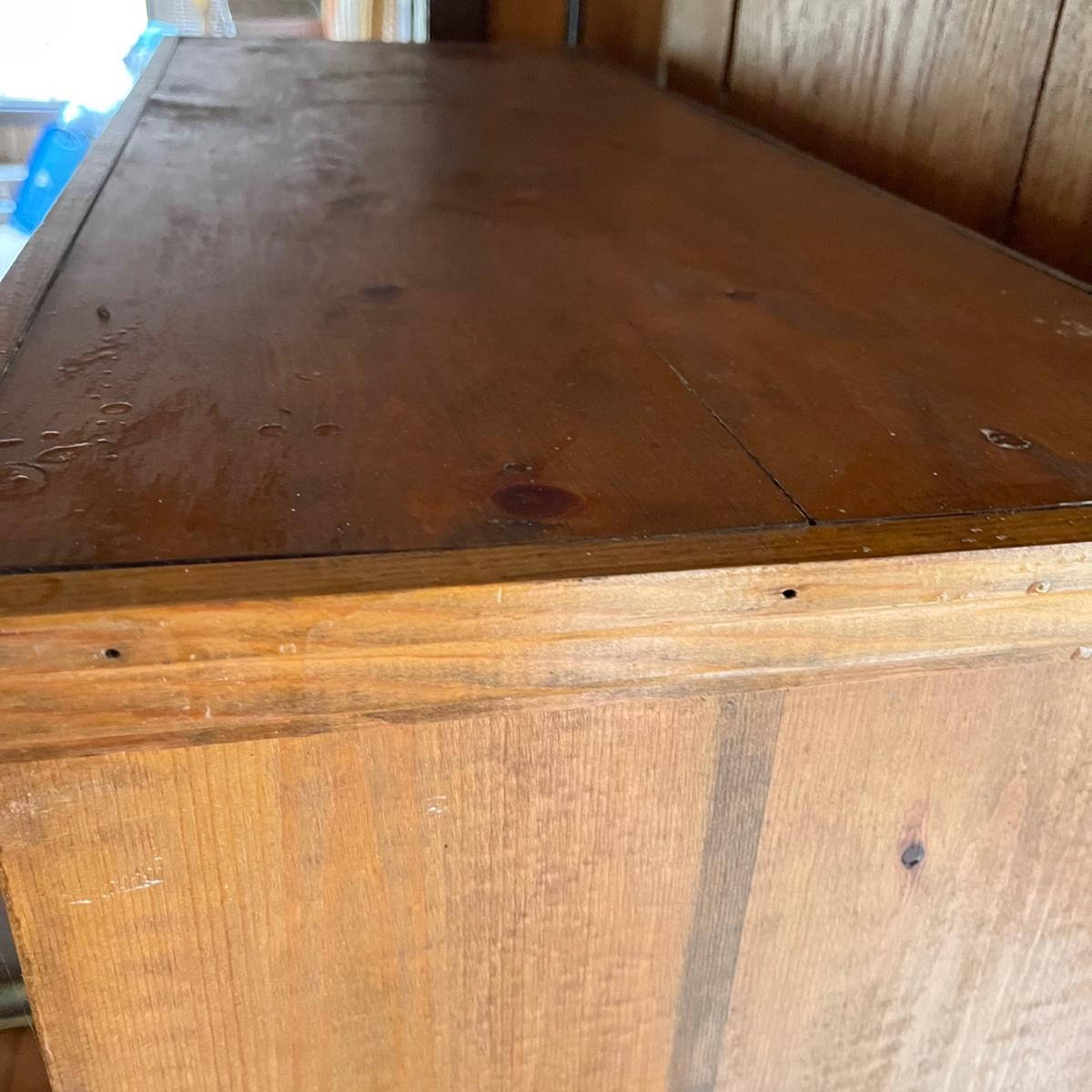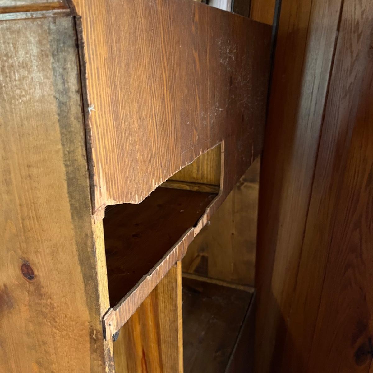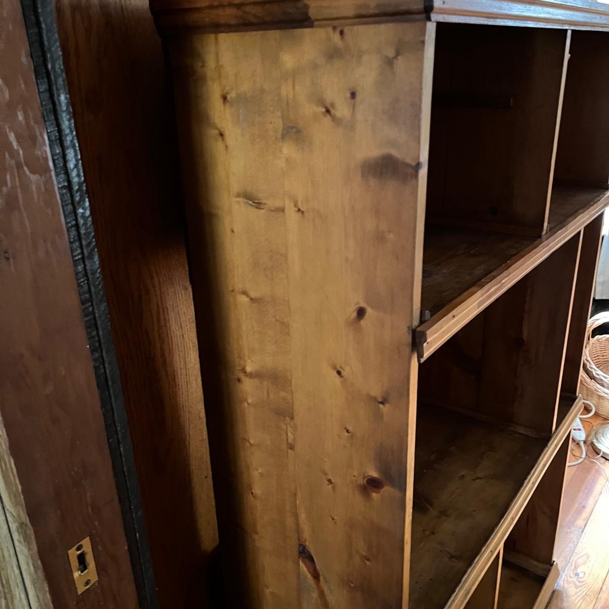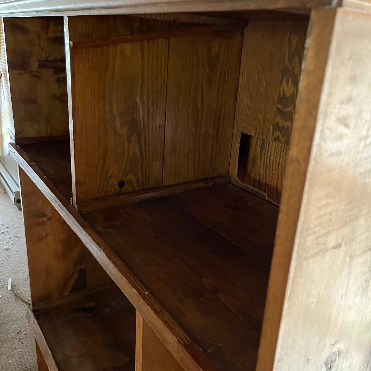 This wooden bookcase appears to be mostly solid wood and measures 15” x 39” x 61”. The back is open in parts, see pictures. Bring help item is substantial.