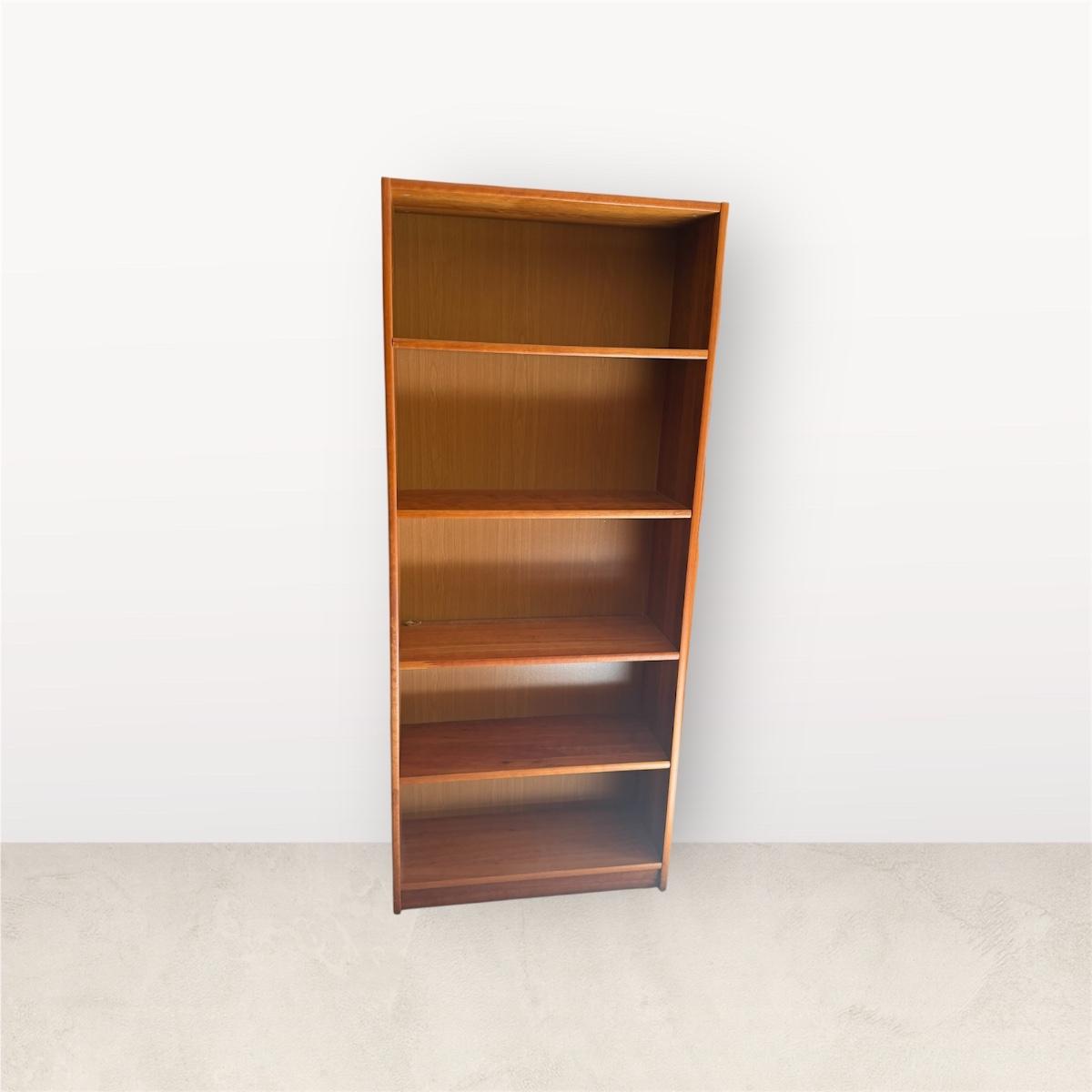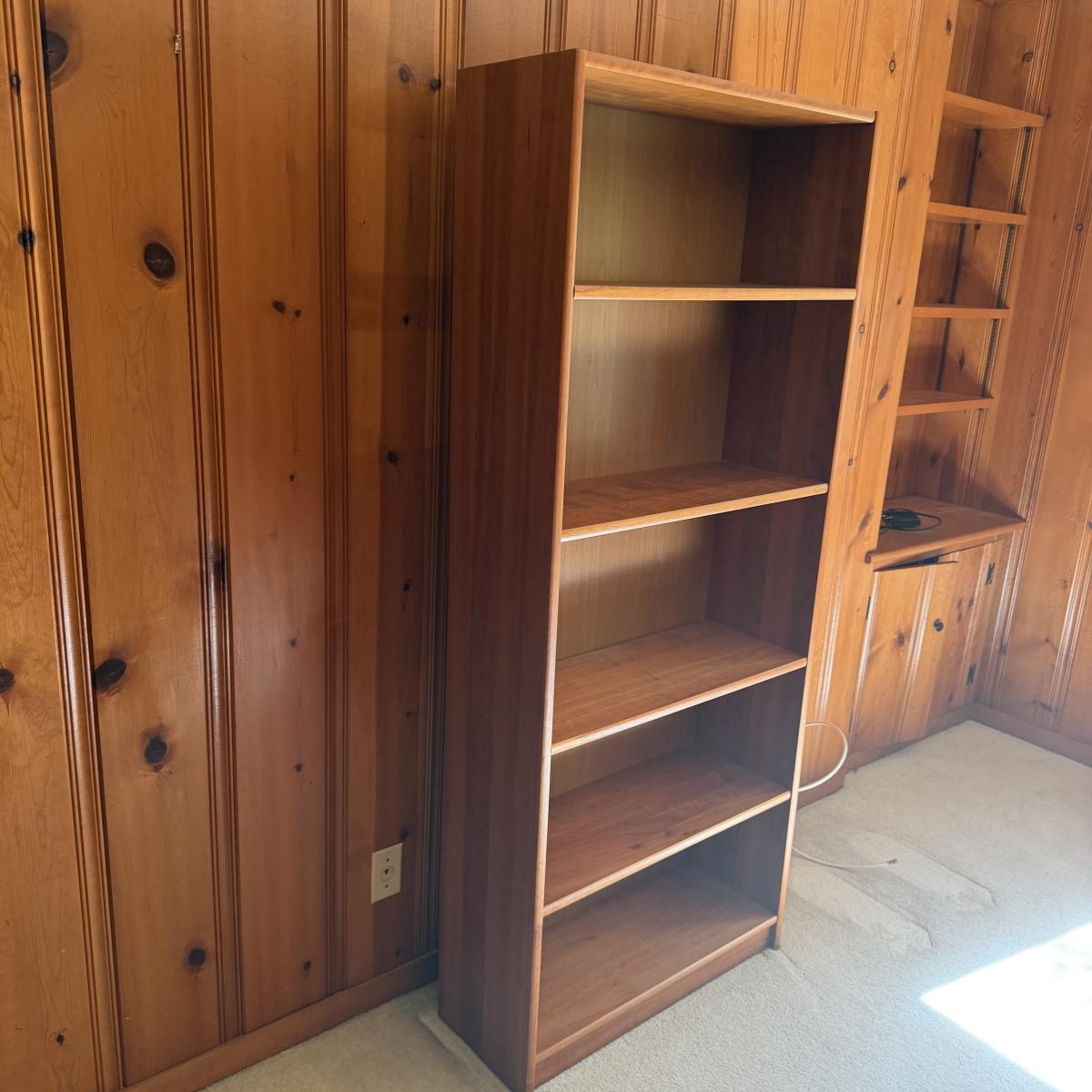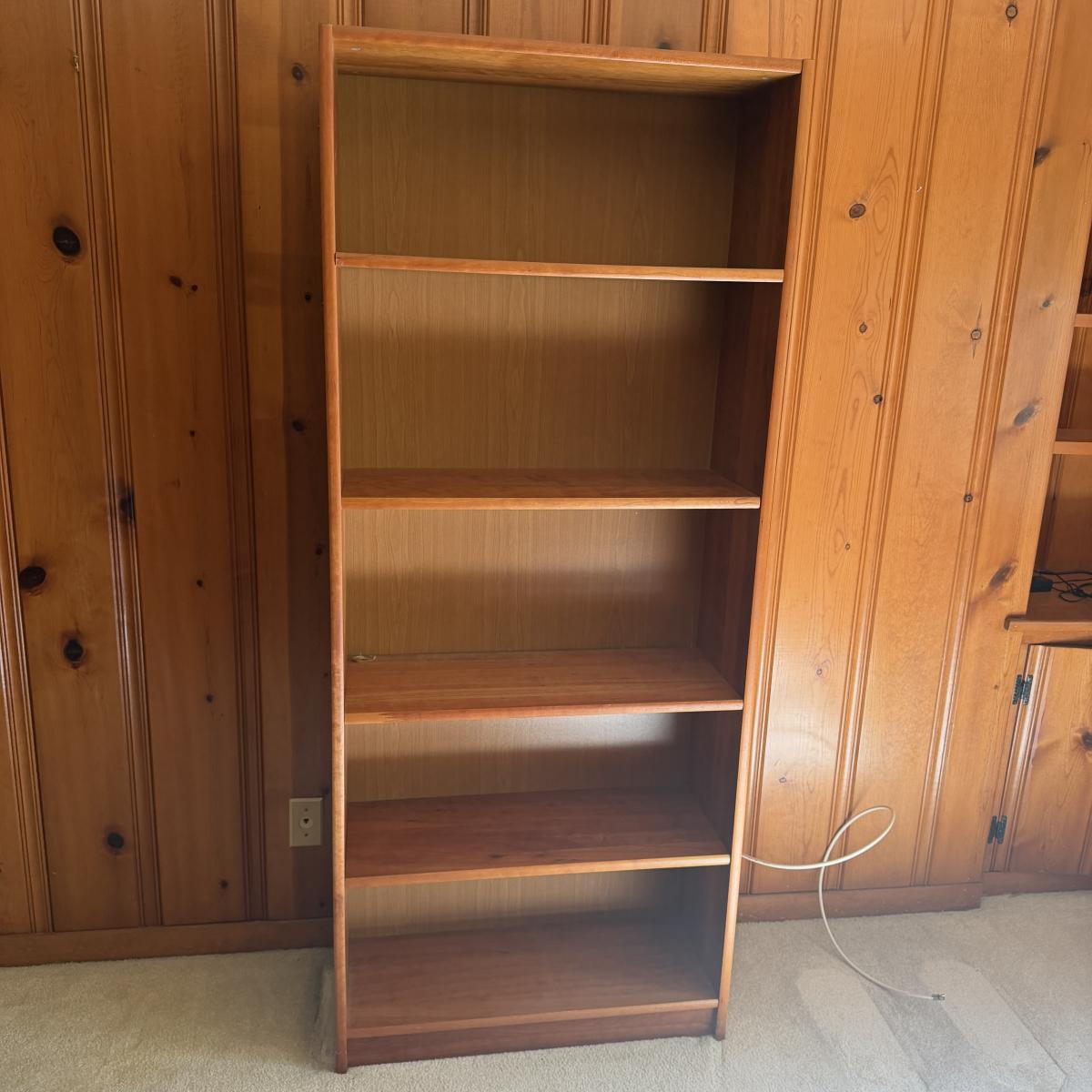 This wooden bookshelf has four adjustable shelves. Bookshelf measures 30” x 11” x 72”H. Bookshelves is pressed wood.
