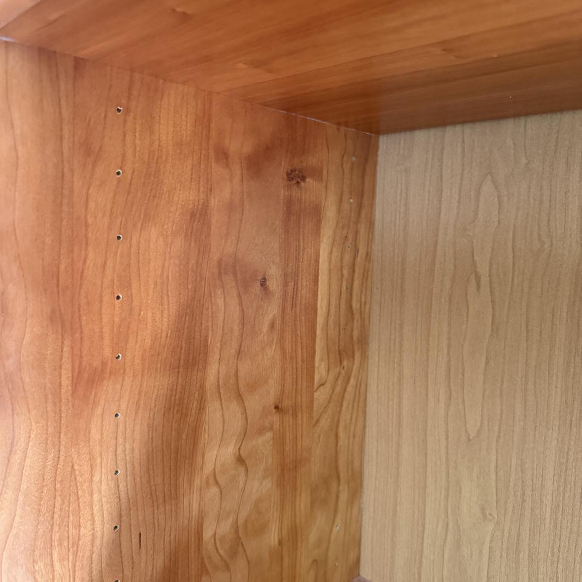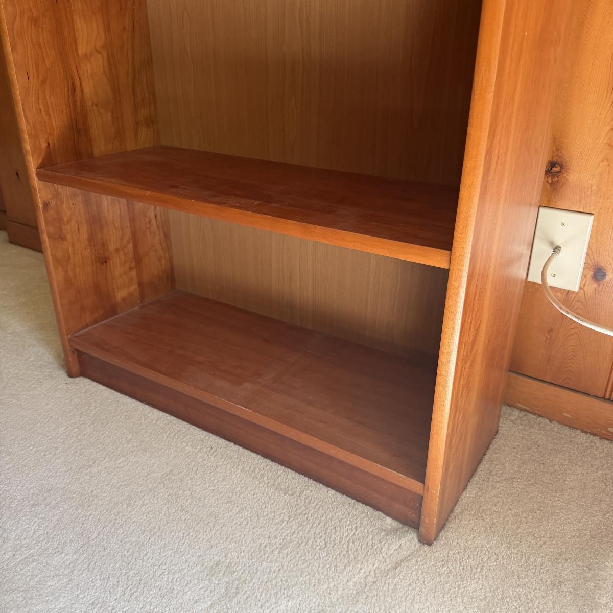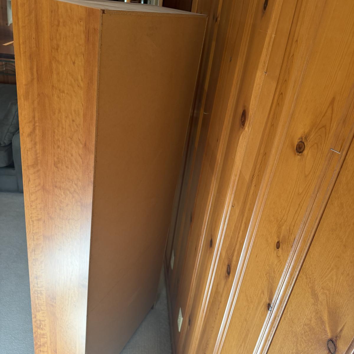This wooden bookshelf has four adjustable shelves. Bookshelf measures 30” x 11” x 72”H. Bookshelves is pressed wood.