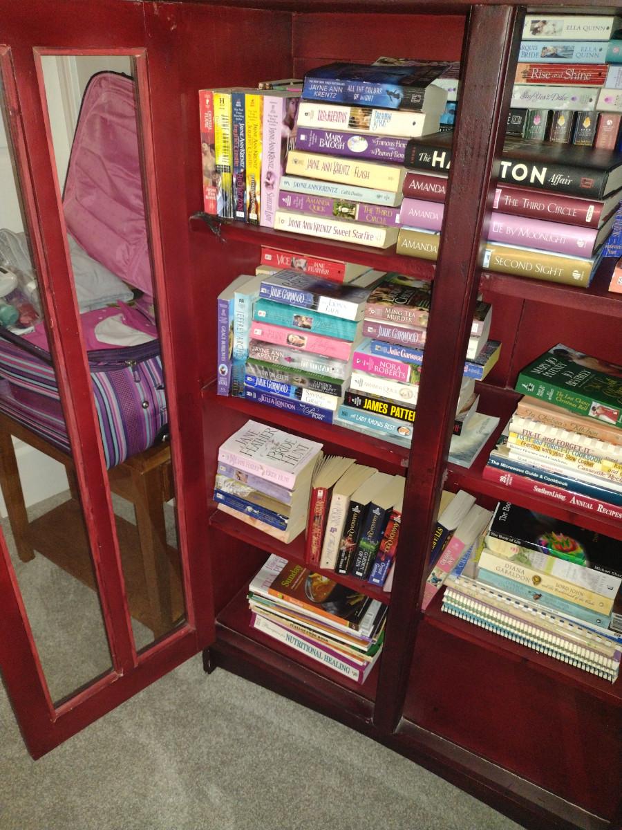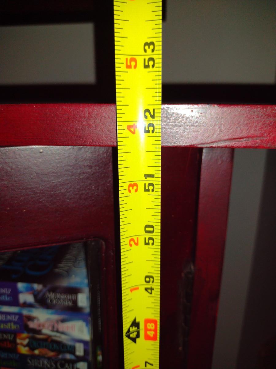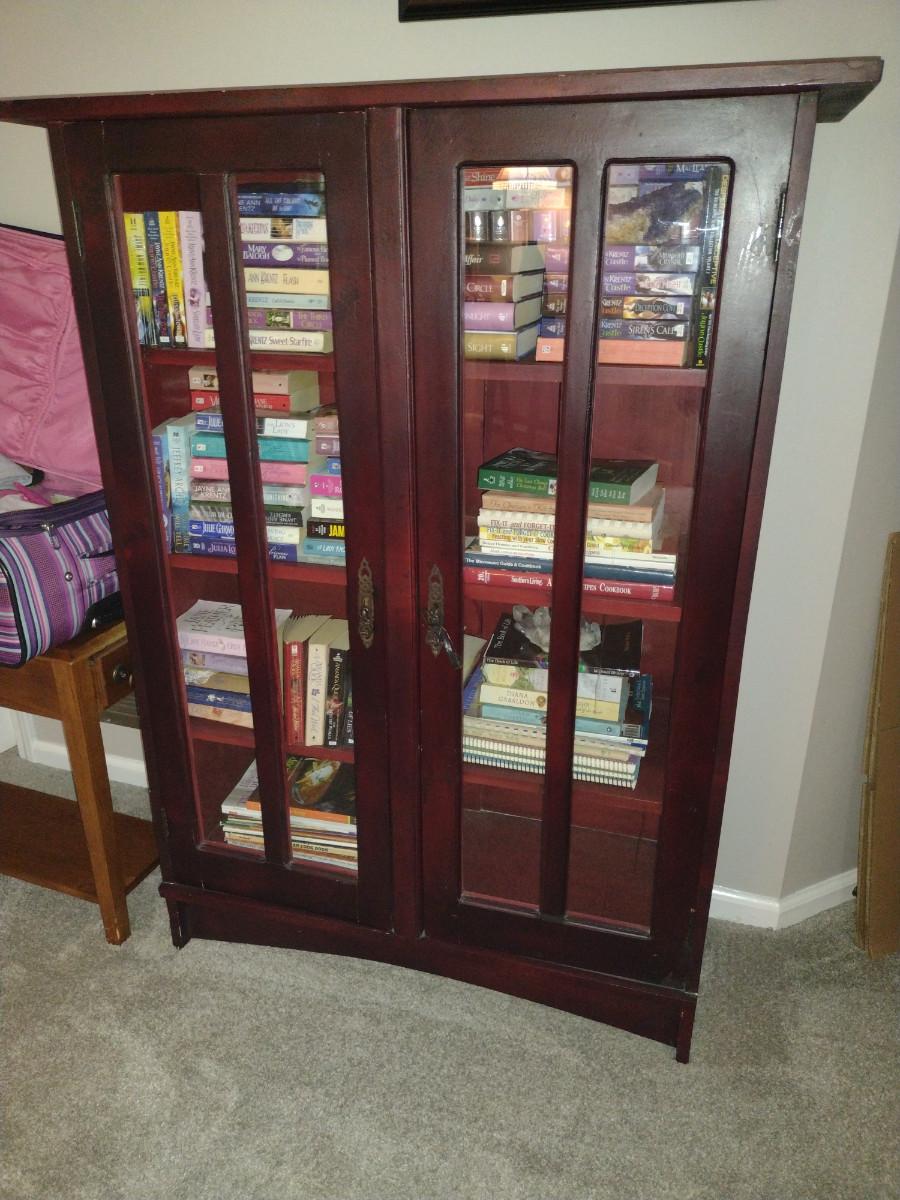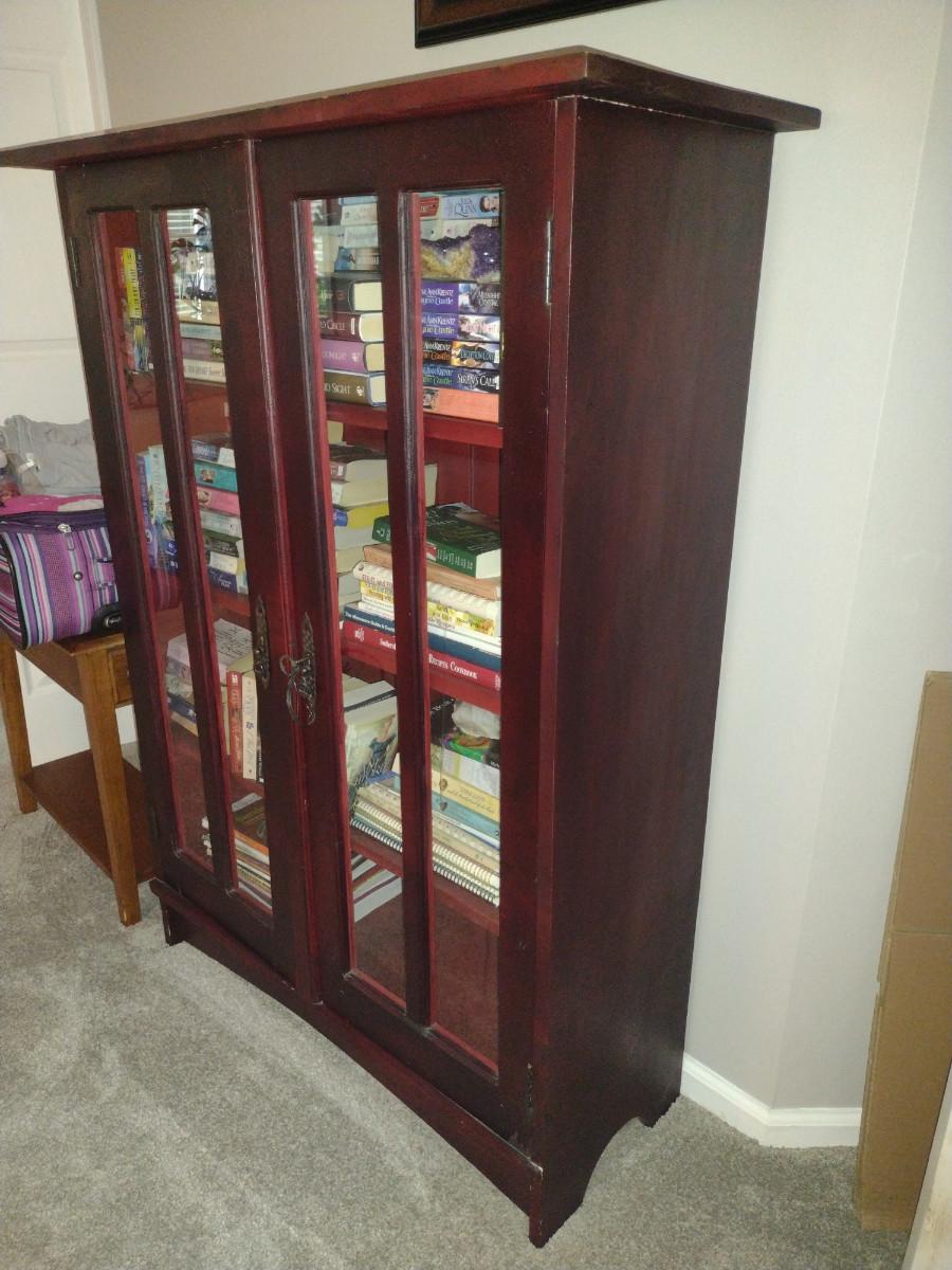 Wooden Bookshelf Cabinet with Doors. Measures approx 39" wide, 15 1/2" deep, 52" tall. No contents included.