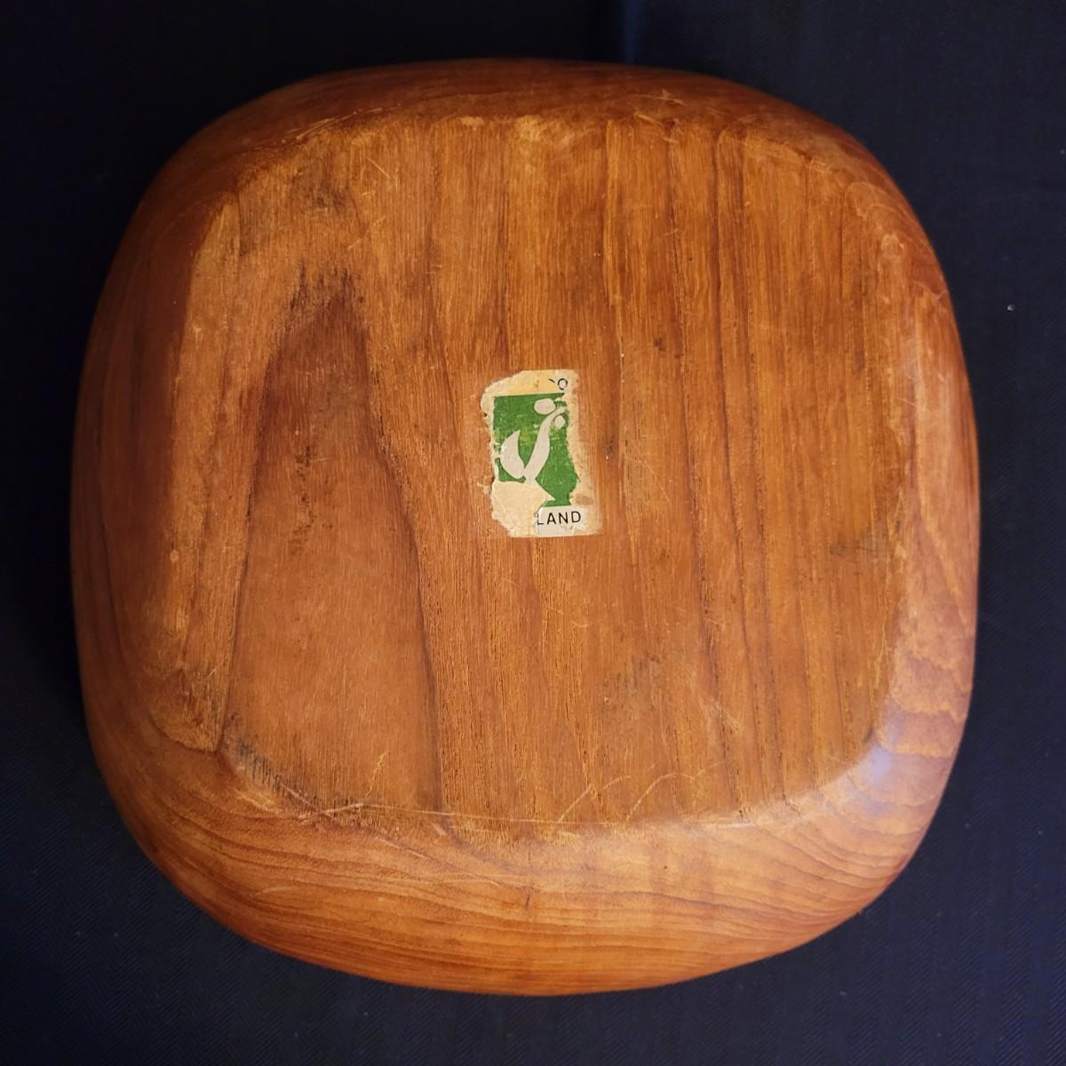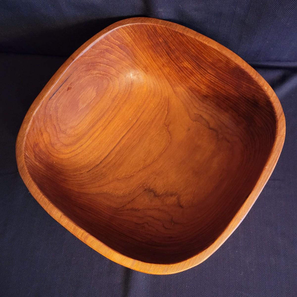 An assortment of wooden kitchen accessories that includes large and small bowls, salad tongs, and a napkin holder. The largest squarish bowl with a dark finish measures approximately 12" x 12" x 5"H. Local pickup only