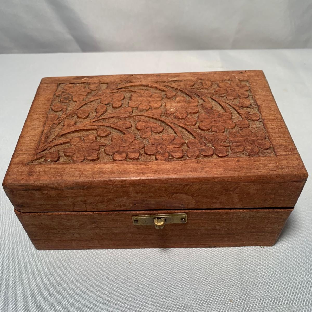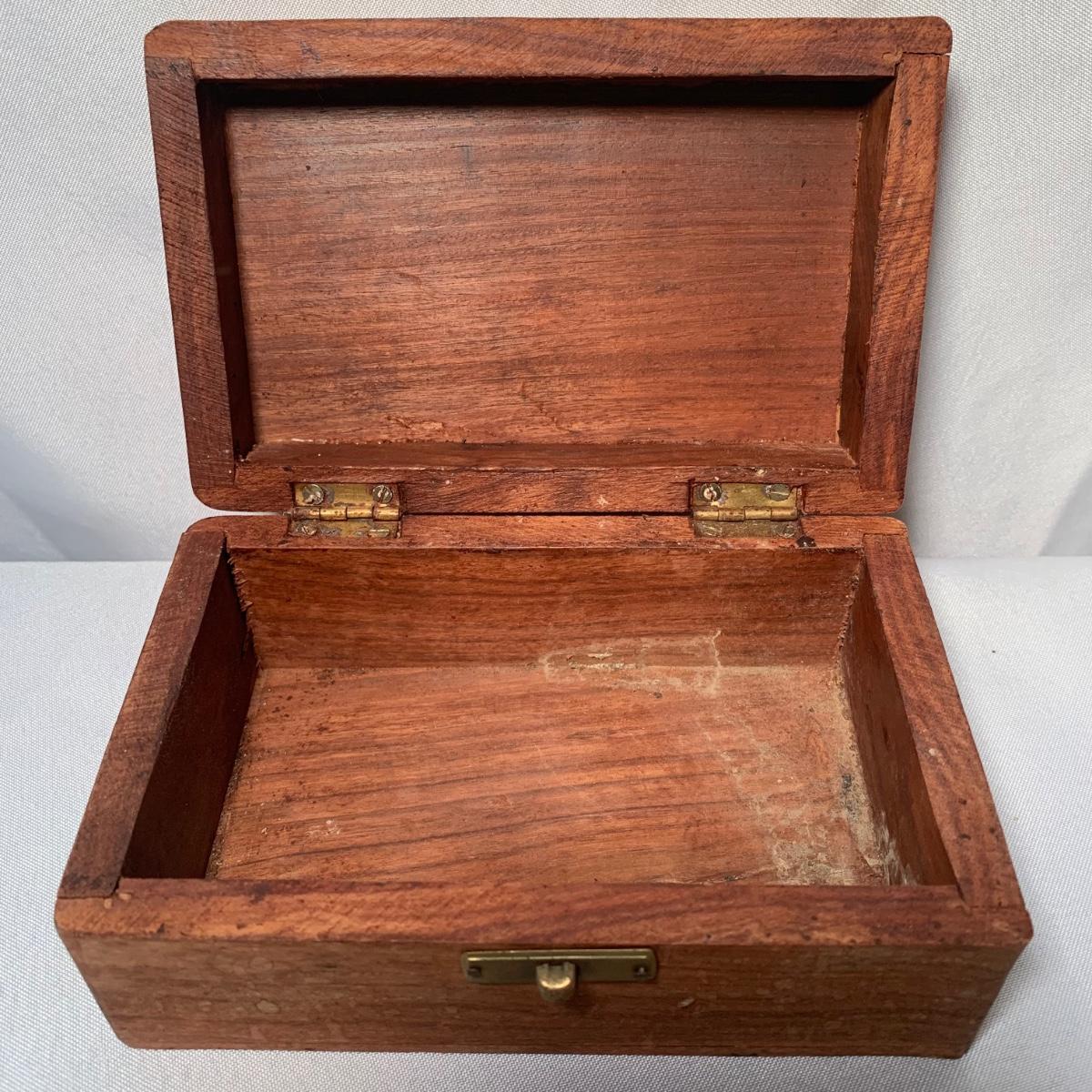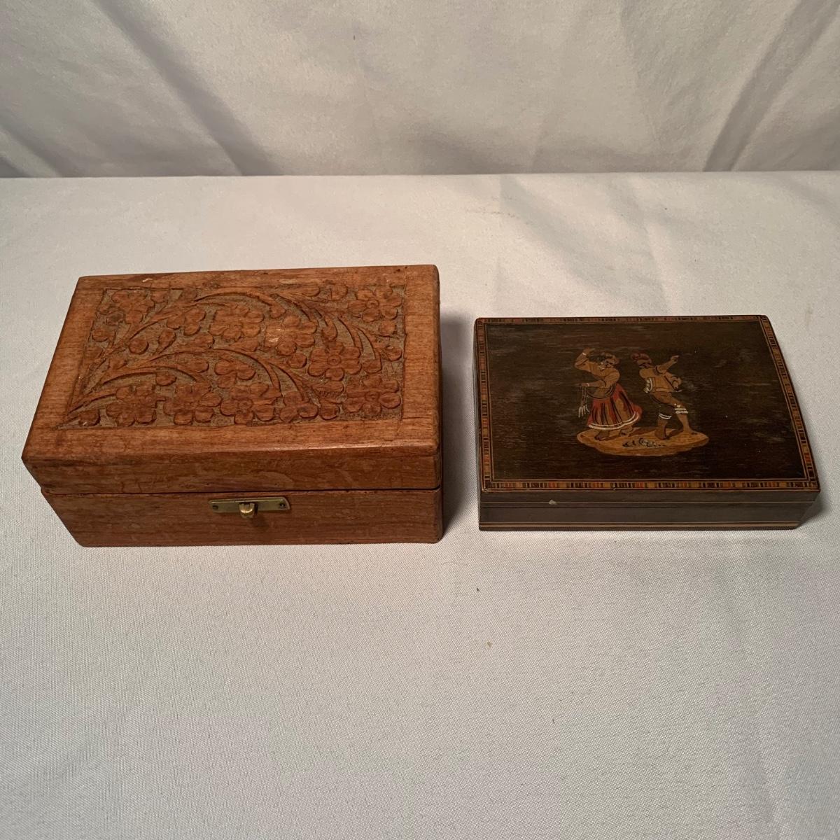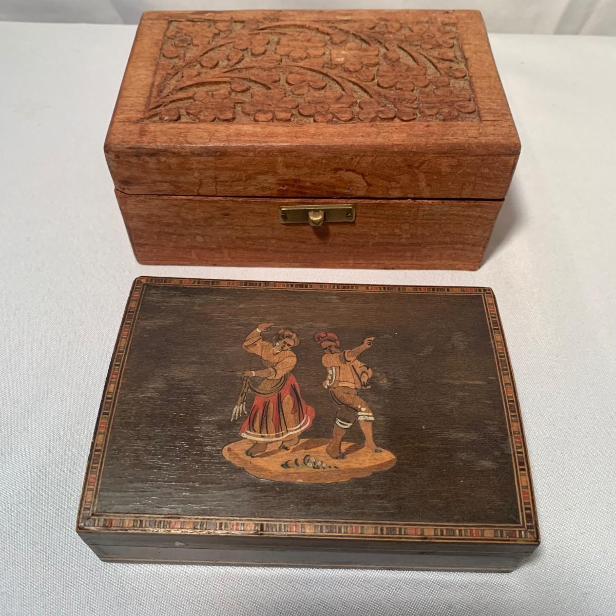 This lot includes two wooden boxes. Smaller box features two dancers within a framed border. Largest is a floral carved wooden box measuring 6.5”L x 4”W x 2.5”H. Larger box is missing the top piece of locking mechanism and needs to be cleaned, otherwise both items are in good condition.