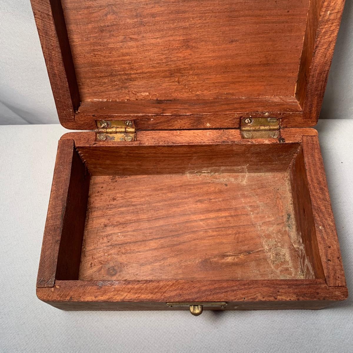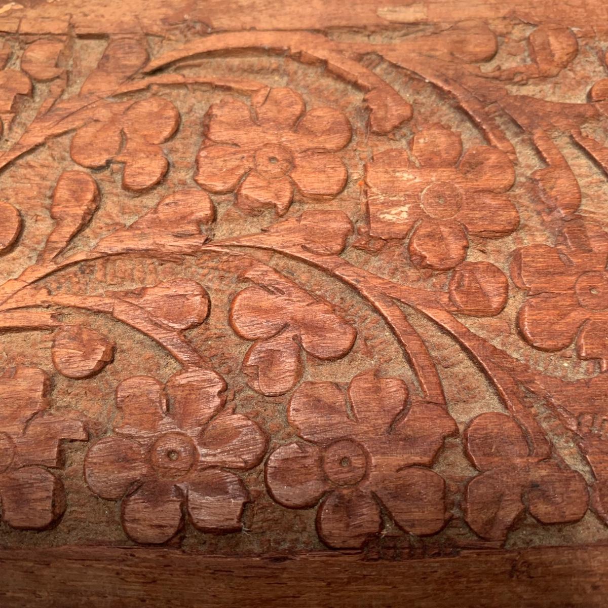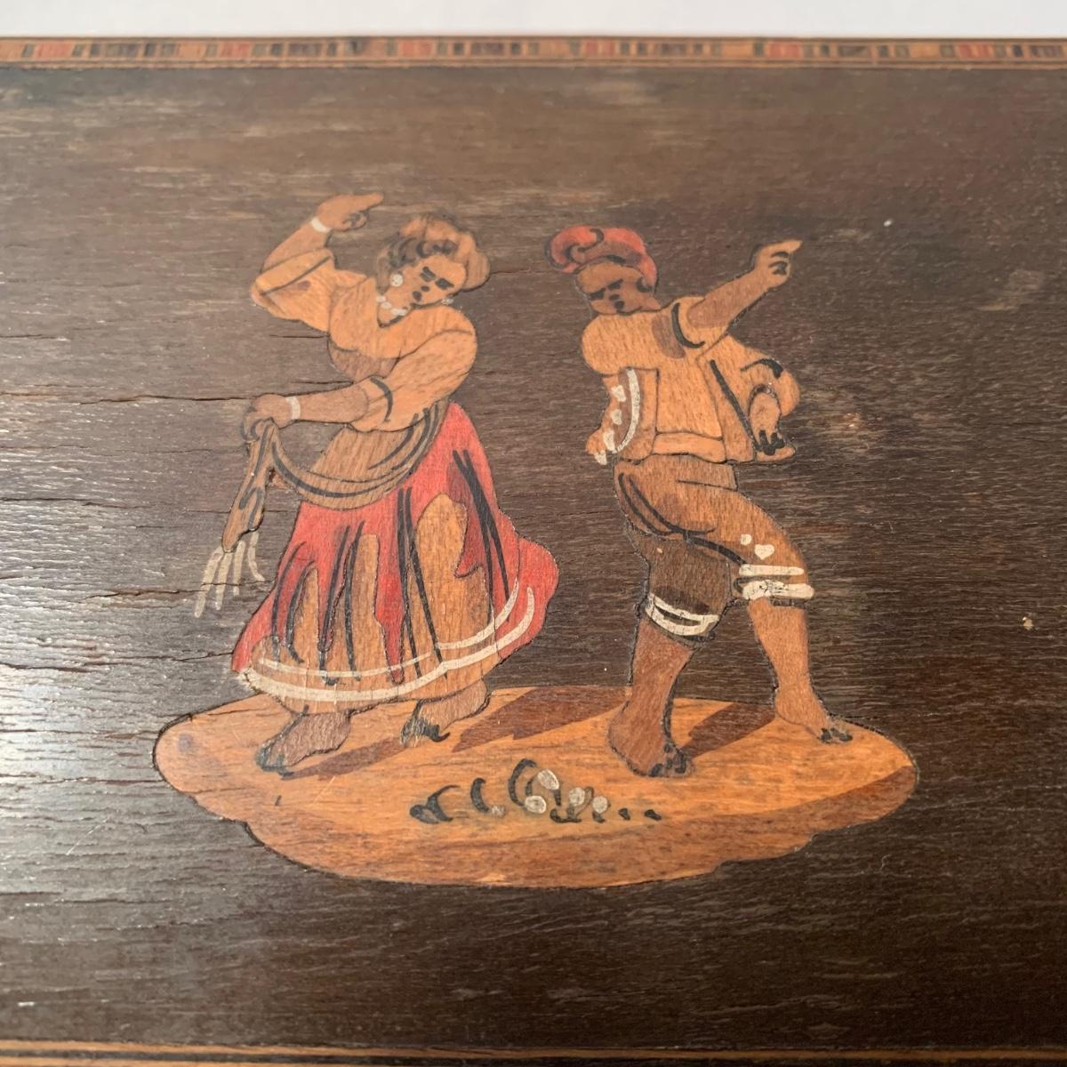 This lot includes two wooden boxes. Smaller box features two dancers within a framed border. Largest is a floral carved wooden box measuring 6.5”L x 4”W x 2.5”H. Larger box is missing the top piece of locking mechanism and needs to be cleaned, otherwise both items are in good condition.