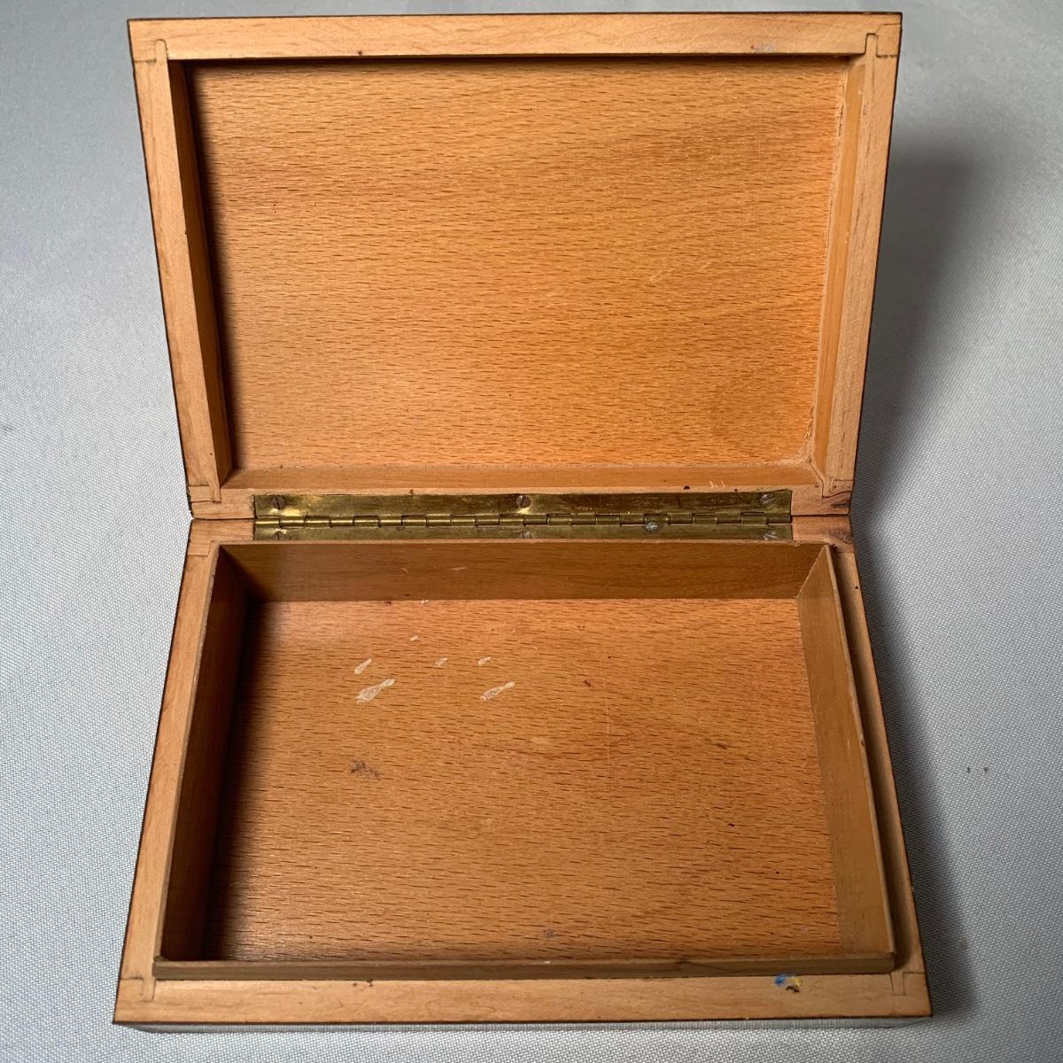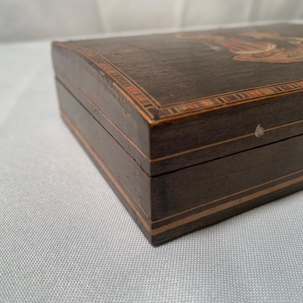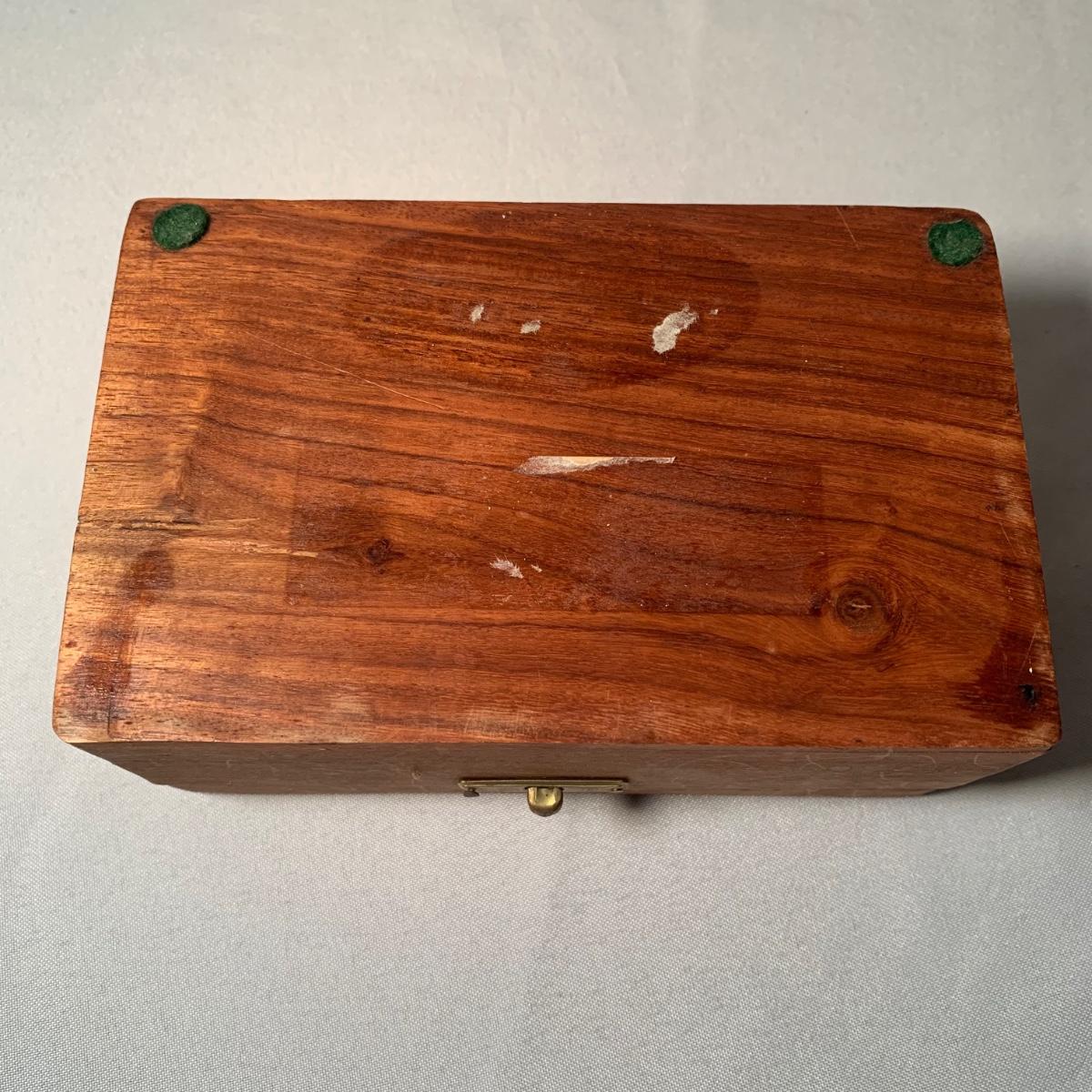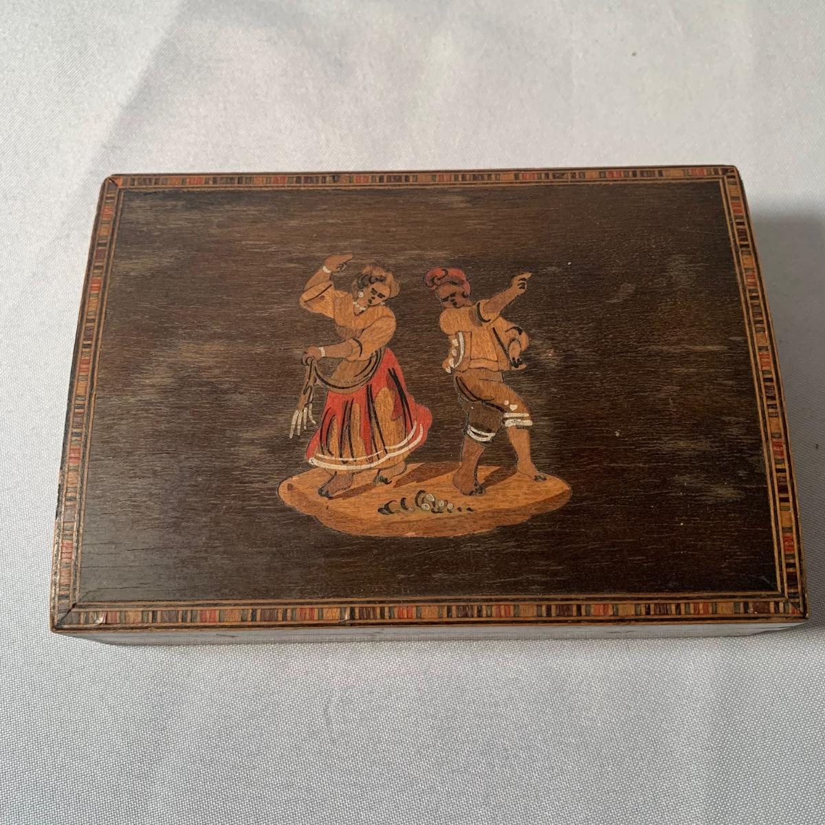 This lot includes two wooden boxes. Smaller box features two dancers within a framed border. Largest is a floral carved wooden box measuring 6.5”L x 4”W x 2.5”H. Larger box is missing the top piece of locking mechanism and needs to be cleaned, otherwise both items are in good condition.