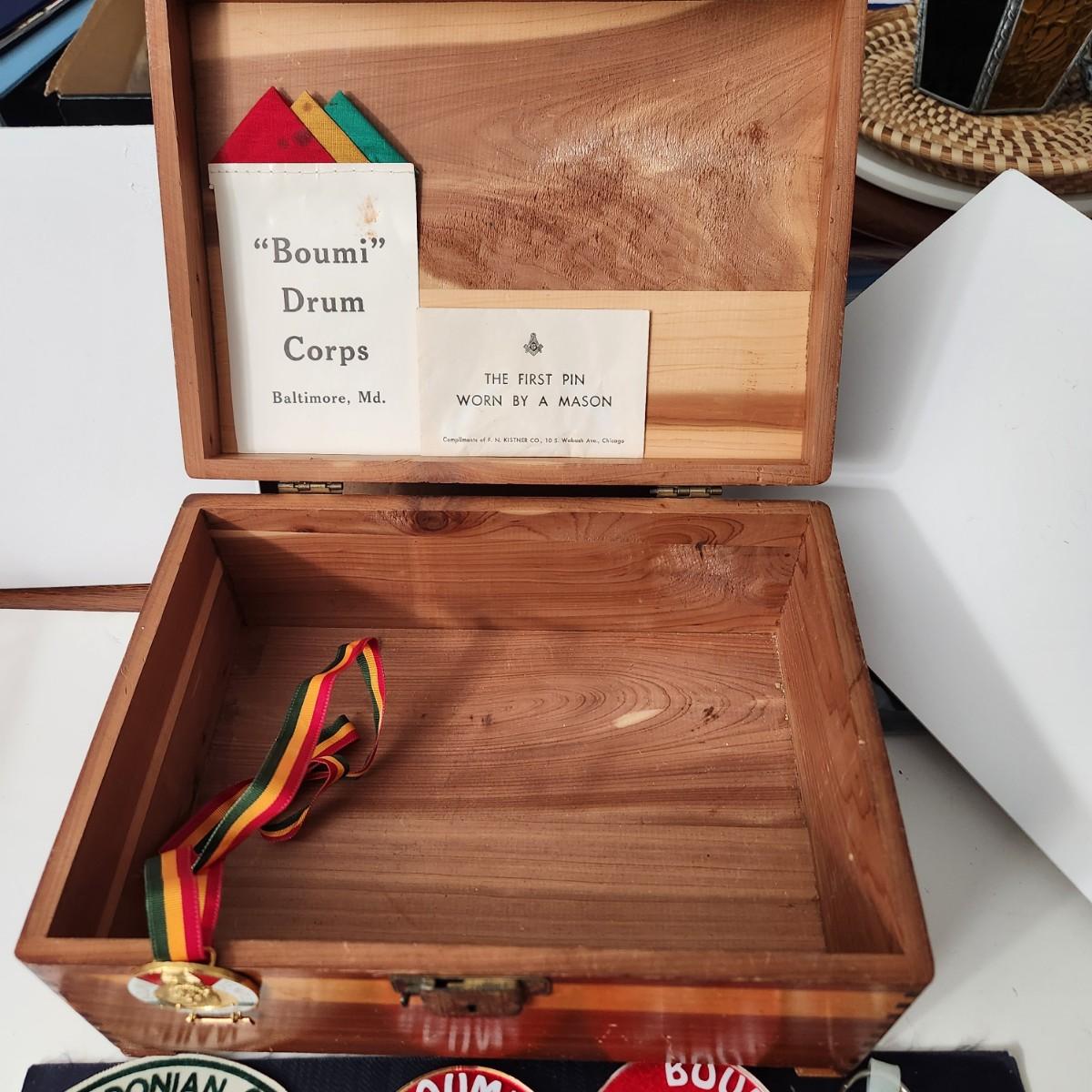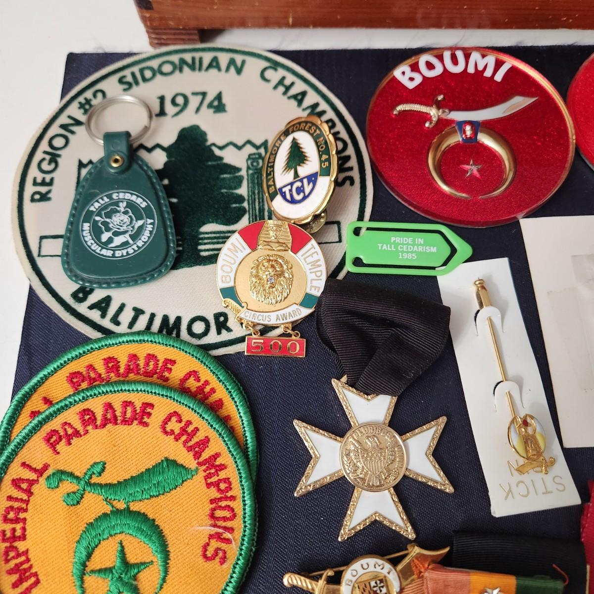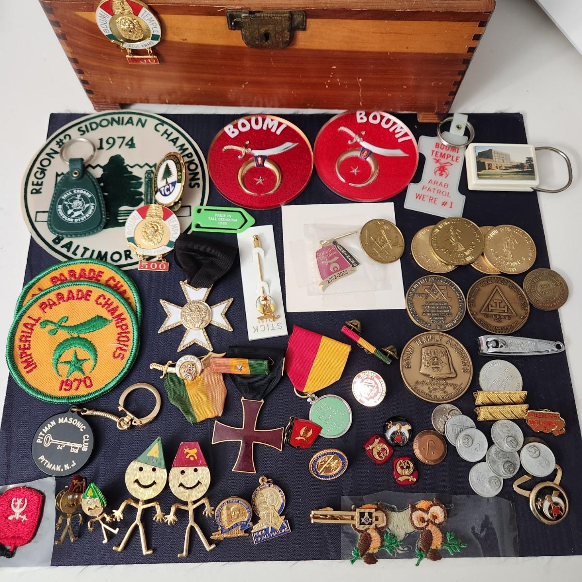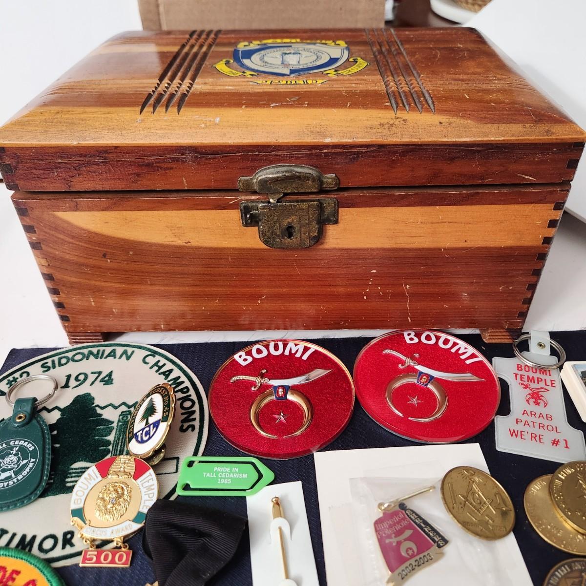 Wooden Box filled with Masonic Boumi Temple Collectibles , Patches , Pins, Coins, Medals