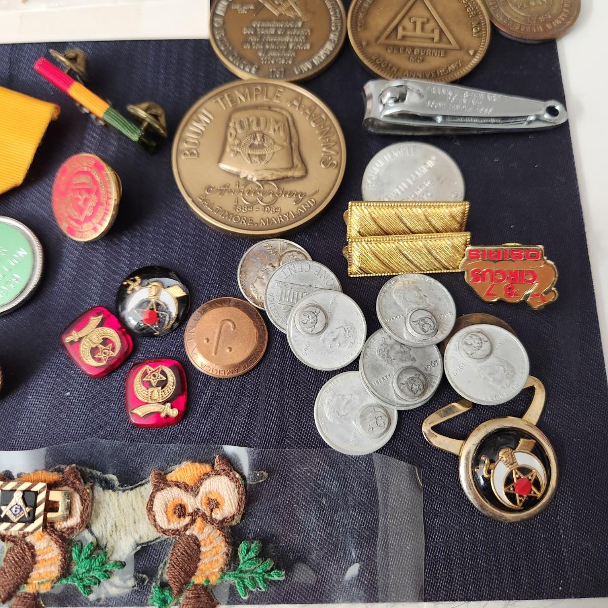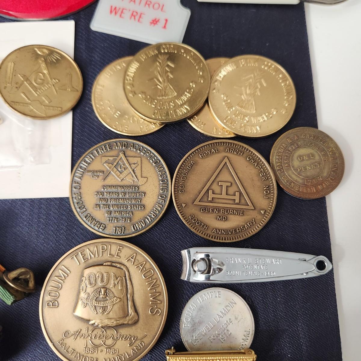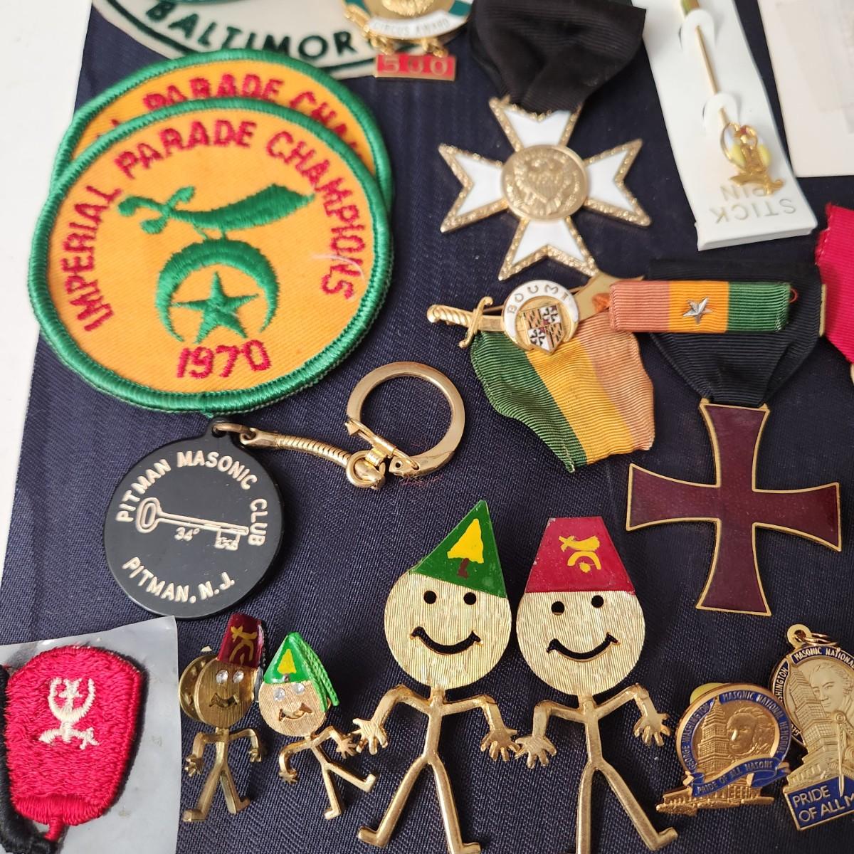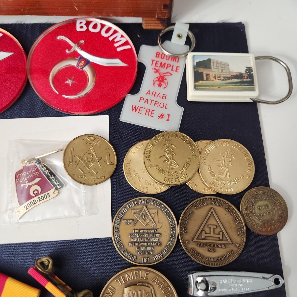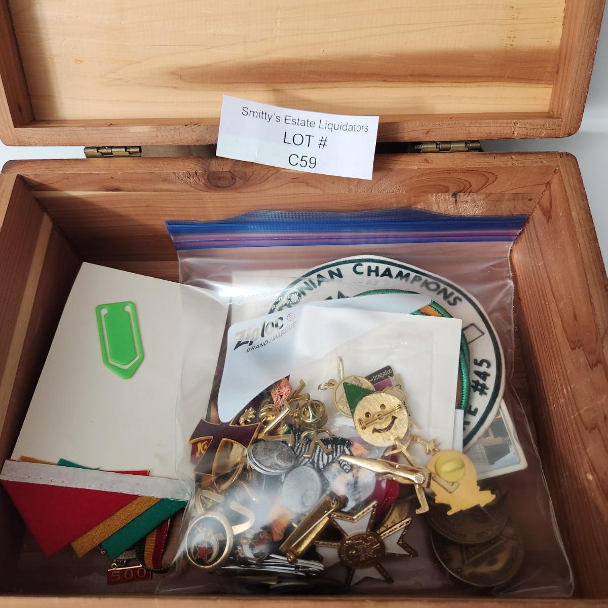 Wooden Box filled with Masonic Boumi Temple Collectibles , Patches , Pins, Coins, Medals