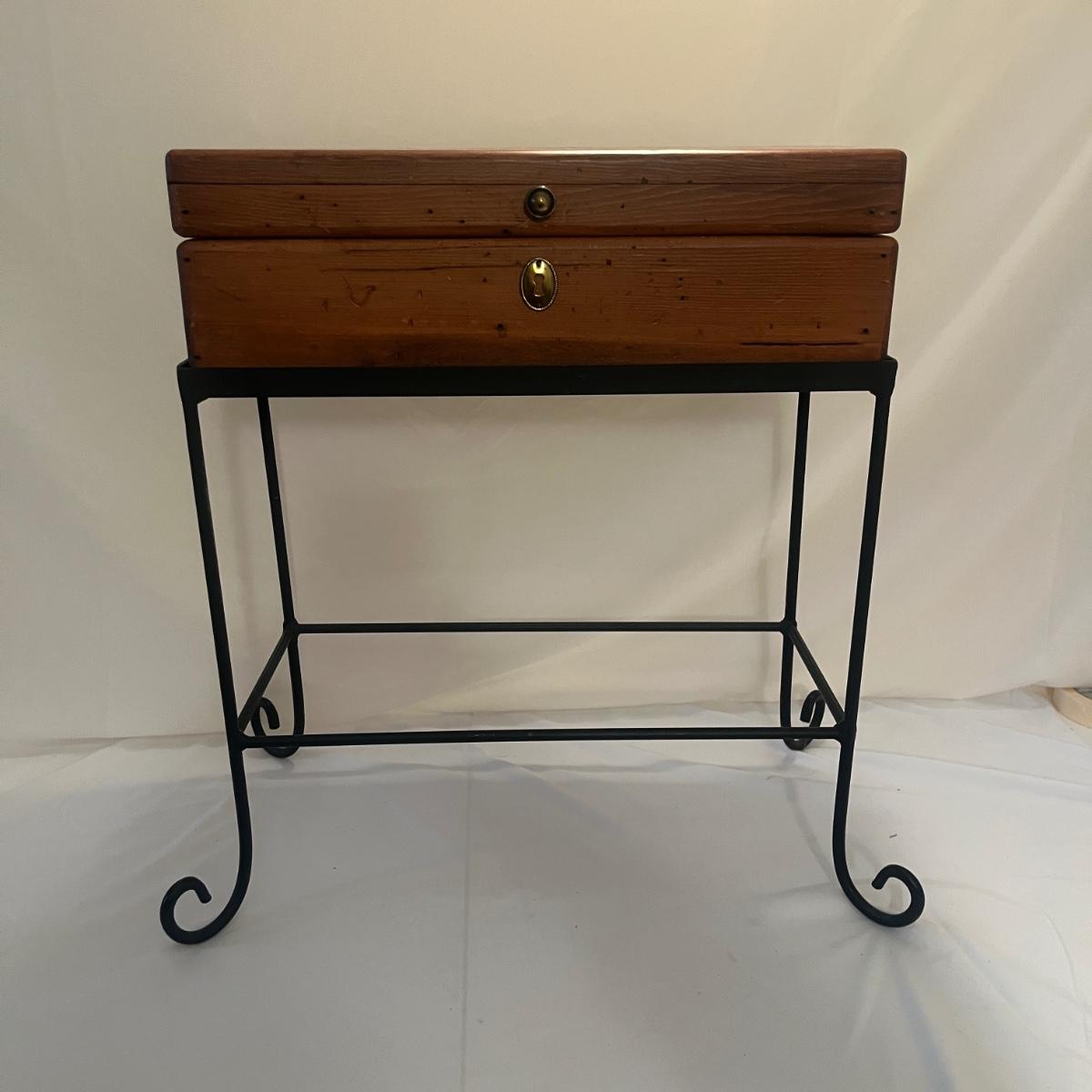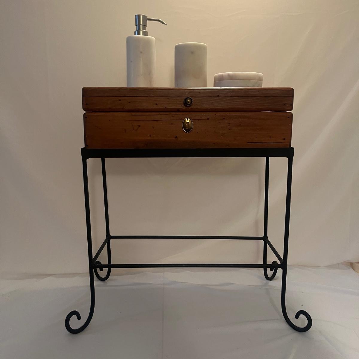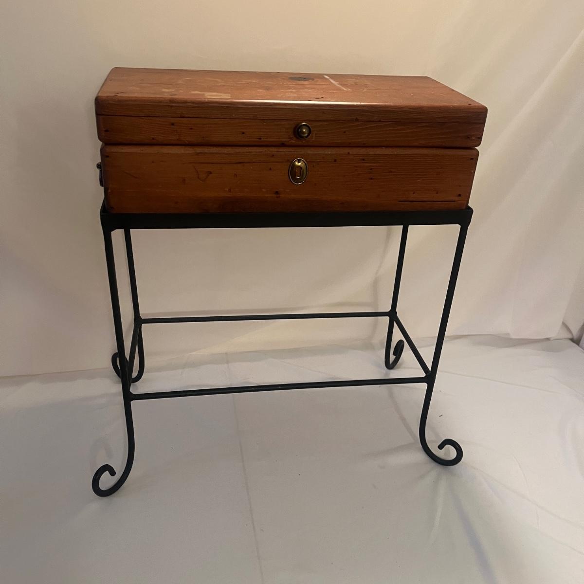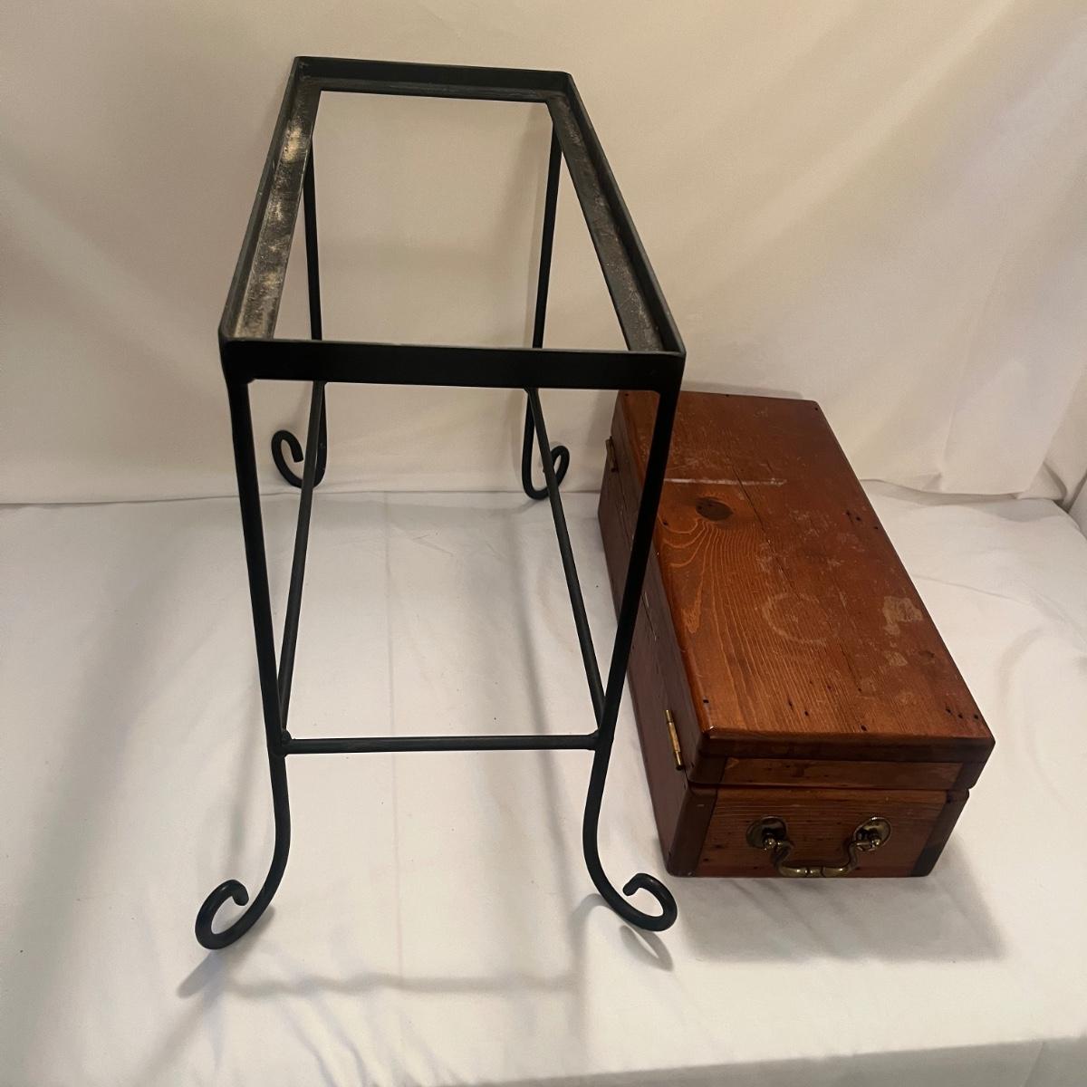 Lot includes a wooden box with hinged lid on an iron stand and a four piece stone bathroom set. Box and stand measure 18.5” x 8.5” x 21.5”H. Box has marks on top, see pictures.
