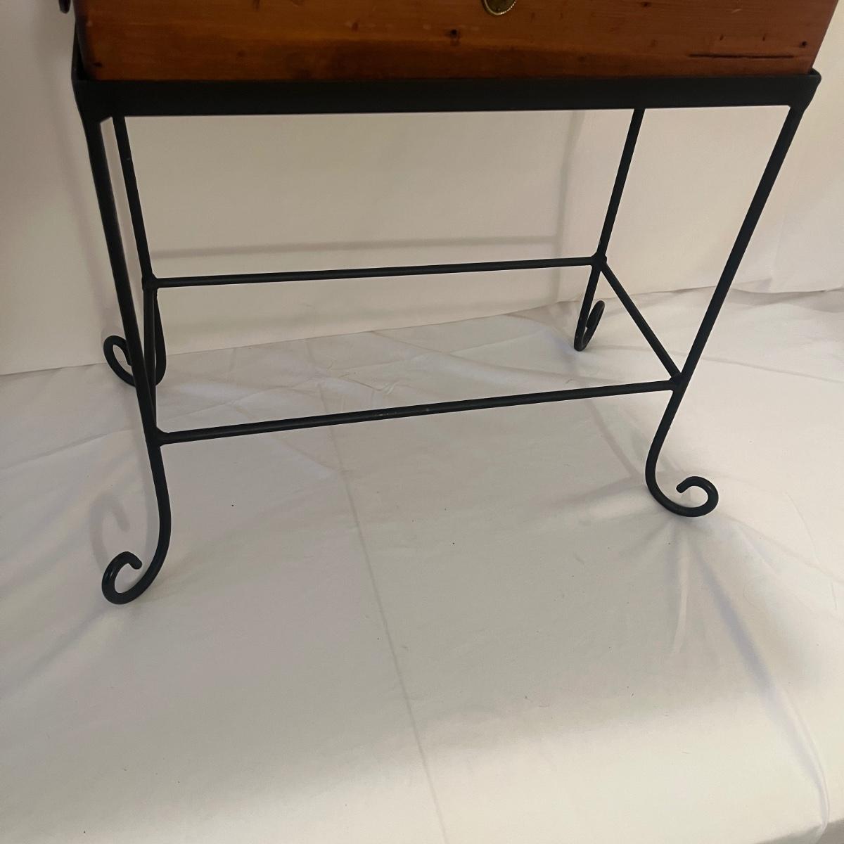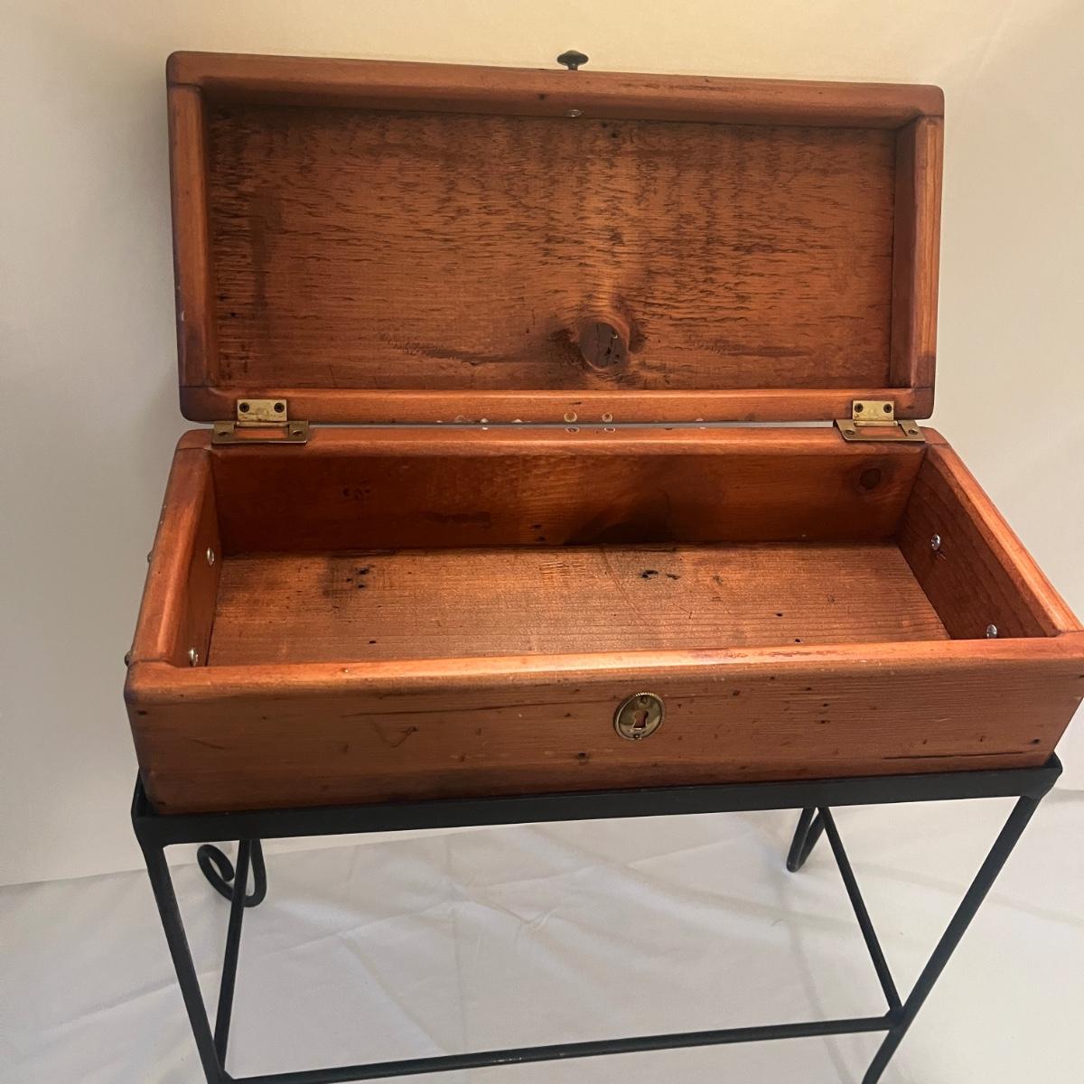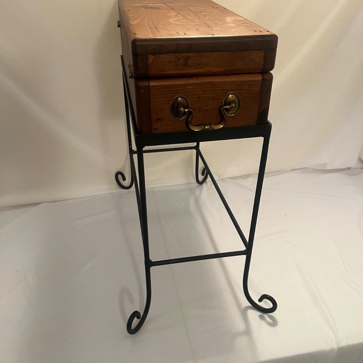 Lot includes a wooden box with hinged lid on an iron stand and a four piece stone bathroom set. Box and stand measure 18.5” x 8.5” x 21.5”H. Box has marks on top, see pictures.