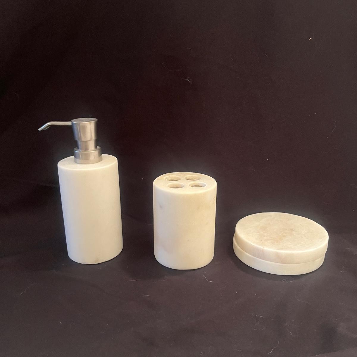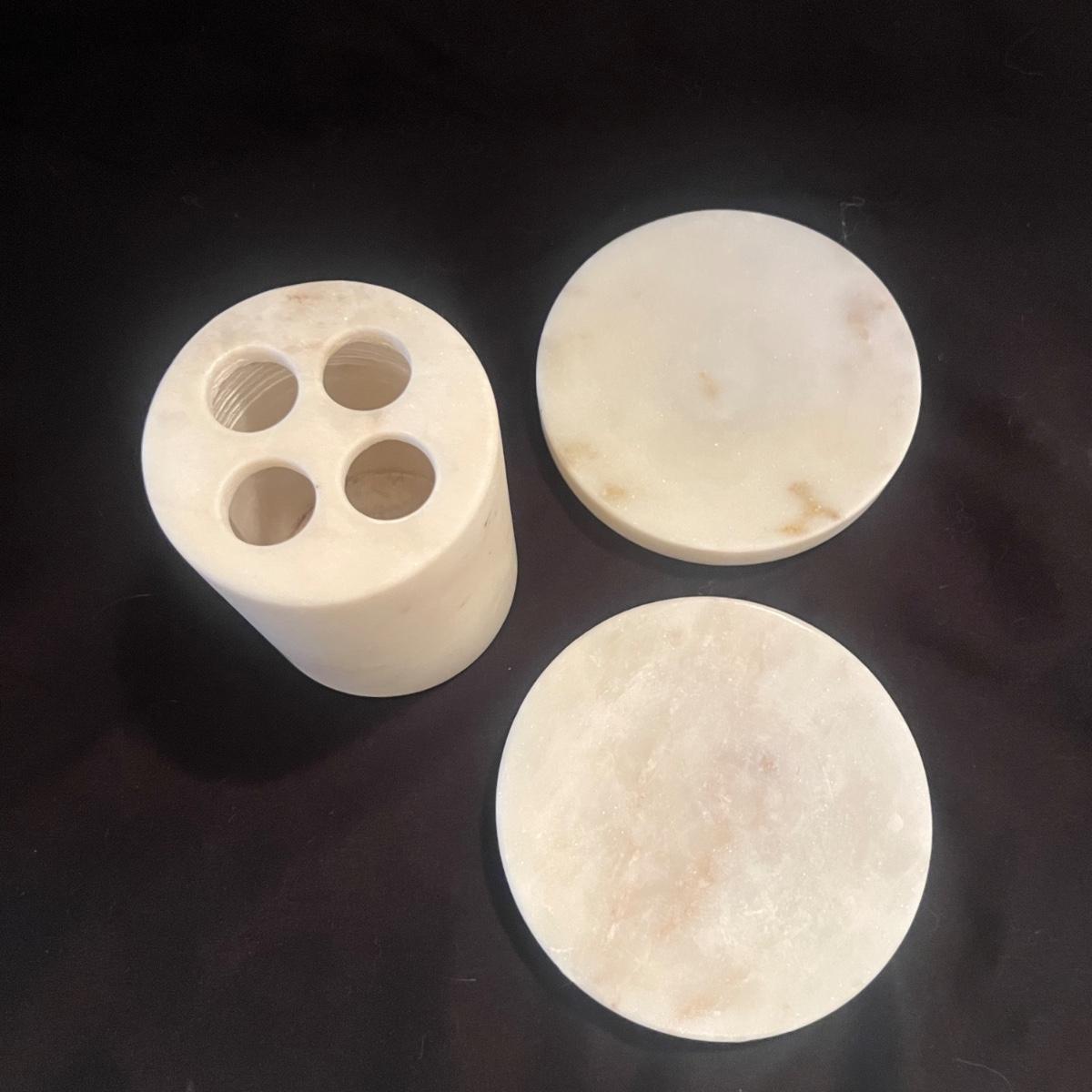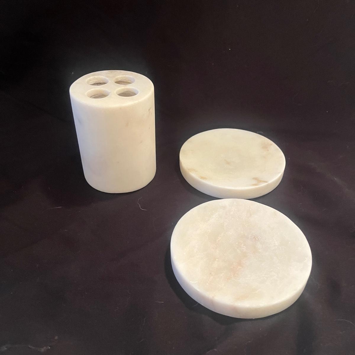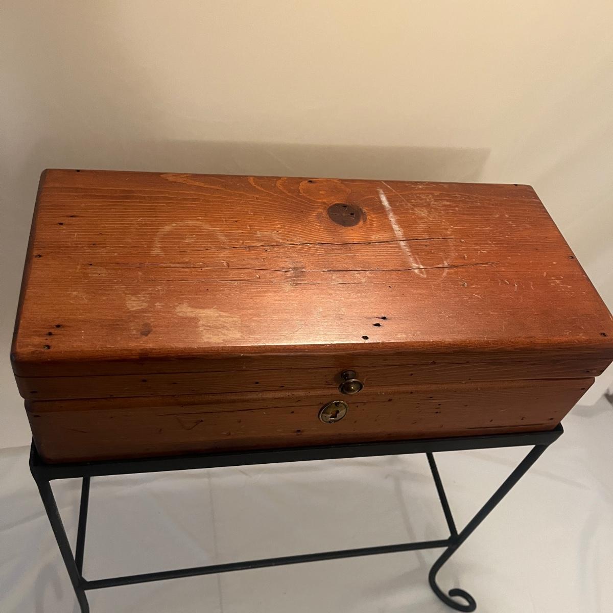 Lot includes a wooden box with hinged lid on an iron stand and a four piece stone bathroom set. Box and stand measure 18.5” x 8.5” x 21.5”H. Box has marks on top, see pictures.