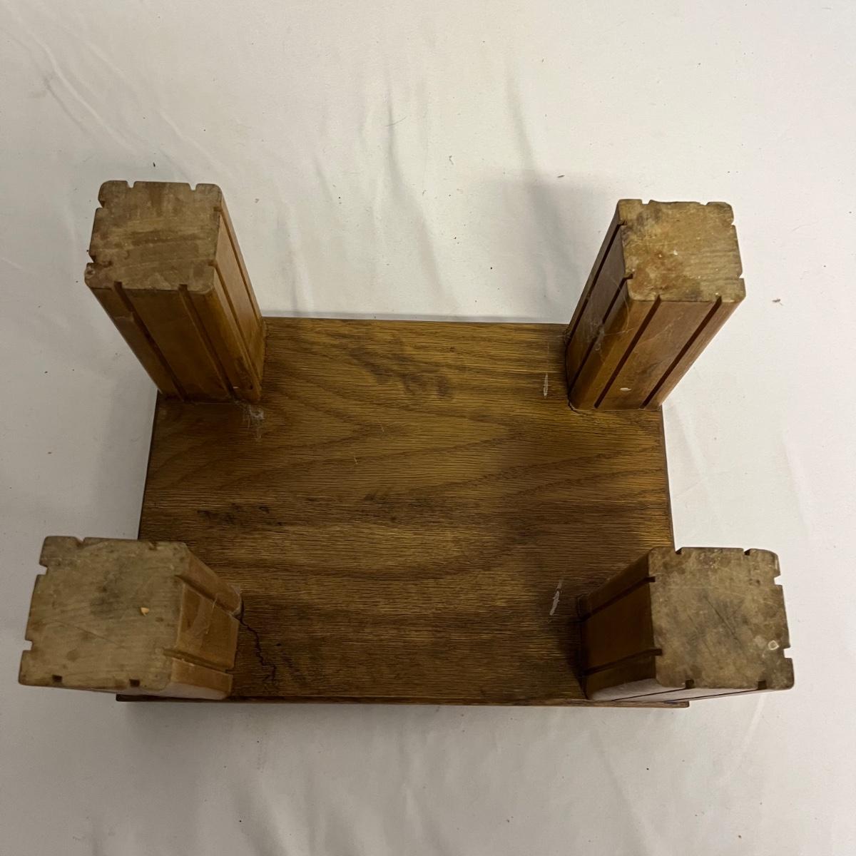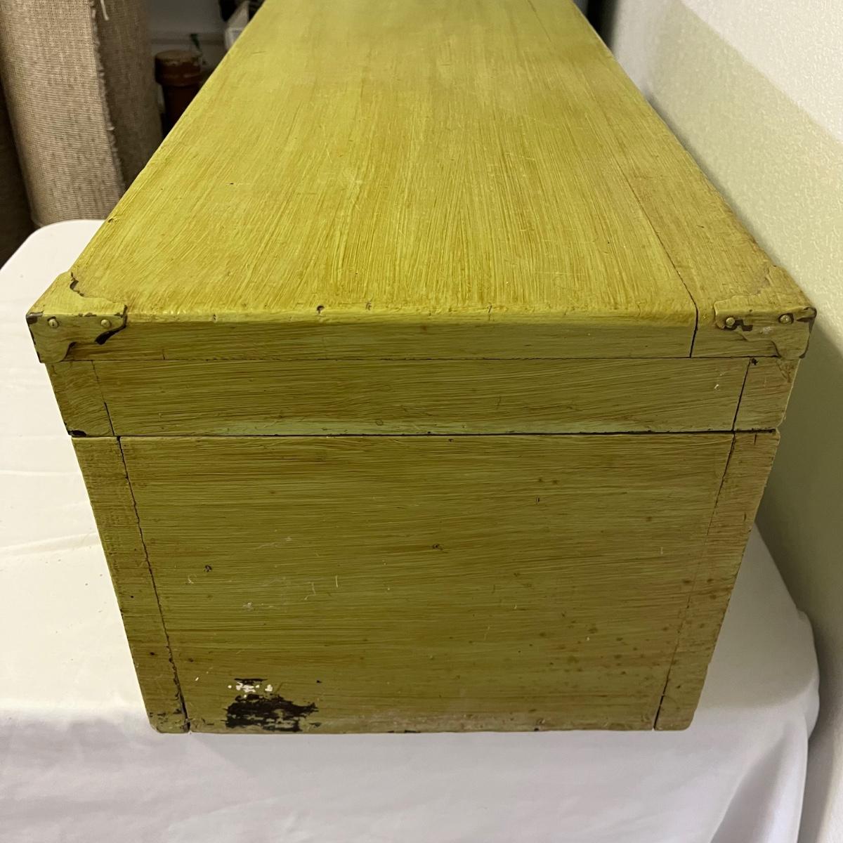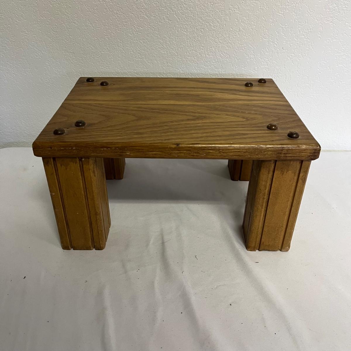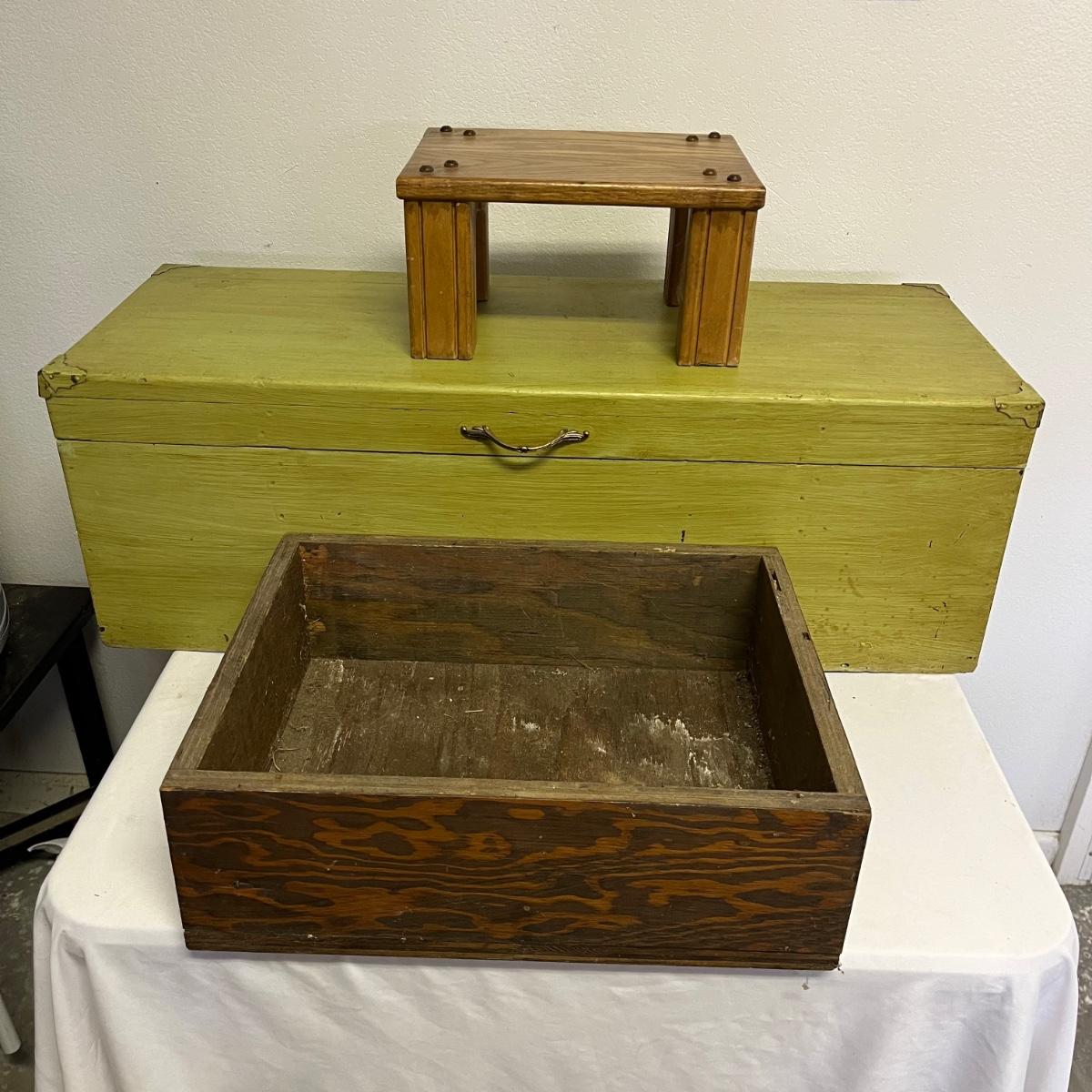 Lot includes a green box with lid, footstool and a box. All items are wood.