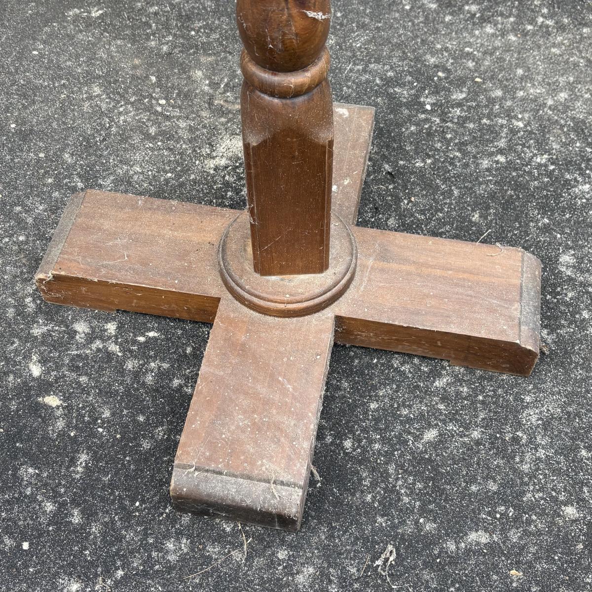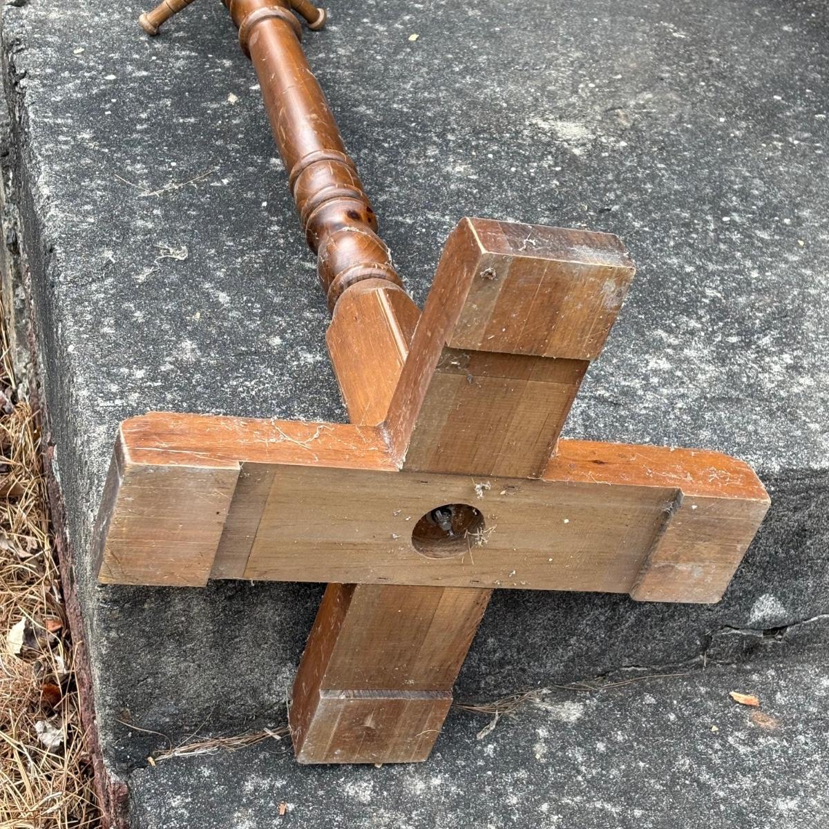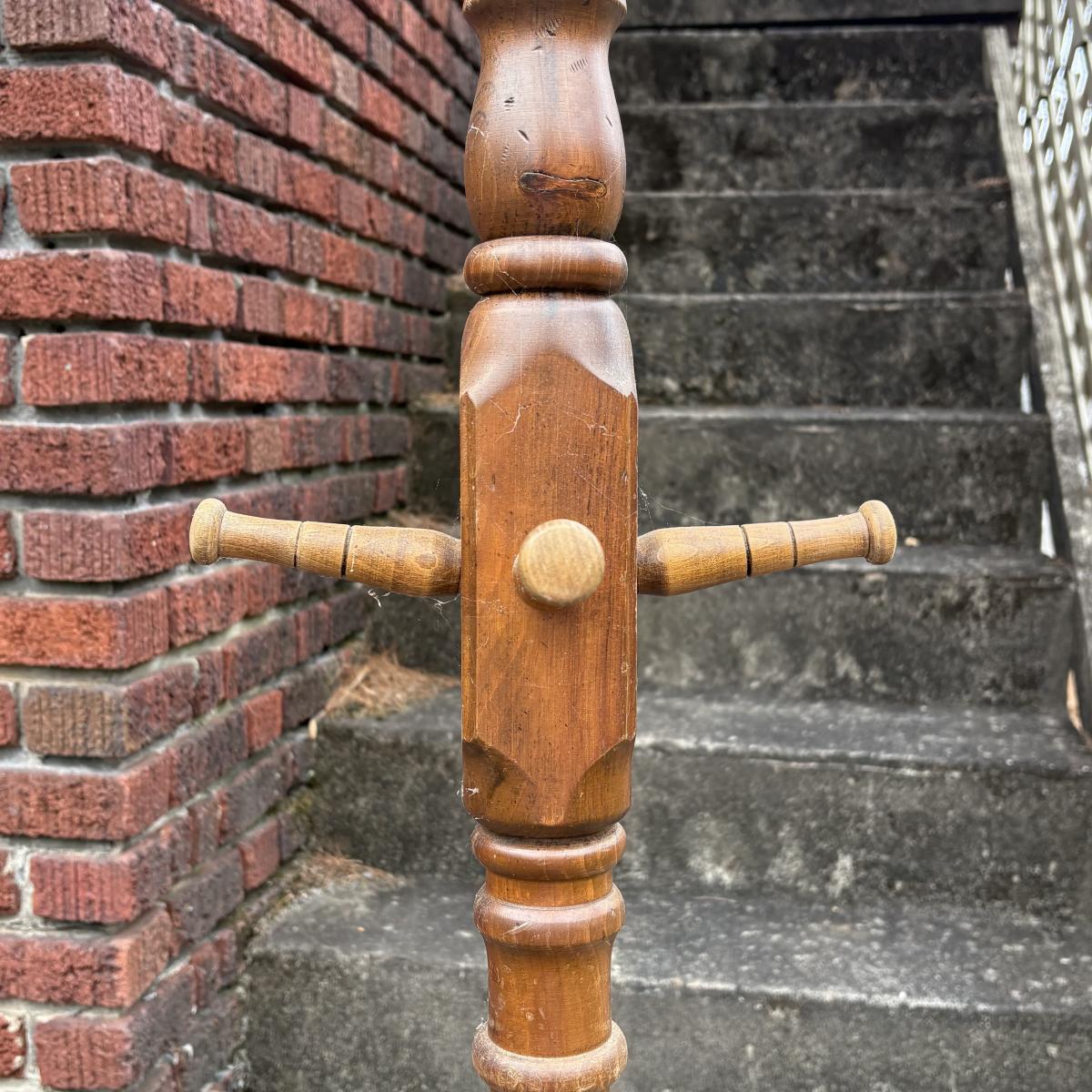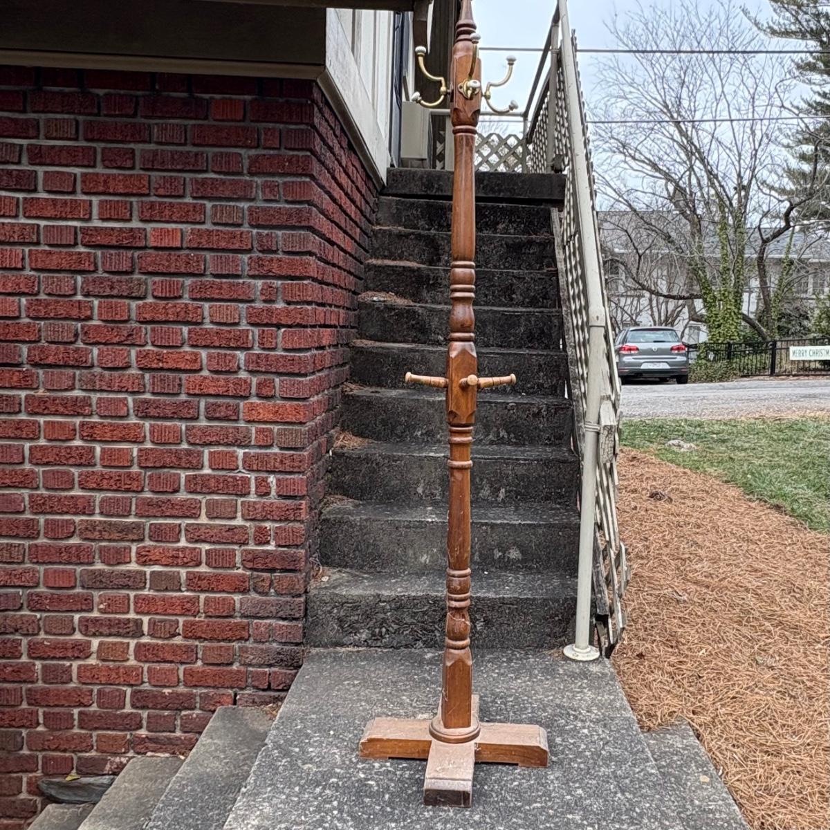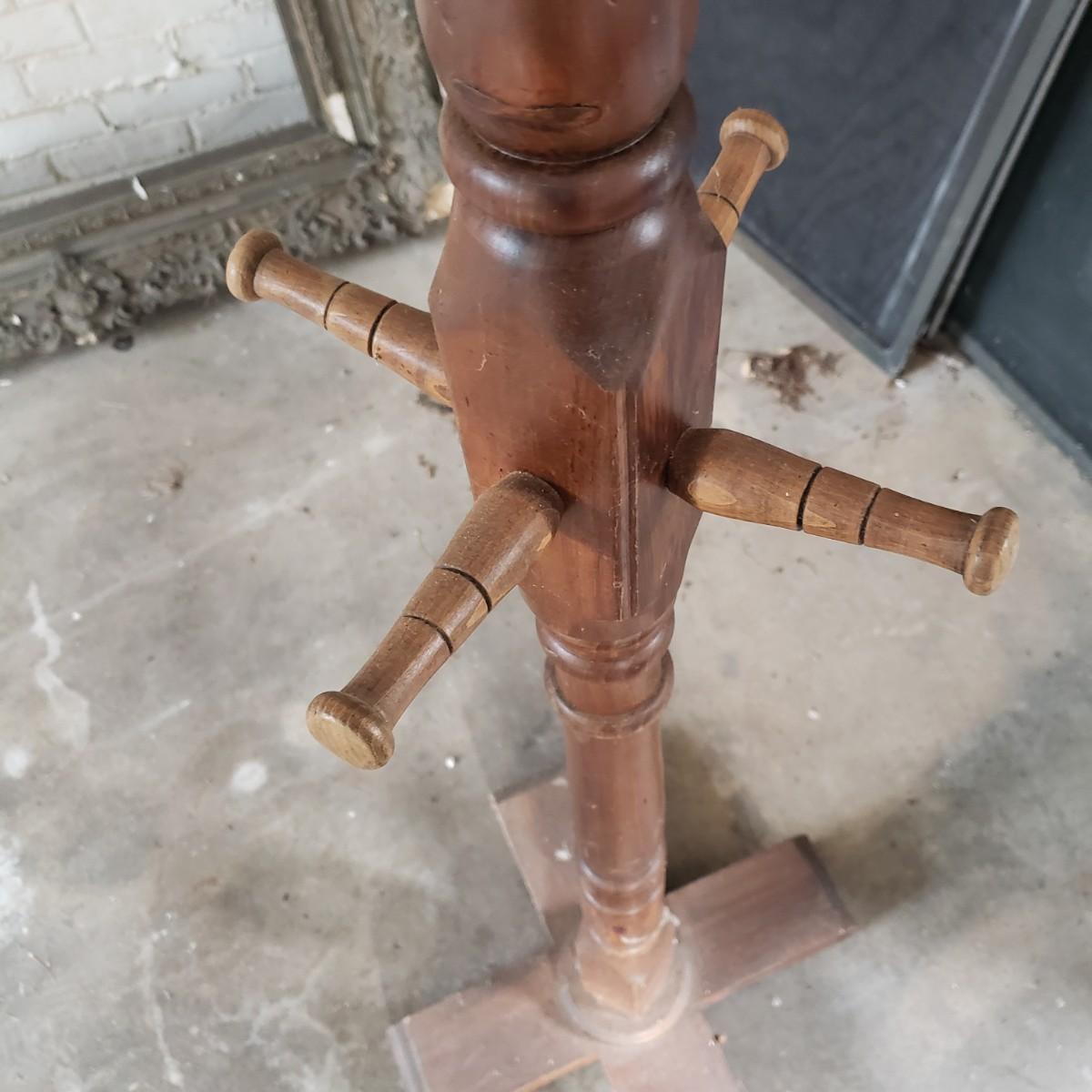 This wooden and brass coat tree has measurements of approximately 18" x 18" x 72"H. See photos for signs of wear. Piece appears sturdy.