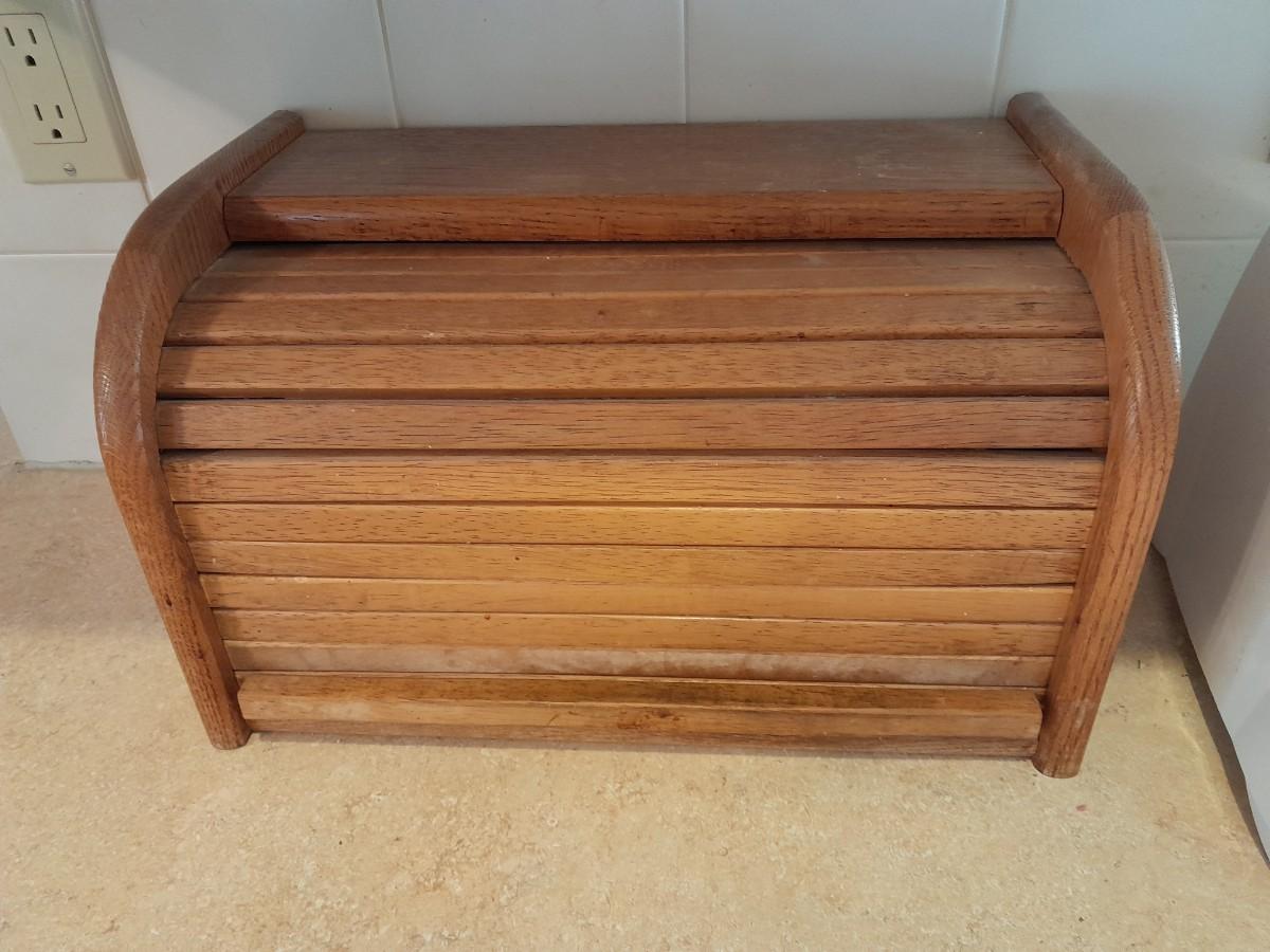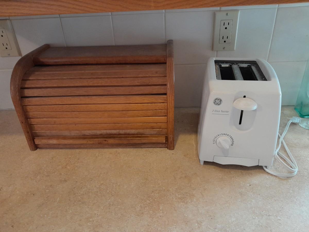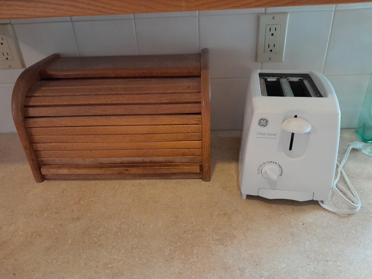 WOODEN BREAD BOX AND GENERAL ELECTRIC TWO SLICE TOASTER