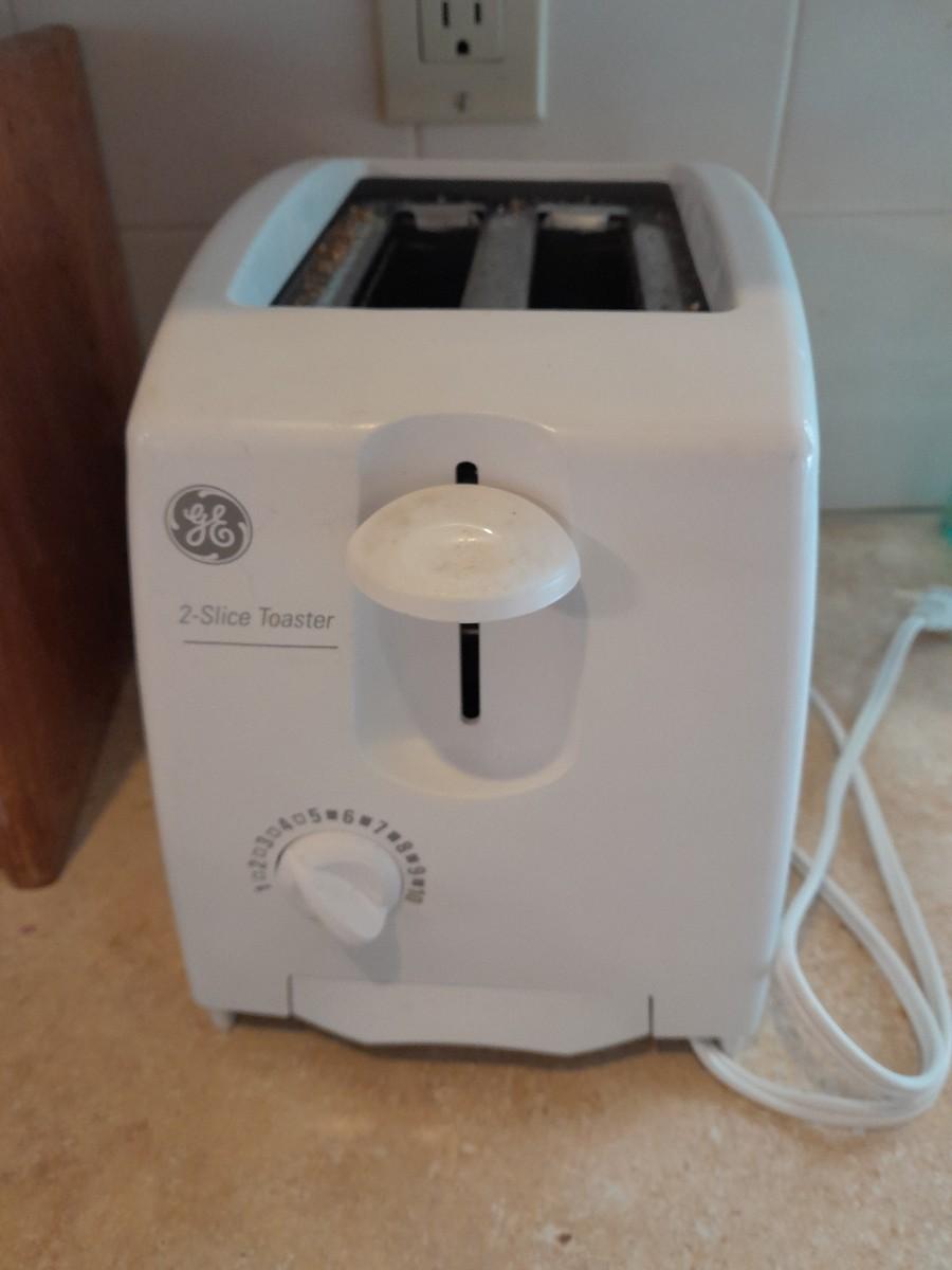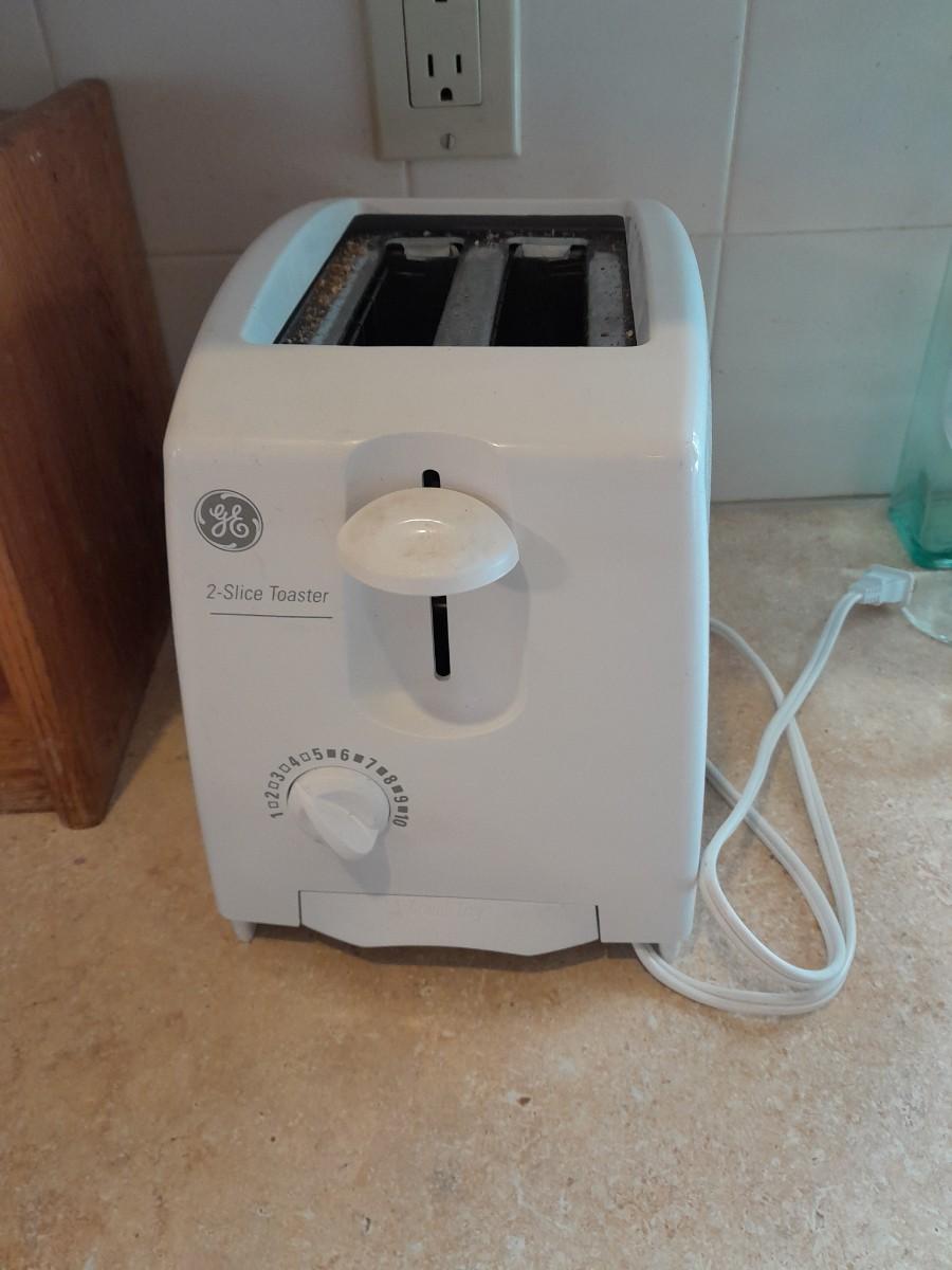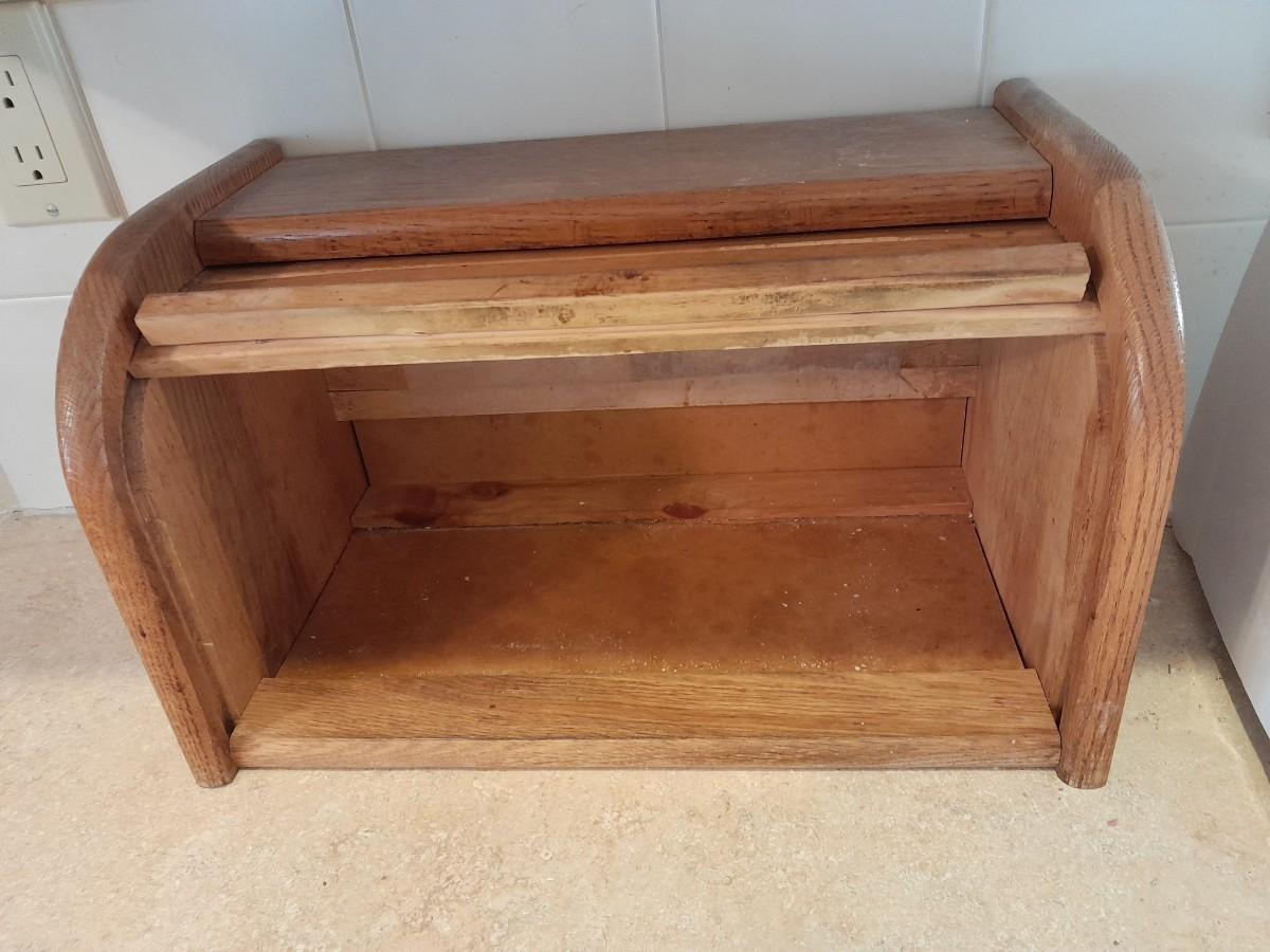 WOODEN BREAD BOX AND GENERAL ELECTRIC TWO SLICE TOASTER