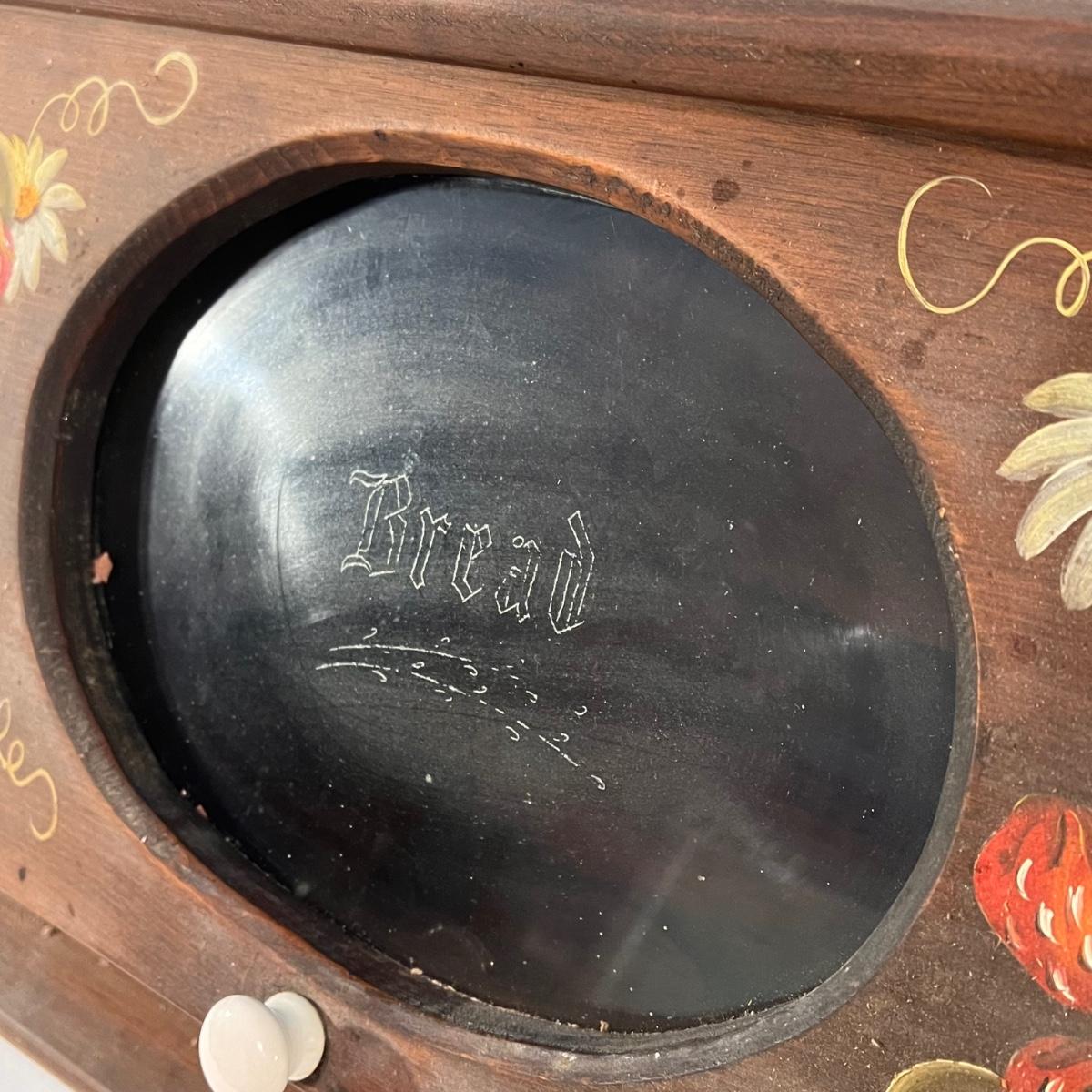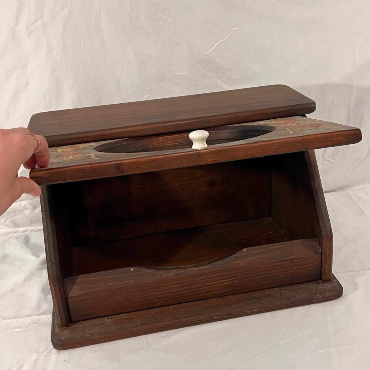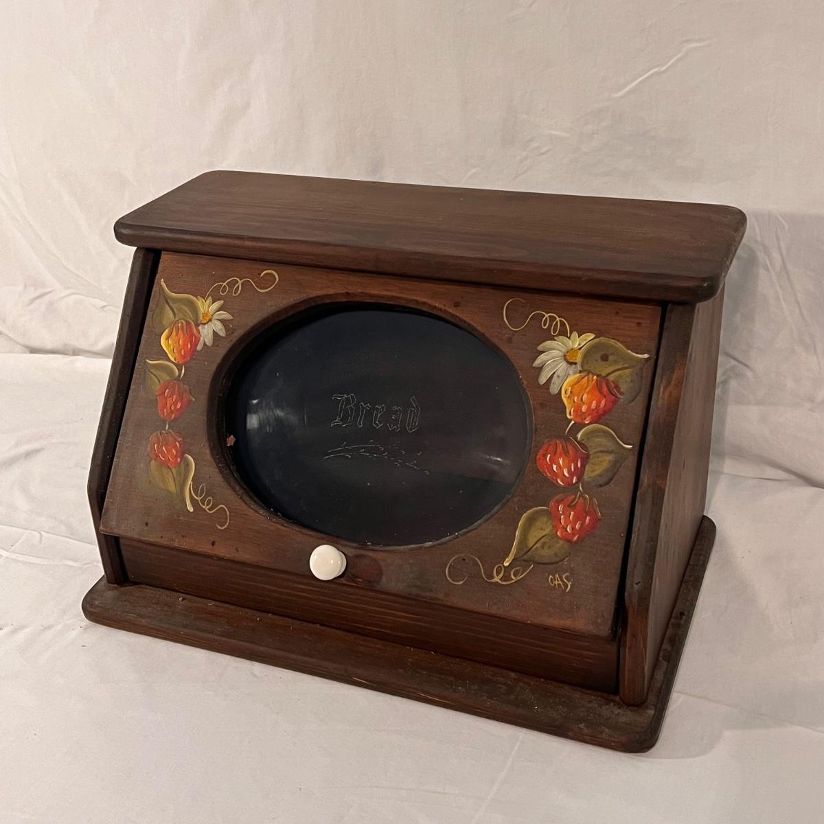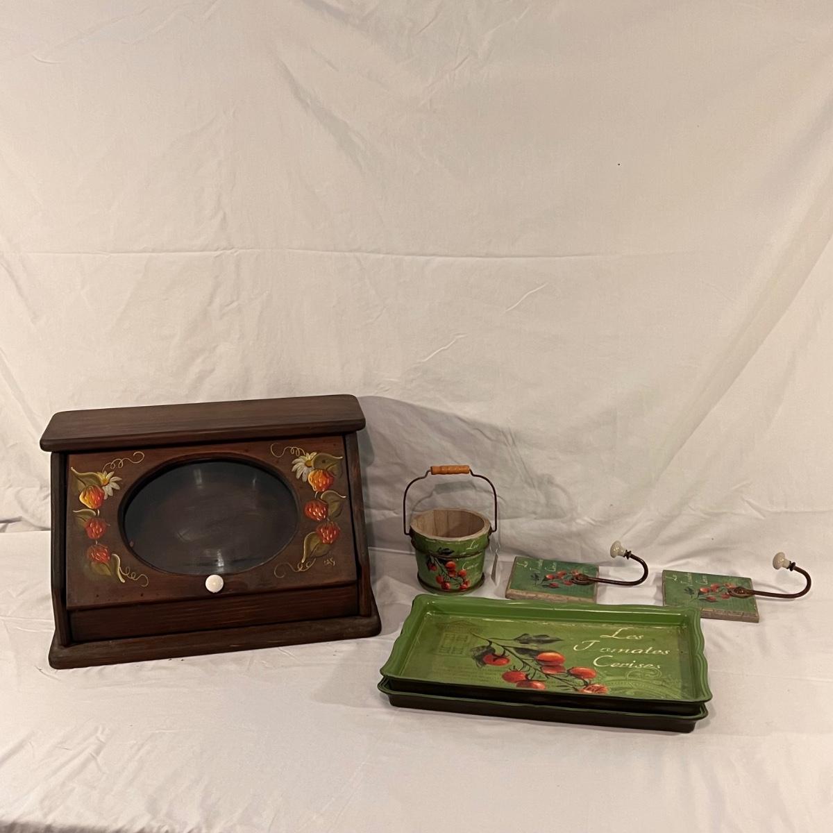 This lot includes one wooden bread box and tomato themed items including trays, a basket, and two wall hooks on a wooden base. The largest item is the wooden bread box that measures 19” x 12” x 11”H. It is hand painted with strawberries and flowers. The tomato themed items are from Hobby Lobby. Shipping available.