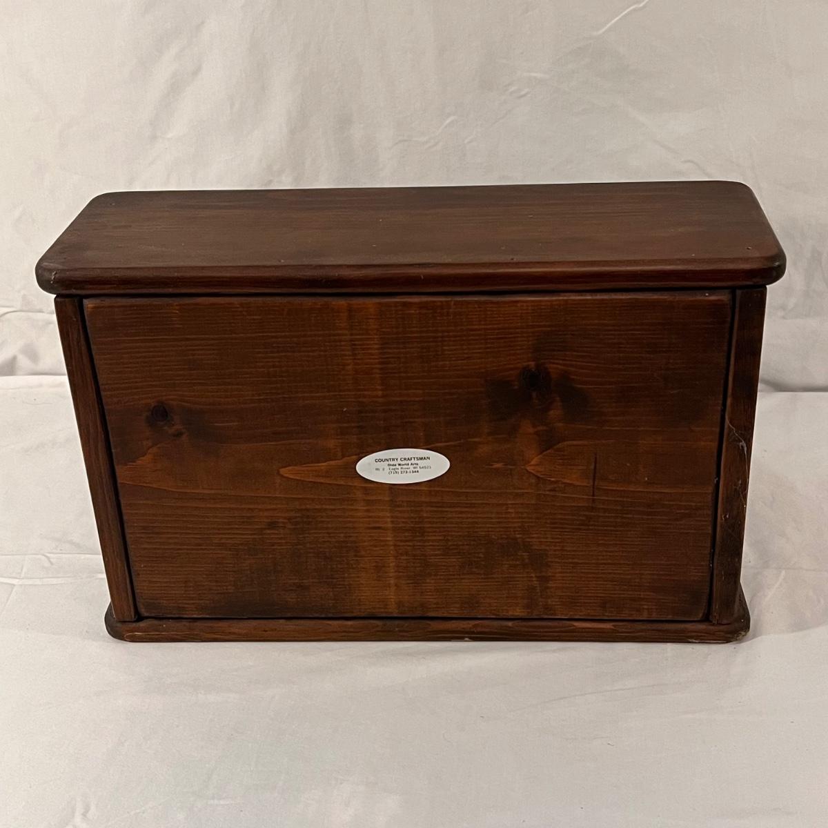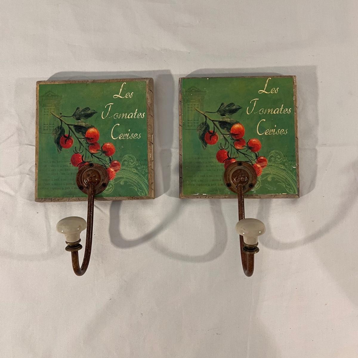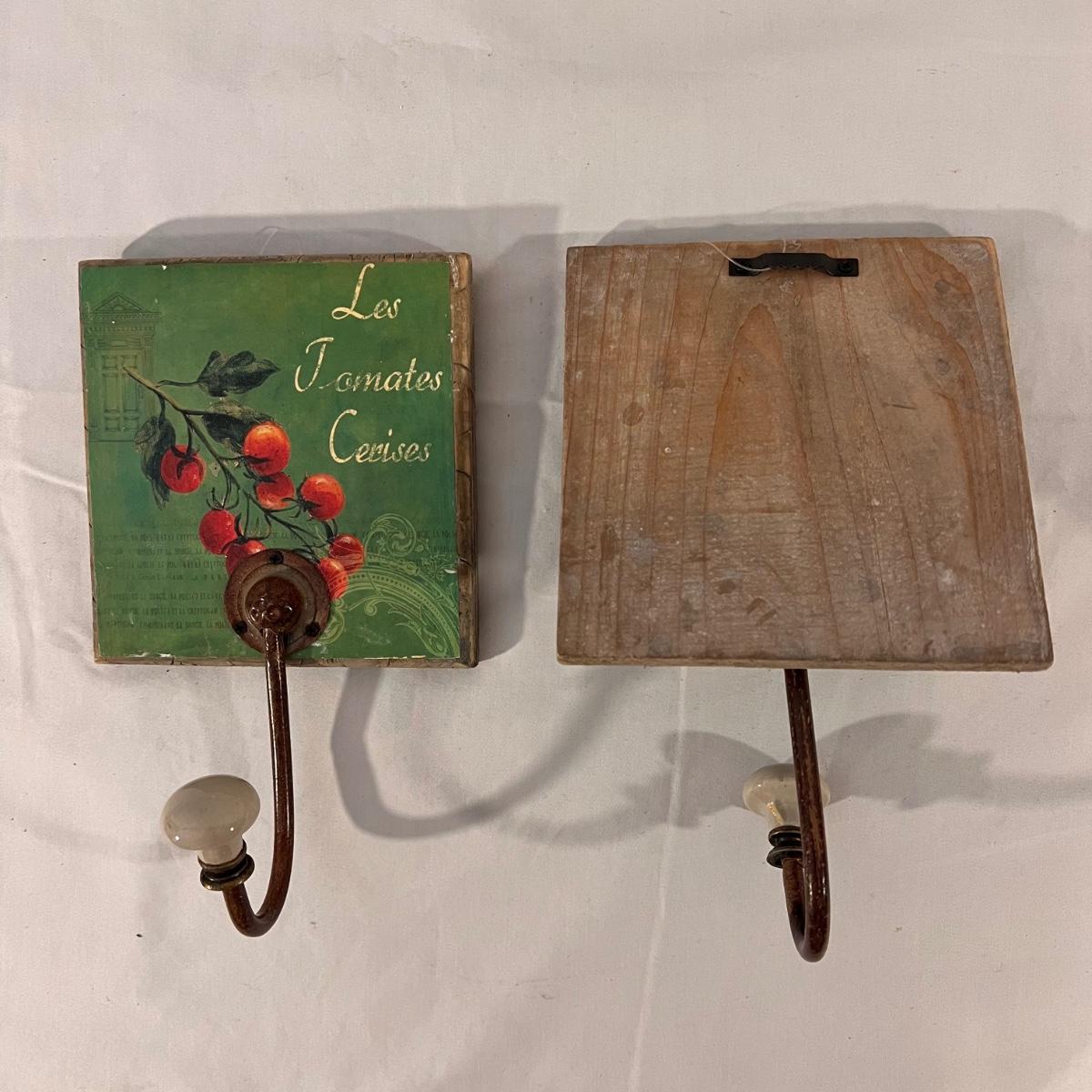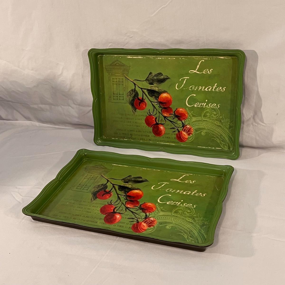 This lot includes one wooden bread box and tomato themed items including trays, a basket, and two wall hooks on a wooden base. The largest item is the wooden bread box that measures 19” x 12” x 11”H. It is hand painted with strawberries and flowers. The tomato themed items are from Hobby Lobby. Shipping available.