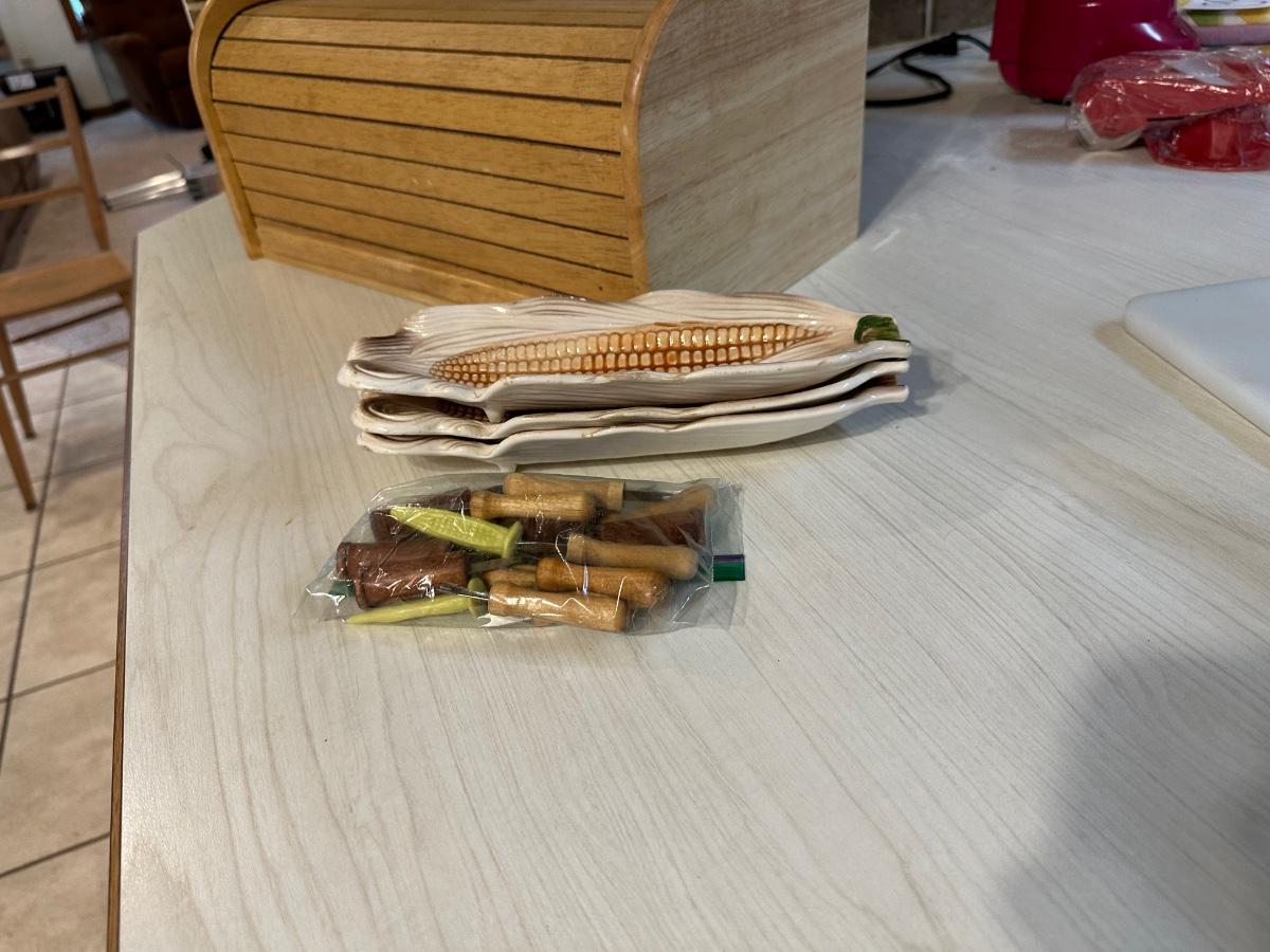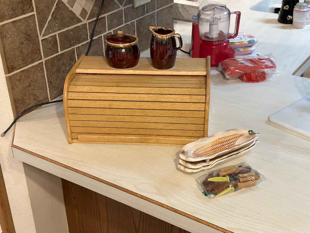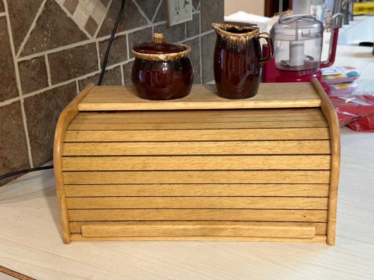 WOODEN BREAD BOX, CREAM AND SUGAR SET & MORE