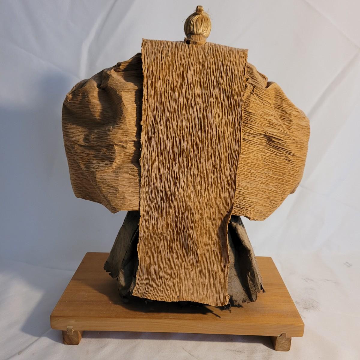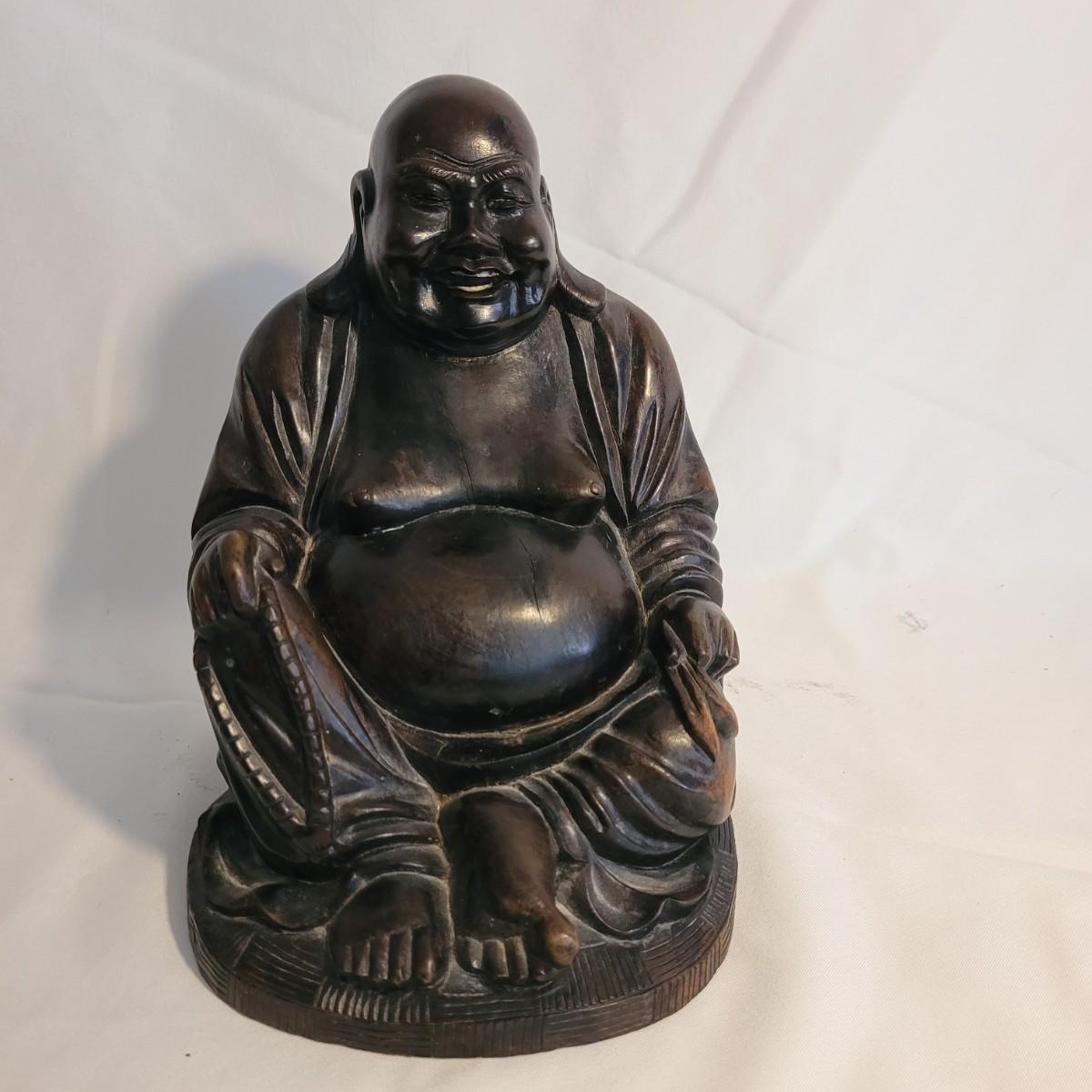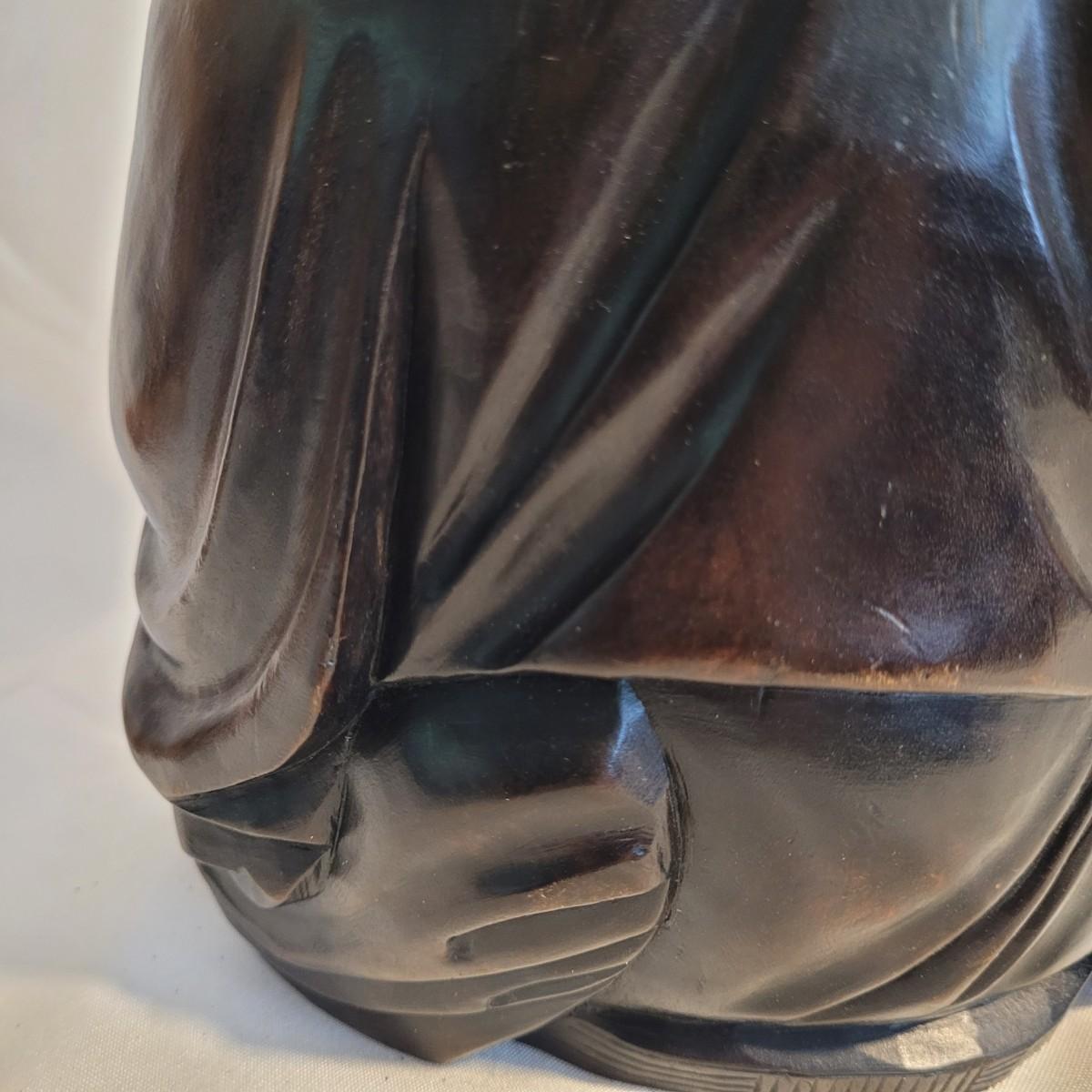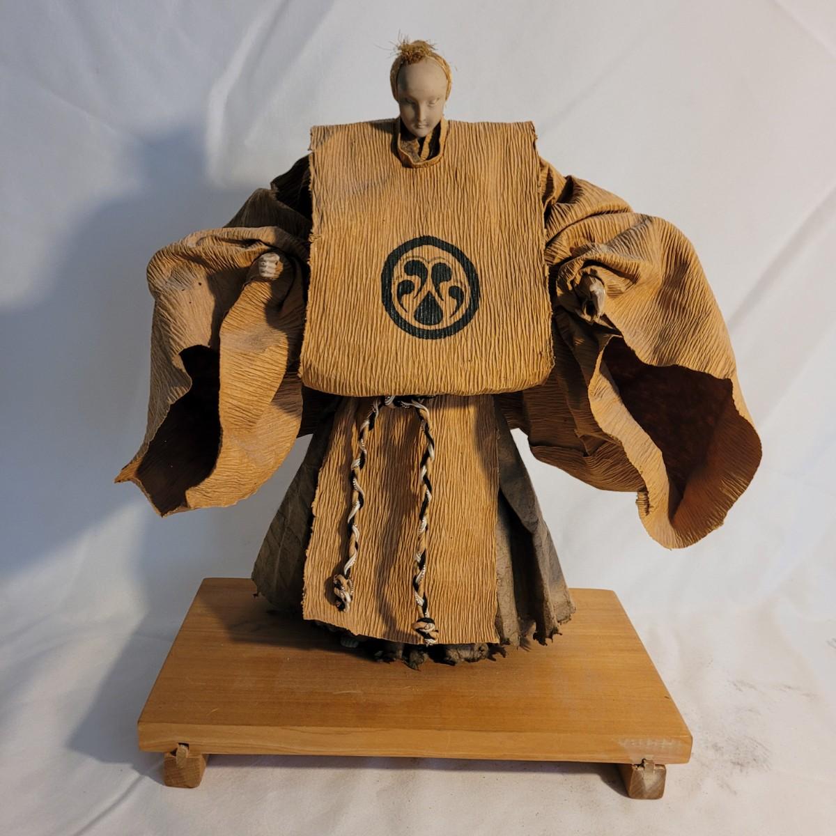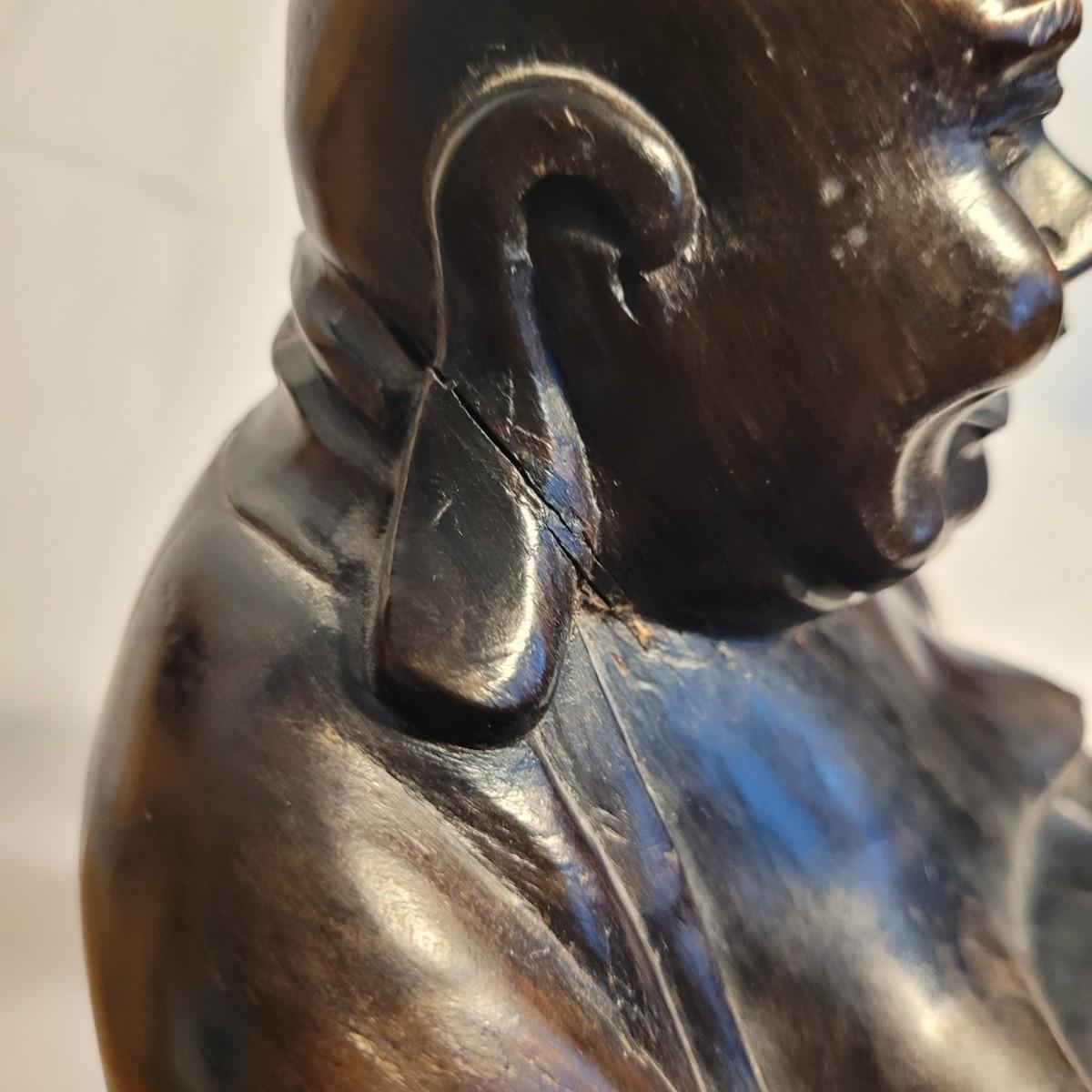 Solid wooden Buddha carved statue in good condition with slight cracking, most noticeable in front across chest and belly, and side by ear. Small nick on head (see photos). Normal accumulation of dust and smudges that can be easily cleaned. Not very heavy. Japanese samurai doll dressed in natural fiber costume. In good condition. Very lightweight. Wooden stand is sturdy. For reference, samurai doll measures approximately 12"L x7"W x16"H (measurements include base). Shipping available.