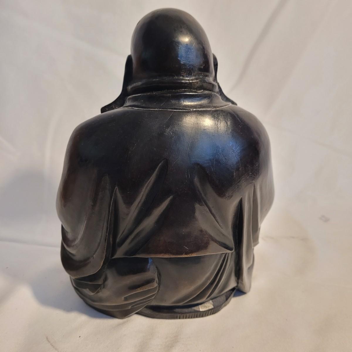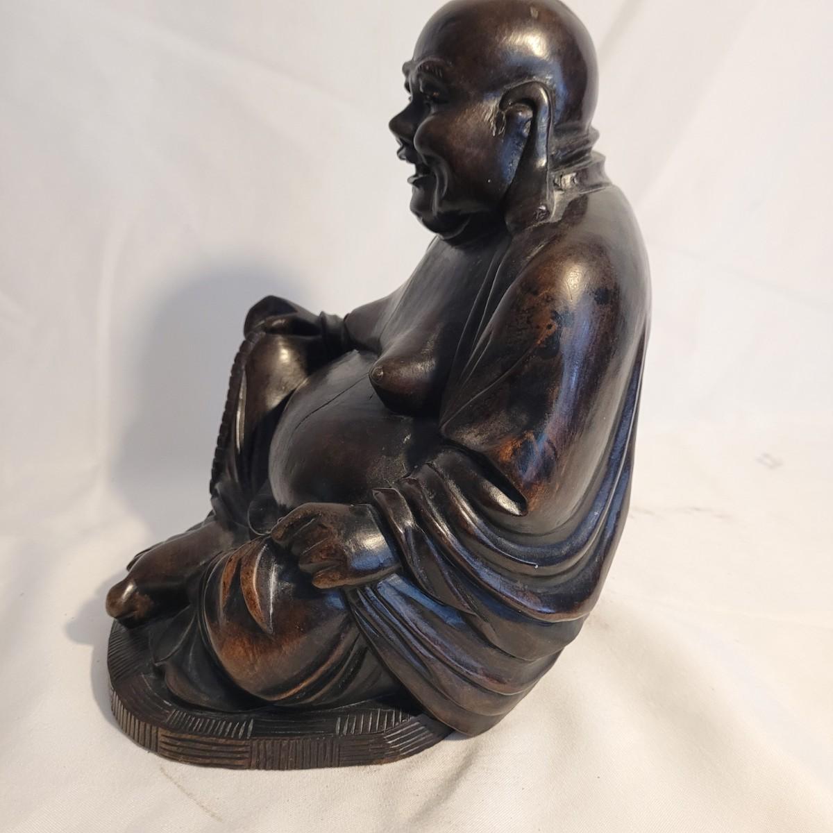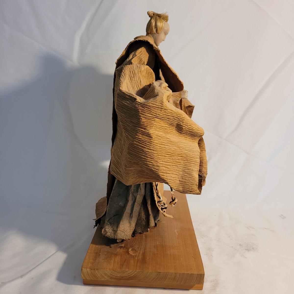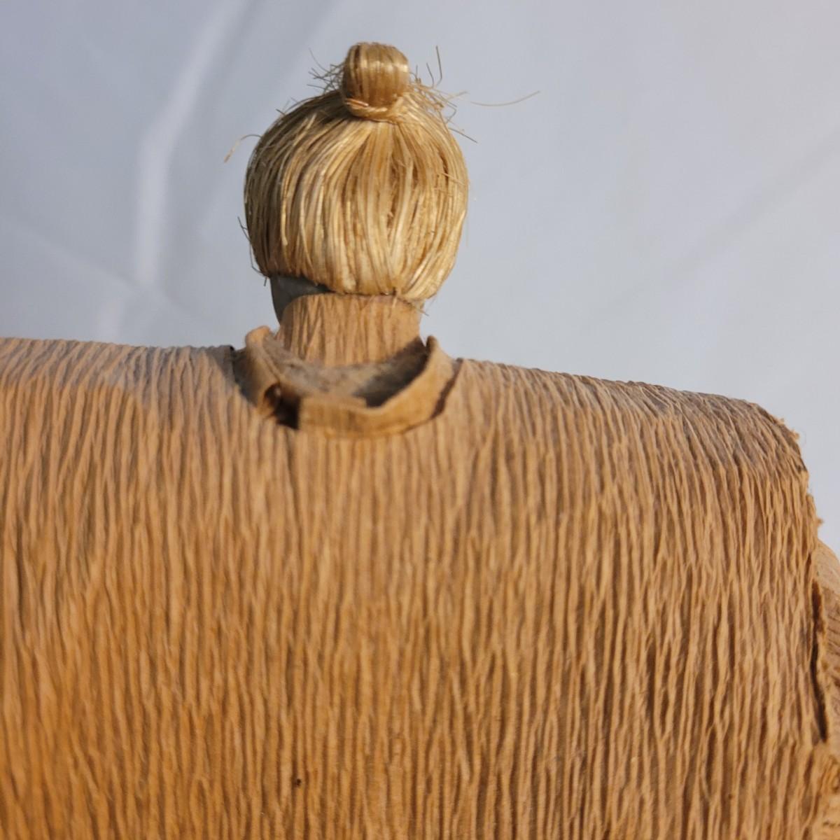 Solid wooden Buddha carved statue in good condition with slight cracking, most noticeable in front across chest and belly, and side by ear. Small nick on head (see photos). Normal accumulation of dust and smudges that can be easily cleaned. Not very heavy. Japanese samurai doll dressed in natural fiber costume. In good condition. Very lightweight. Wooden stand is sturdy. For reference, samurai doll measures approximately 12"L x7"W x16"H (measurements include base). Shipping available.