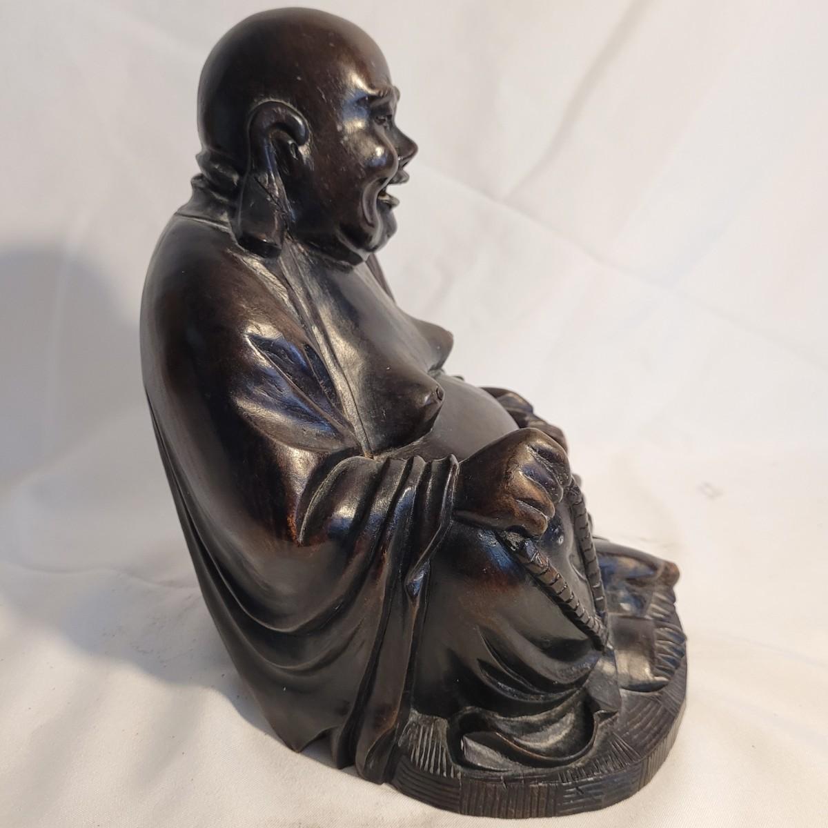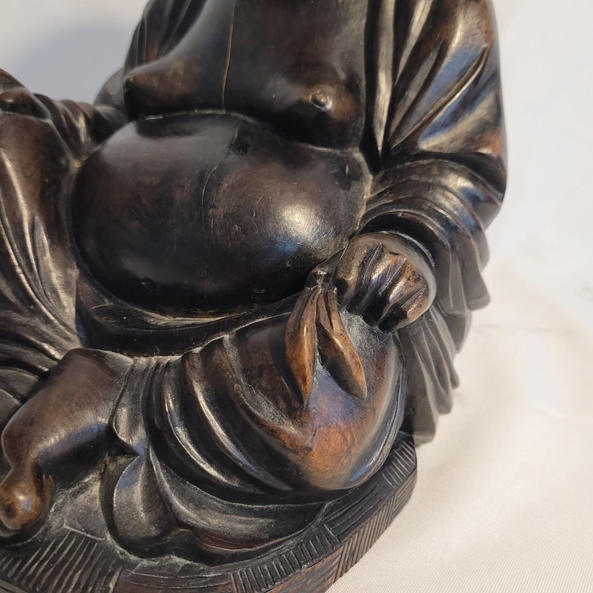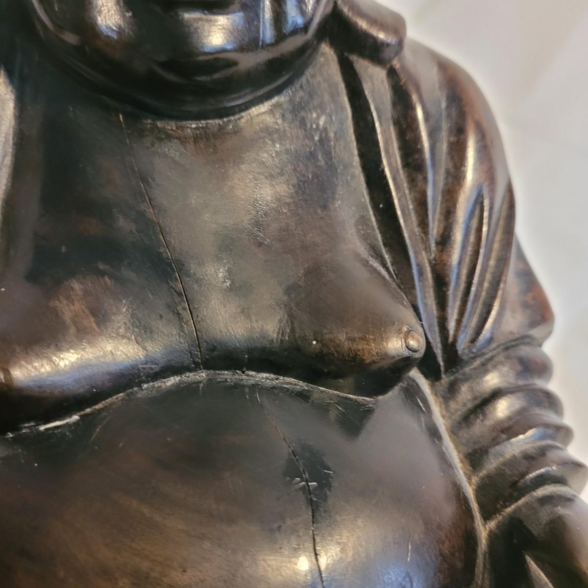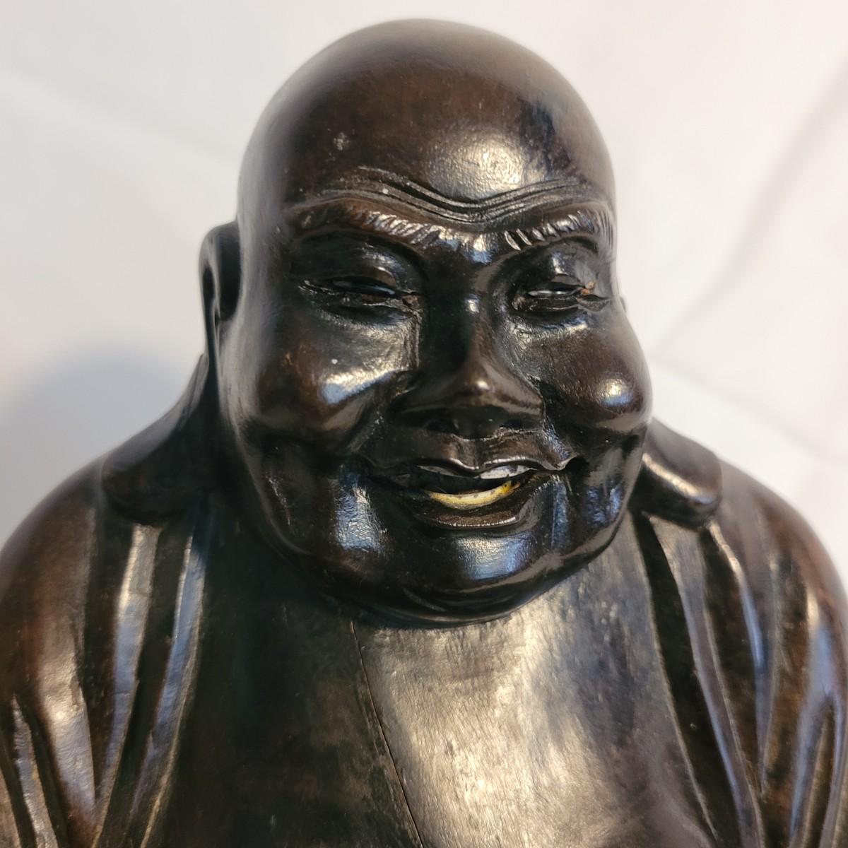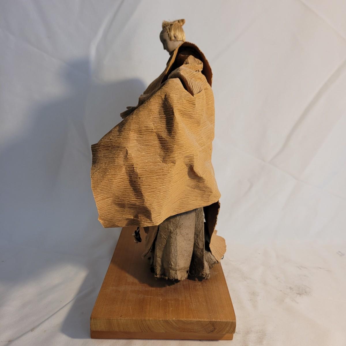 Solid wooden Buddha carved statue in good condition with slight cracking, most noticeable in front across chest and belly, and side by ear. Small nick on head (see photos). Normal accumulation of dust and smudges that can be easily cleaned. Not very heavy. Japanese samurai doll dressed in natural fiber costume. In good condition. Very lightweight. Wooden stand is sturdy. For reference, samurai doll measures approximately 12"L x7"W x16"H (measurements include base). Shipping available.