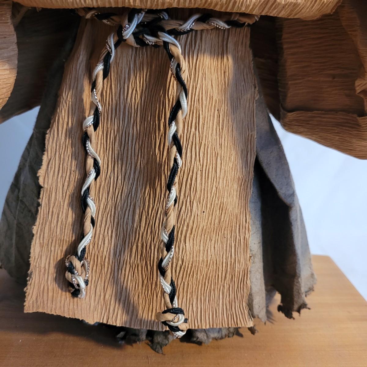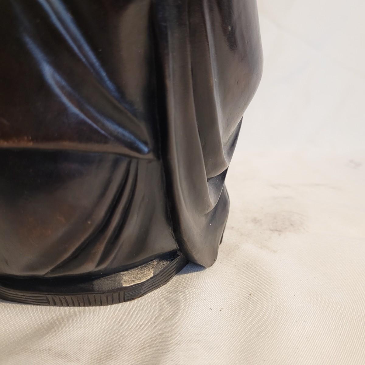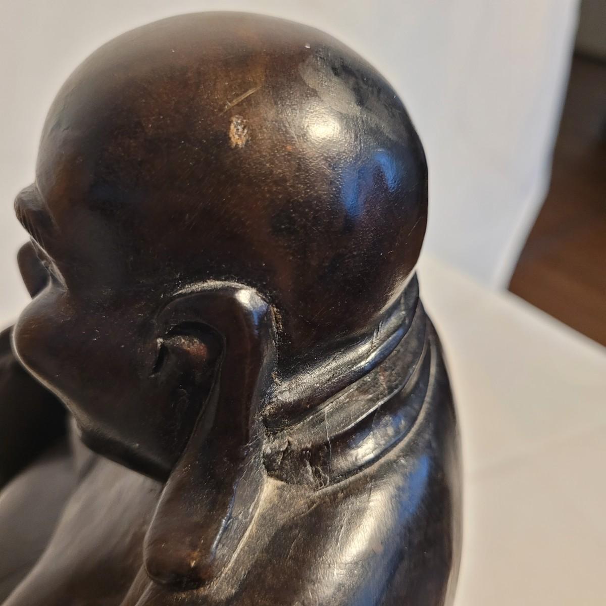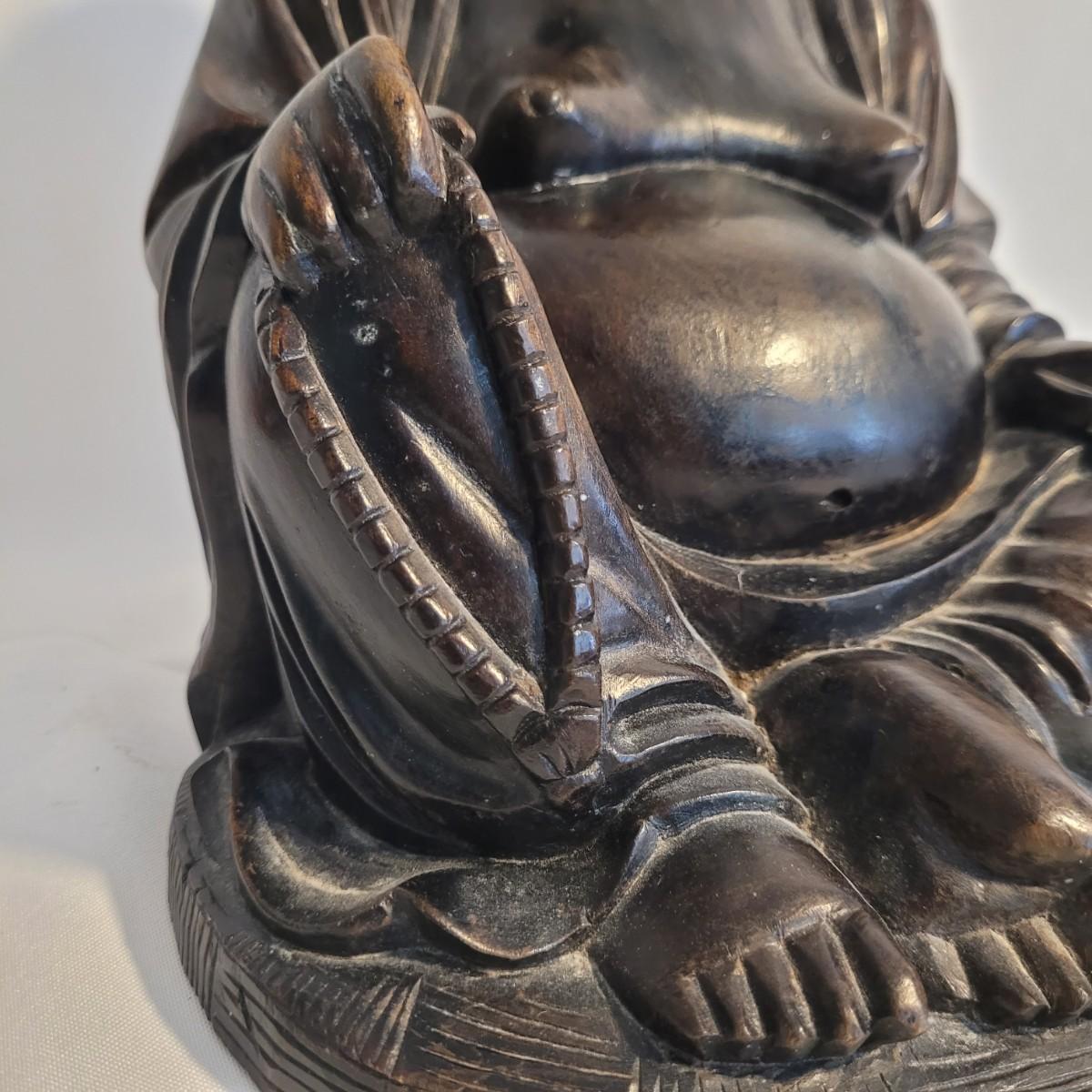 Solid wooden Buddha carved statue in good condition with slight cracking, most noticeable in front across chest and belly, and side by ear. Small nick on head (see photos). Normal accumulation of dust and smudges that can be easily cleaned. Not very heavy. Japanese samurai doll dressed in natural fiber costume. In good condition. Very lightweight. Wooden stand is sturdy. For reference, samurai doll measures approximately 12"L x7"W x16"H (measurements include base). Shipping available.