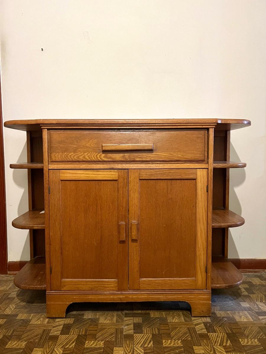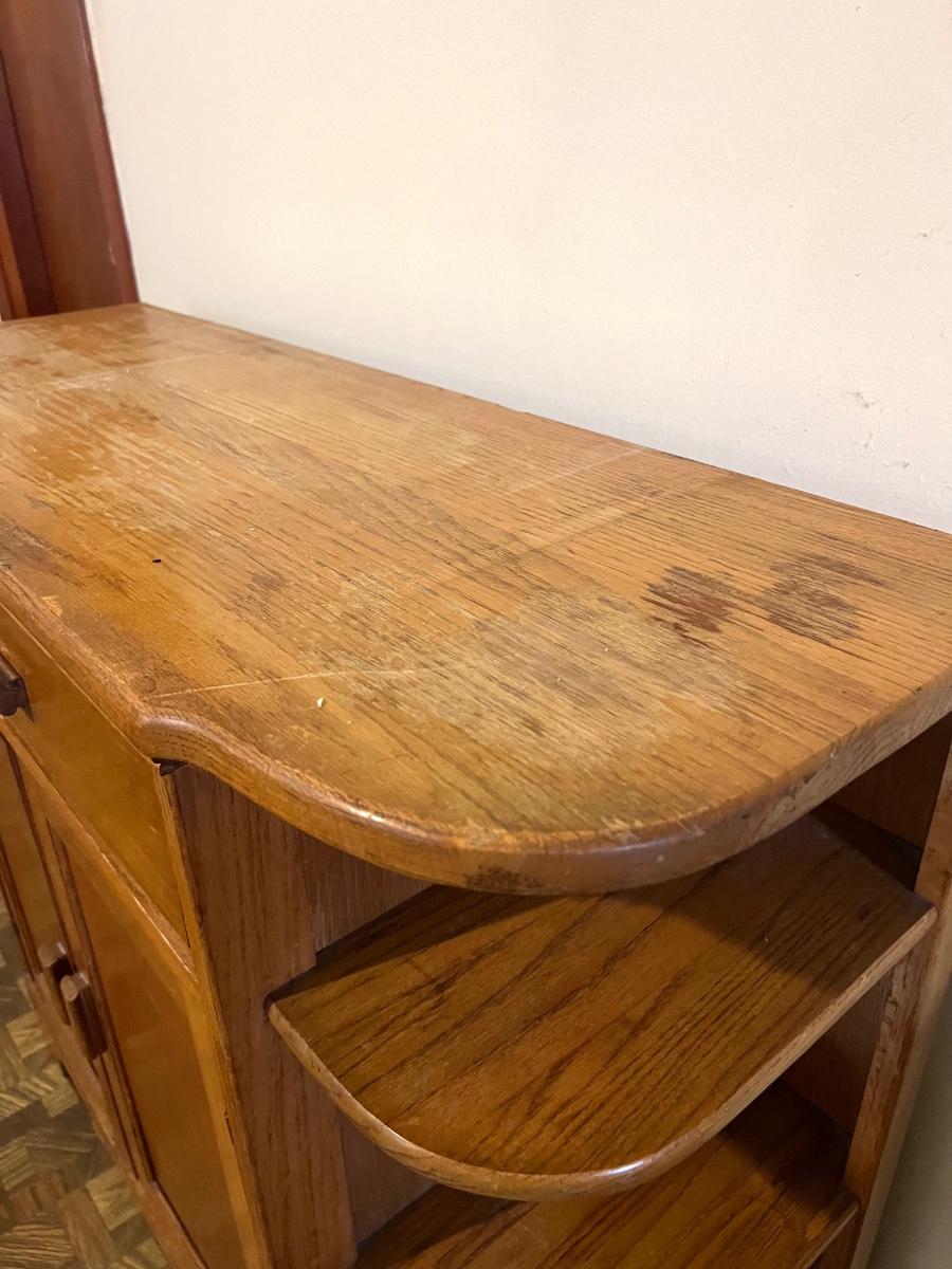With a little TLC this could be right back to new. Top shows signs of stain fading. Otherwise it’s solid. Measures 36 inches tall, 46 inches wide, and 16 inches deep. See pictures for close up pictures and condition.