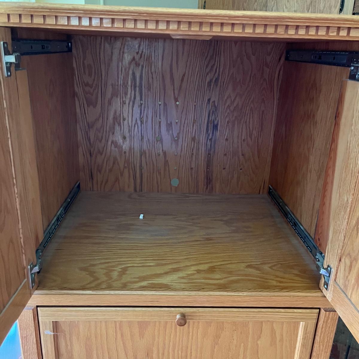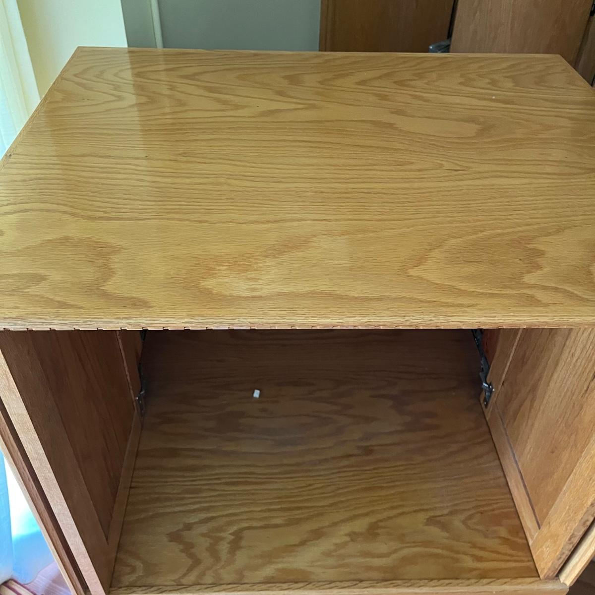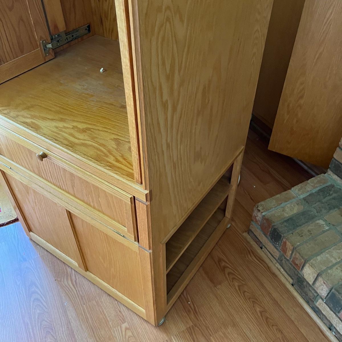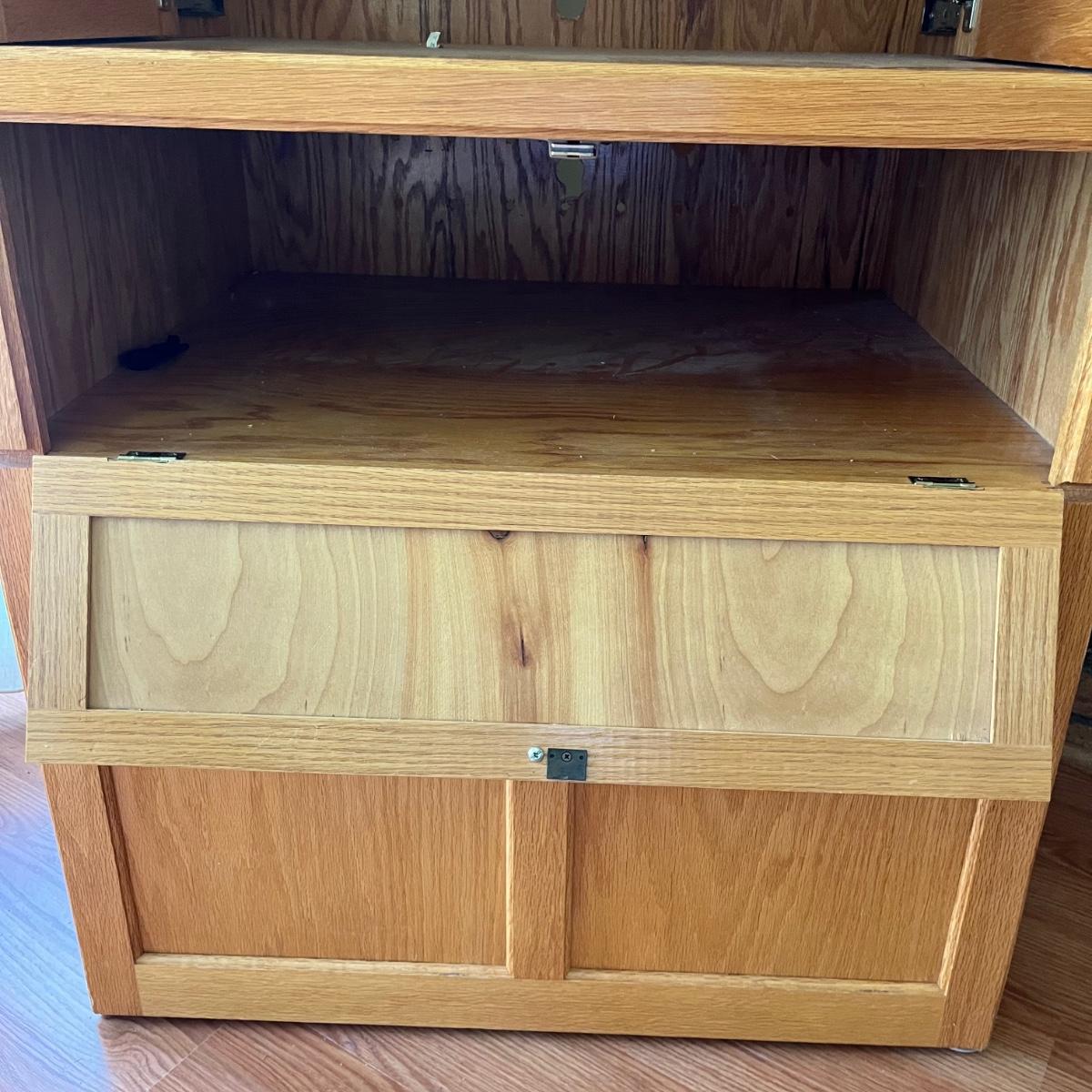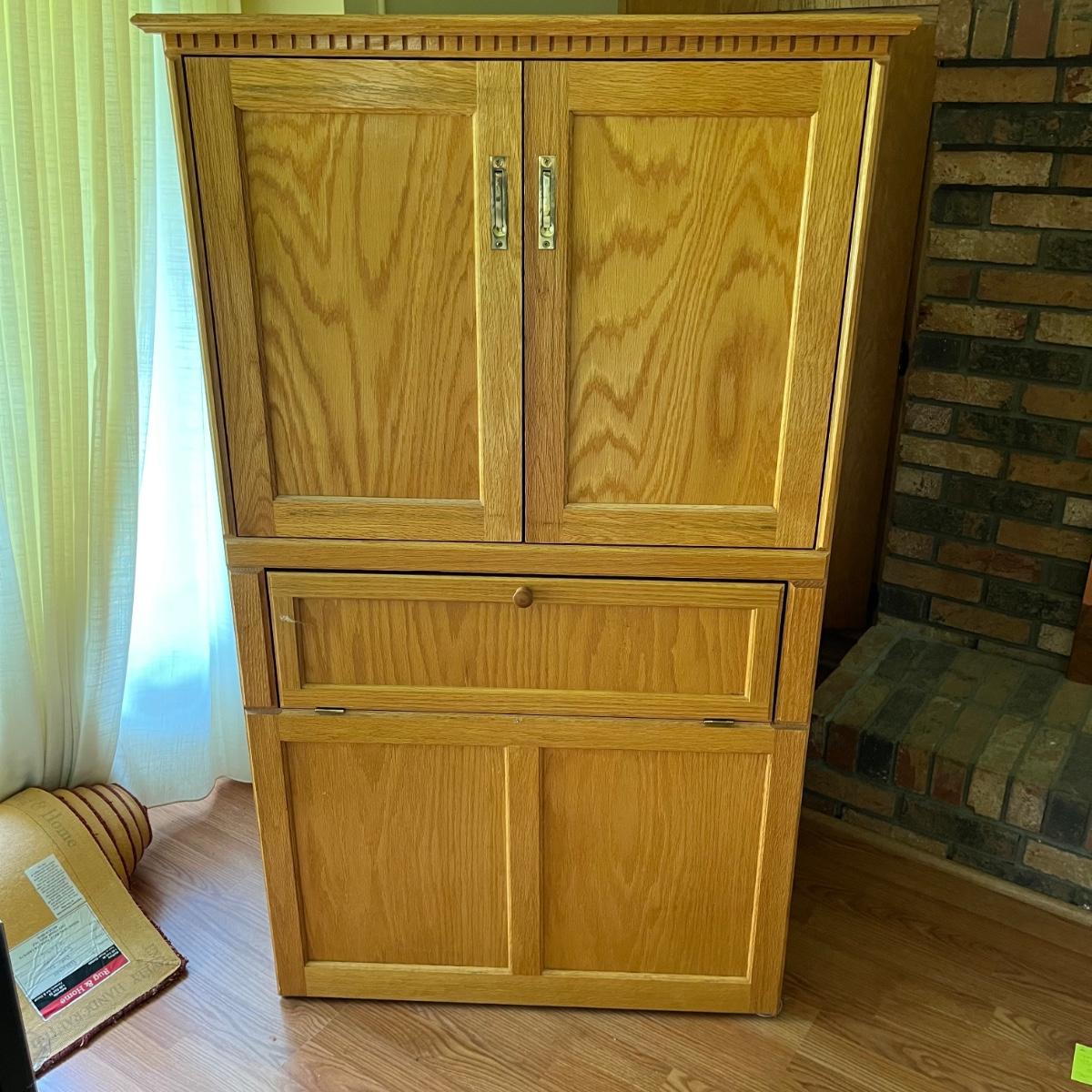 Lot includes a wooden cabinet with two doors on top that slide down the inside of cabinet a shelf with a flip down front and storage on the lower part of both sides. Cabinet measures 25” x 32” x 53.5”. Cabinet is up one flight of stairs. Bring help item is substantial.