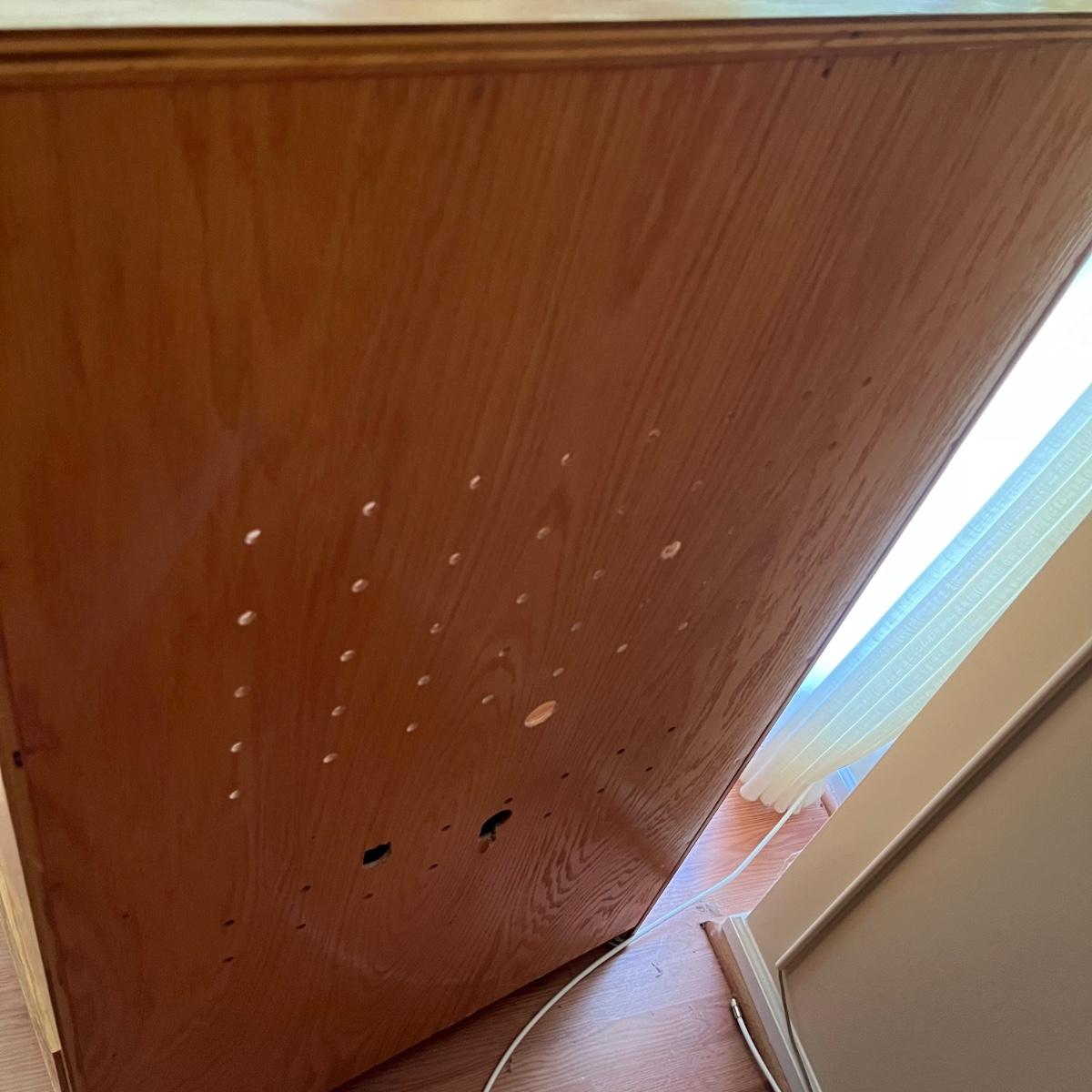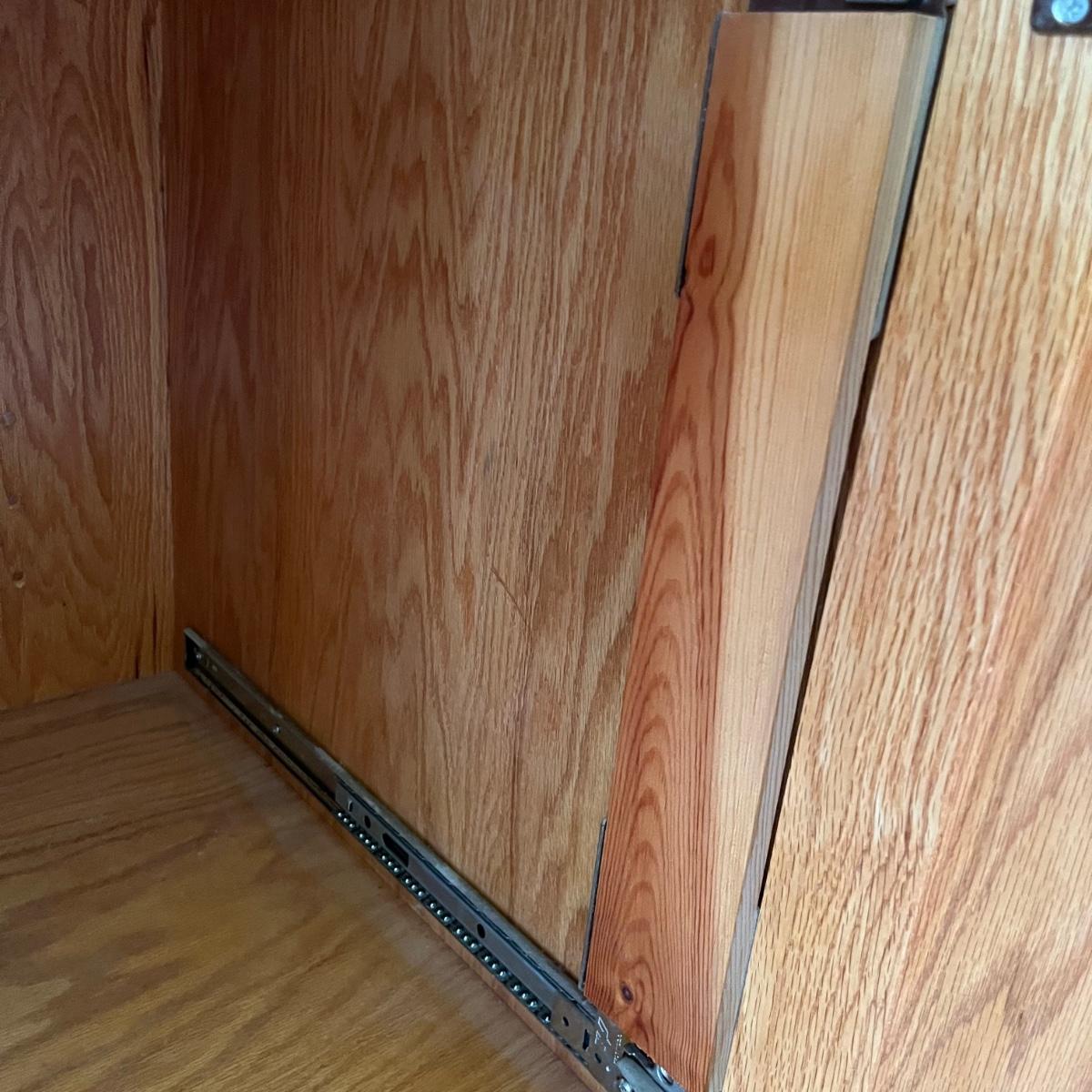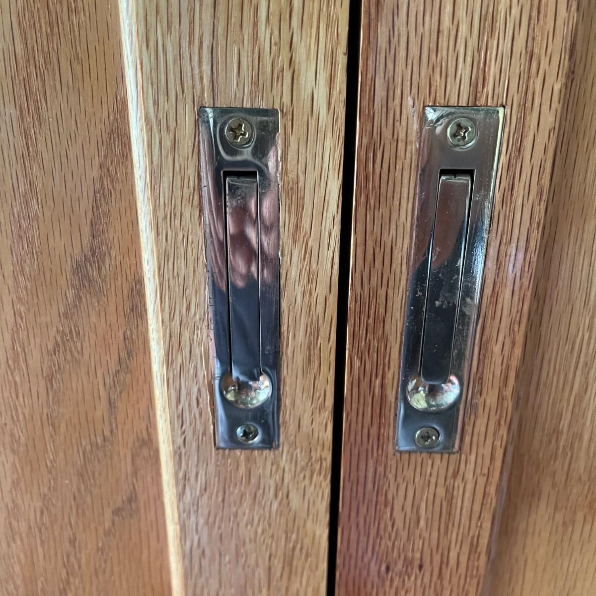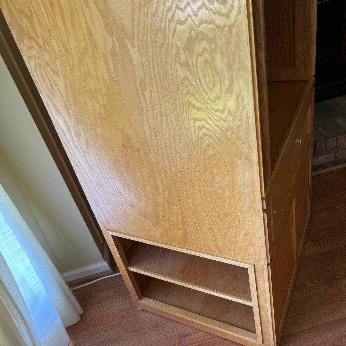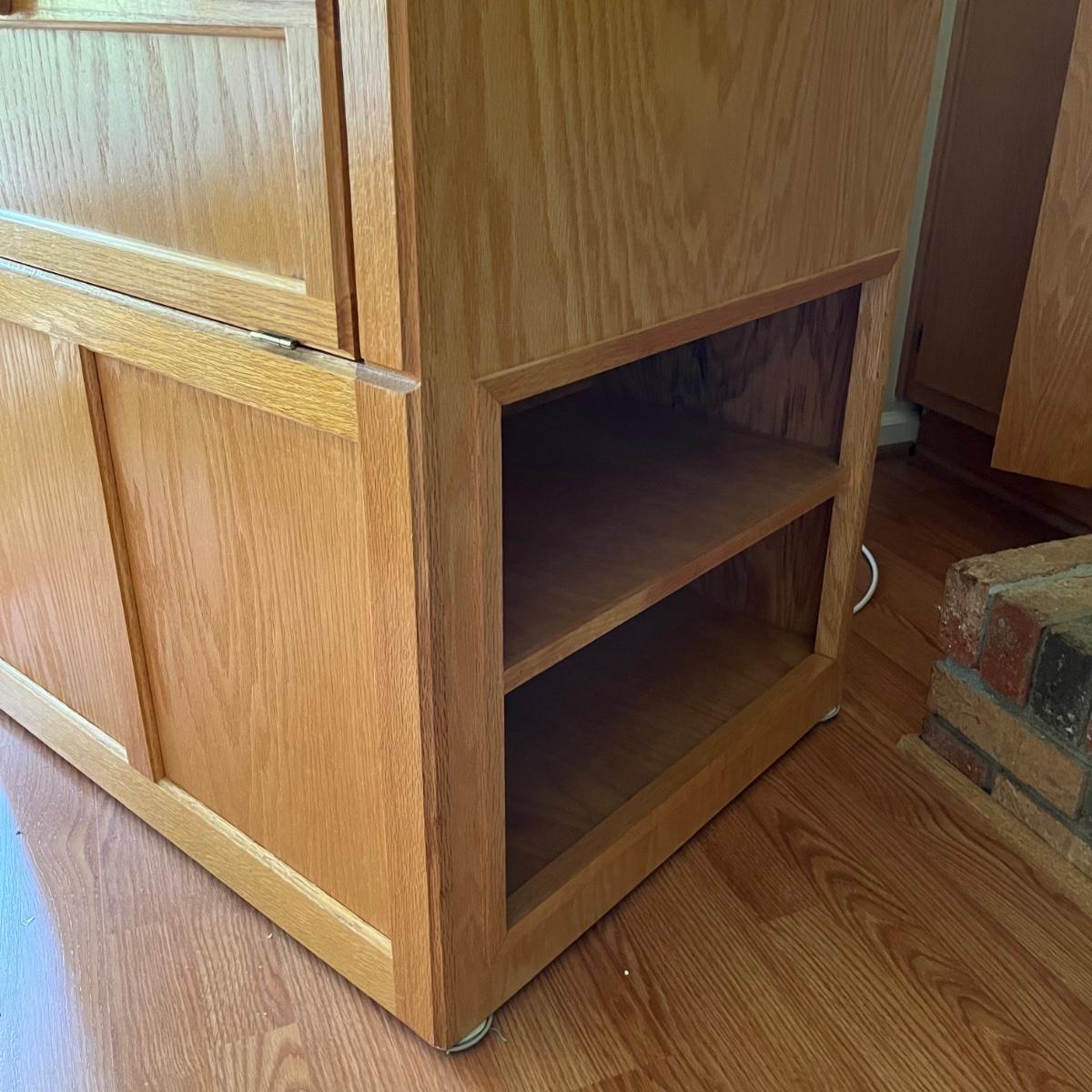 Lot includes a wooden cabinet with two doors on top that slide down the inside of cabinet a shelf with a flip down front and storage on the lower part of both sides. Cabinet measures 25” x 32” x 53.5”. Cabinet is up one flight of stairs. Bring help item is substantial.