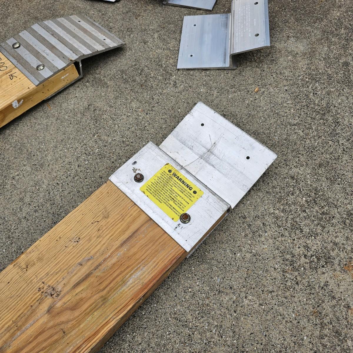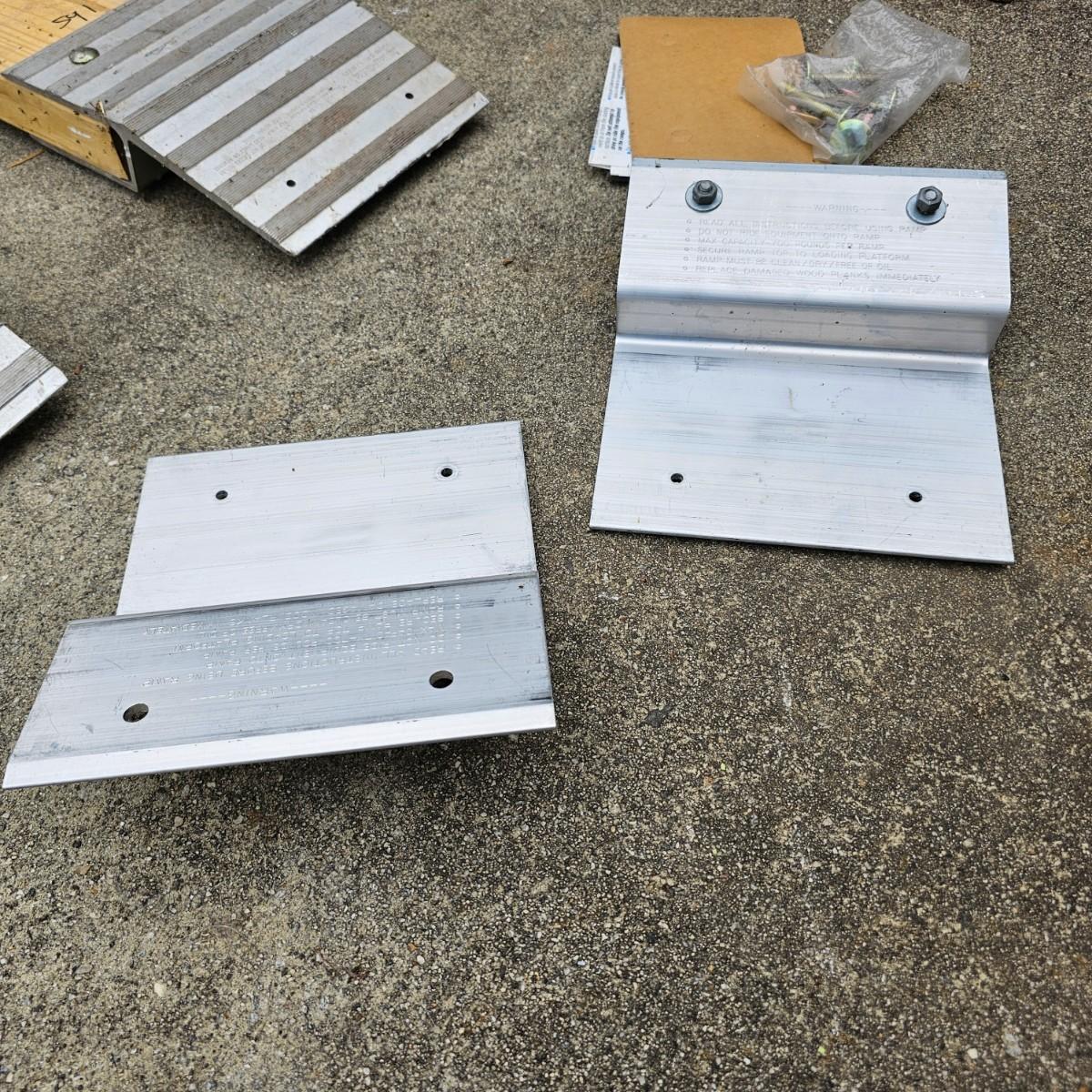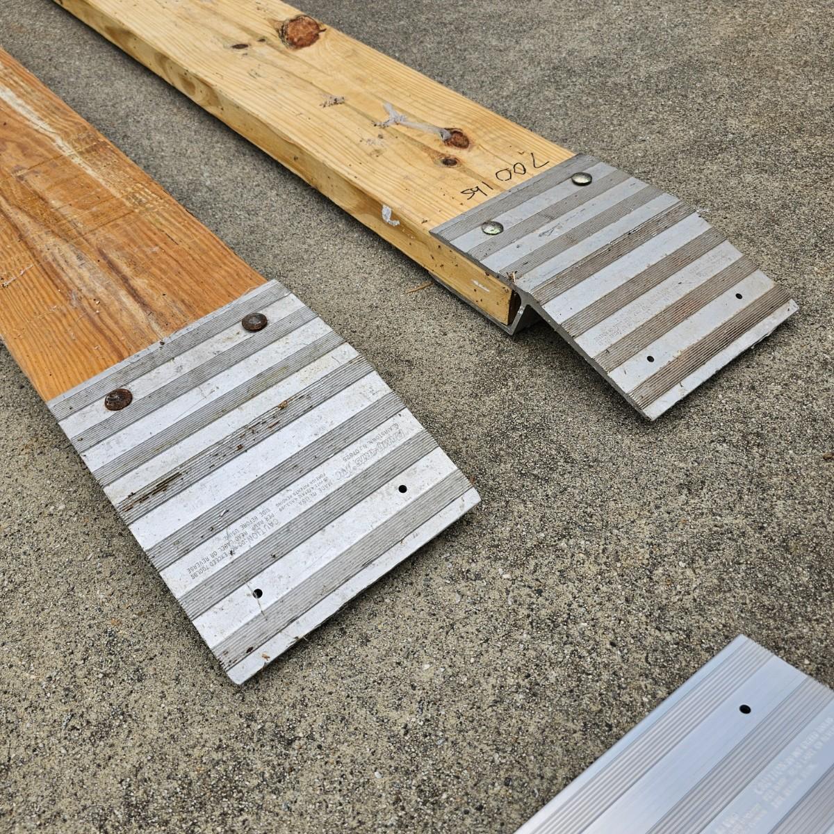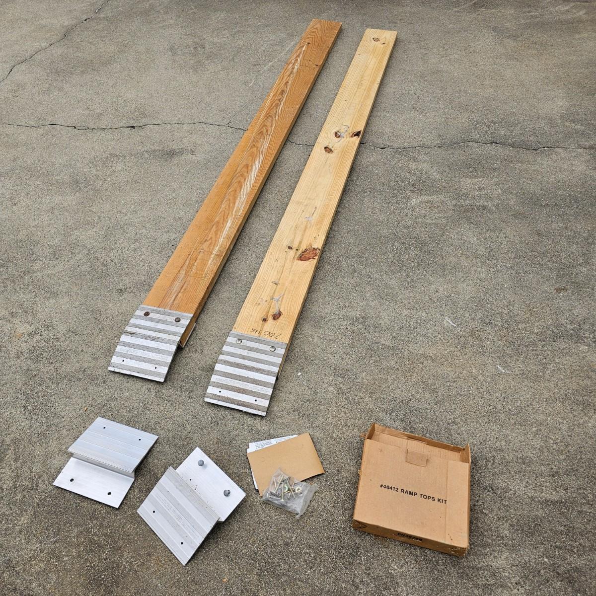 One pair wooden ramps with aluminum ends. Ramps are 2"x 8" x 102" long. Also includes second pair of ramp tops to make additional ramps. Shorter set all wood ramps, 9" x 34" x 3"H. See photos for details. Local pickup only.