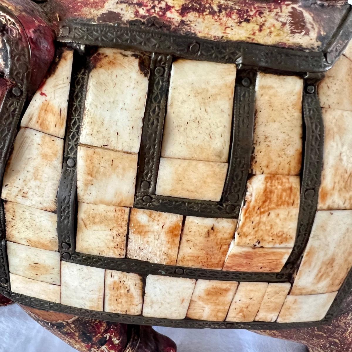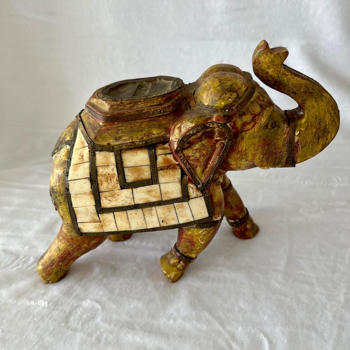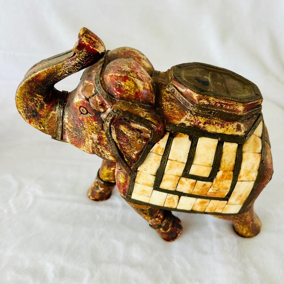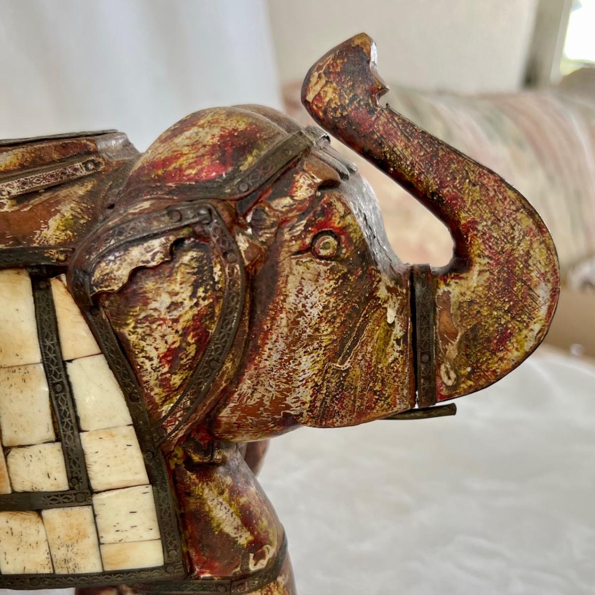 Two matching elephants have white tile and brass like detail and measure Pier One sticker, One lighter color elephant with tusks. Shipping available.