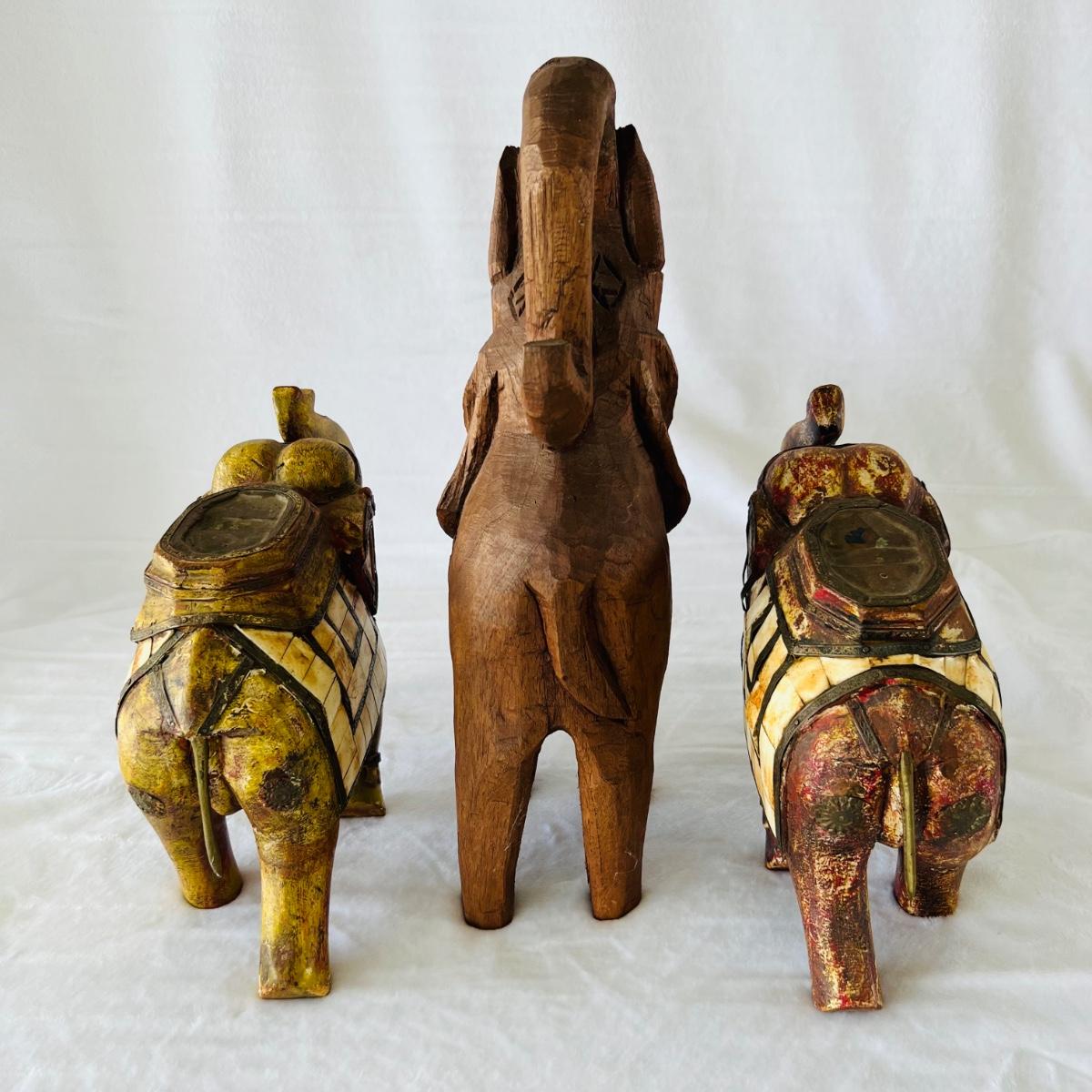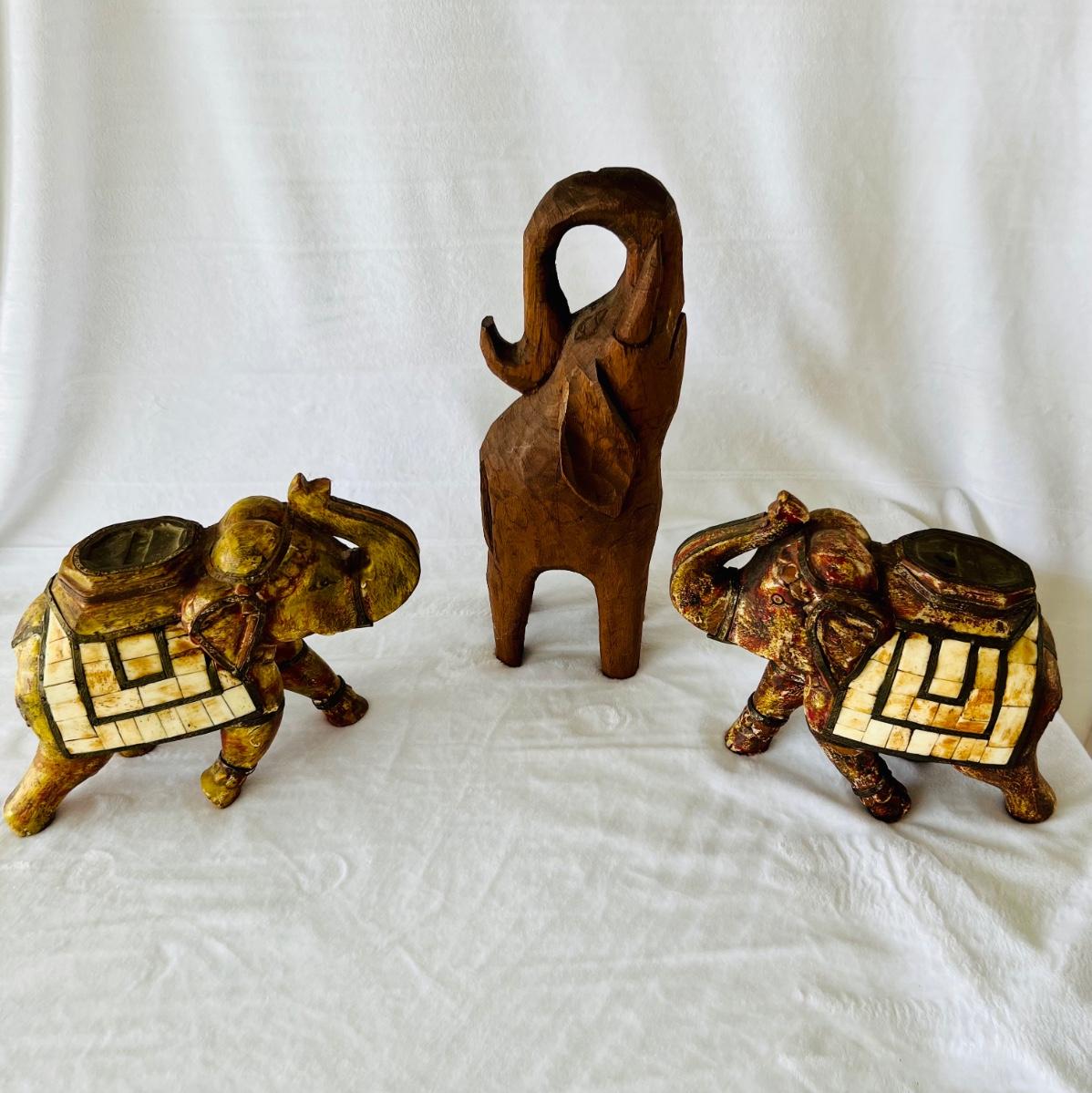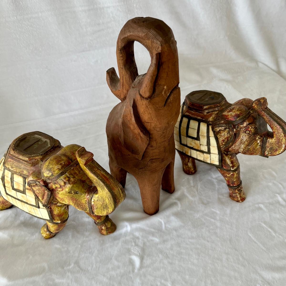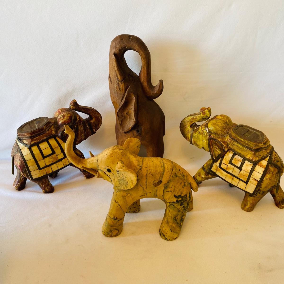 Four decorative wooden carved elephants. Taller elephant appears to be hand-carved and measures 14”H.