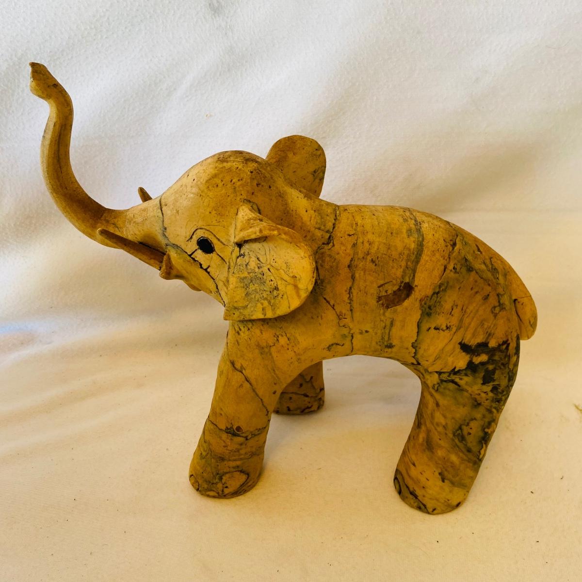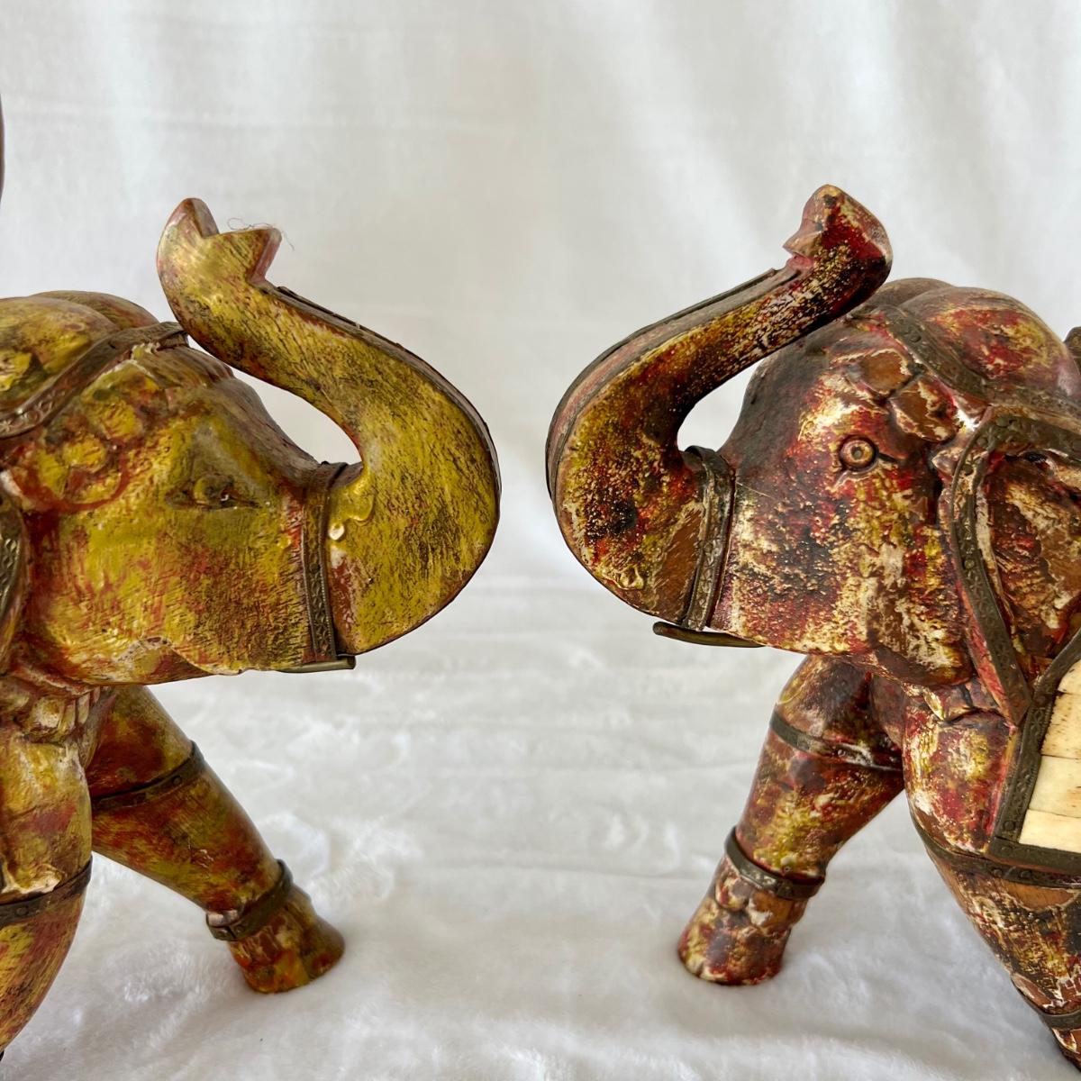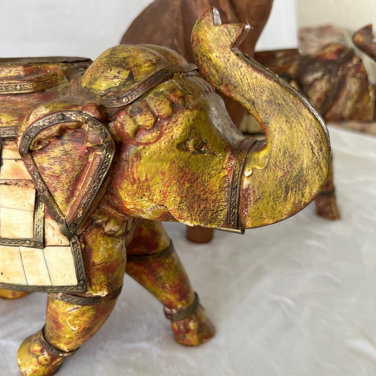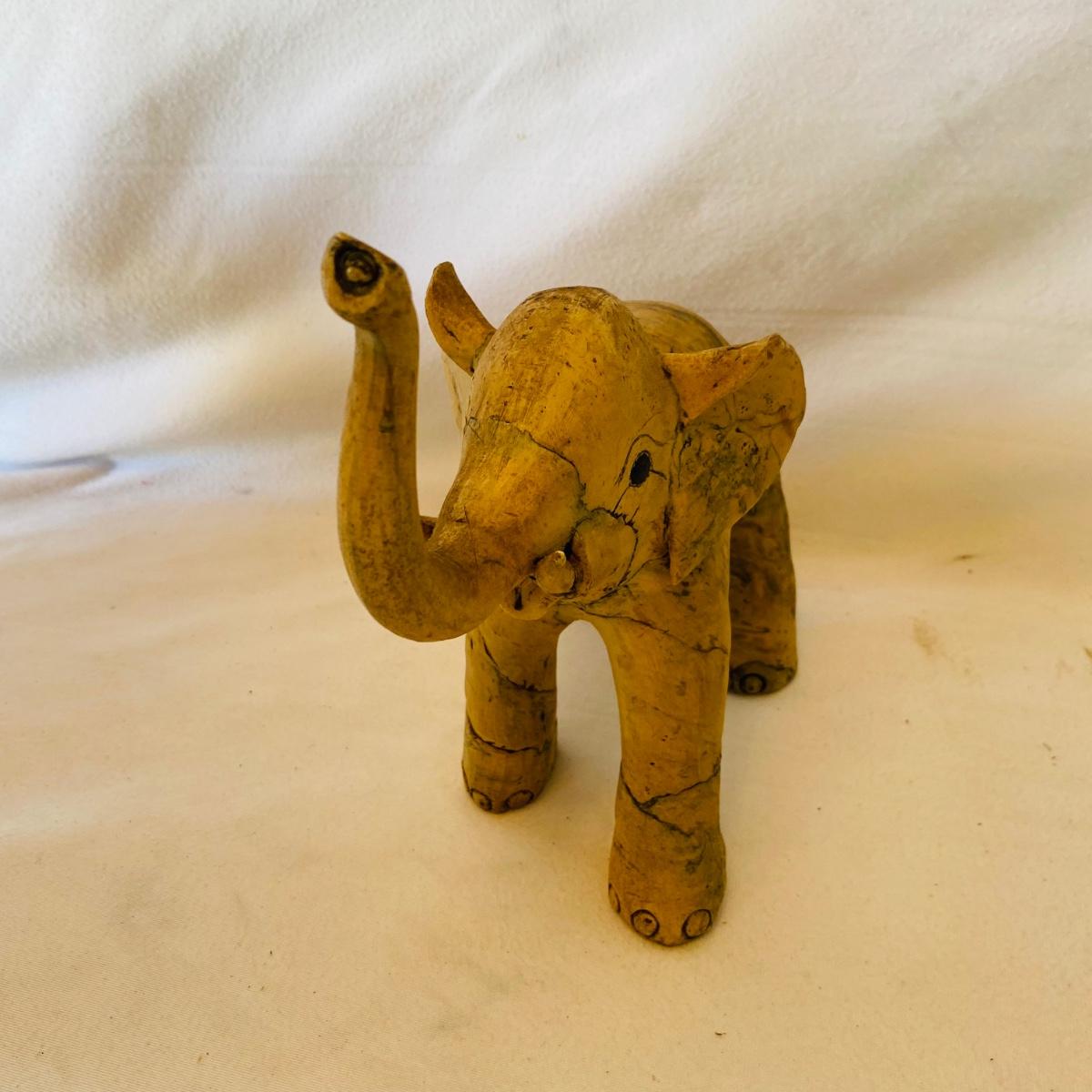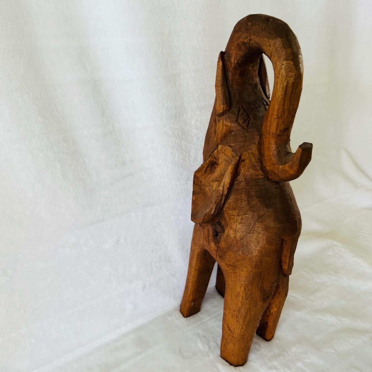 Four decorative wooden carved elephants. Taller elephant appears to be hand-carved and measures 14”H.