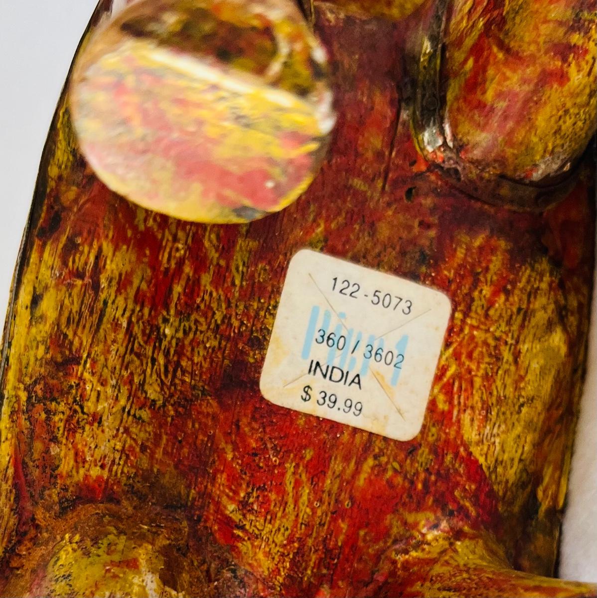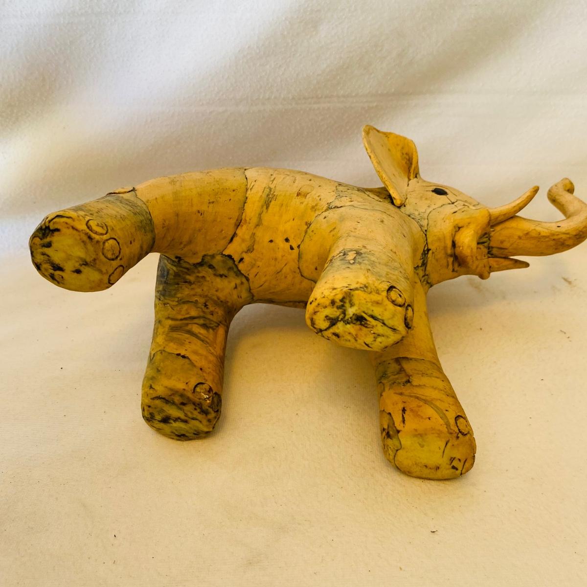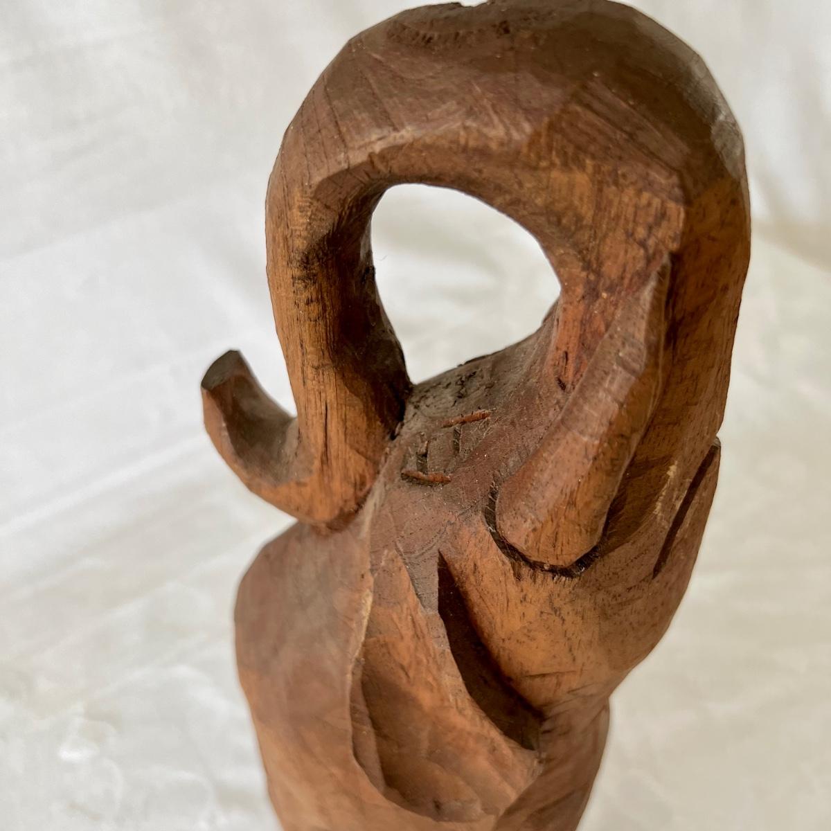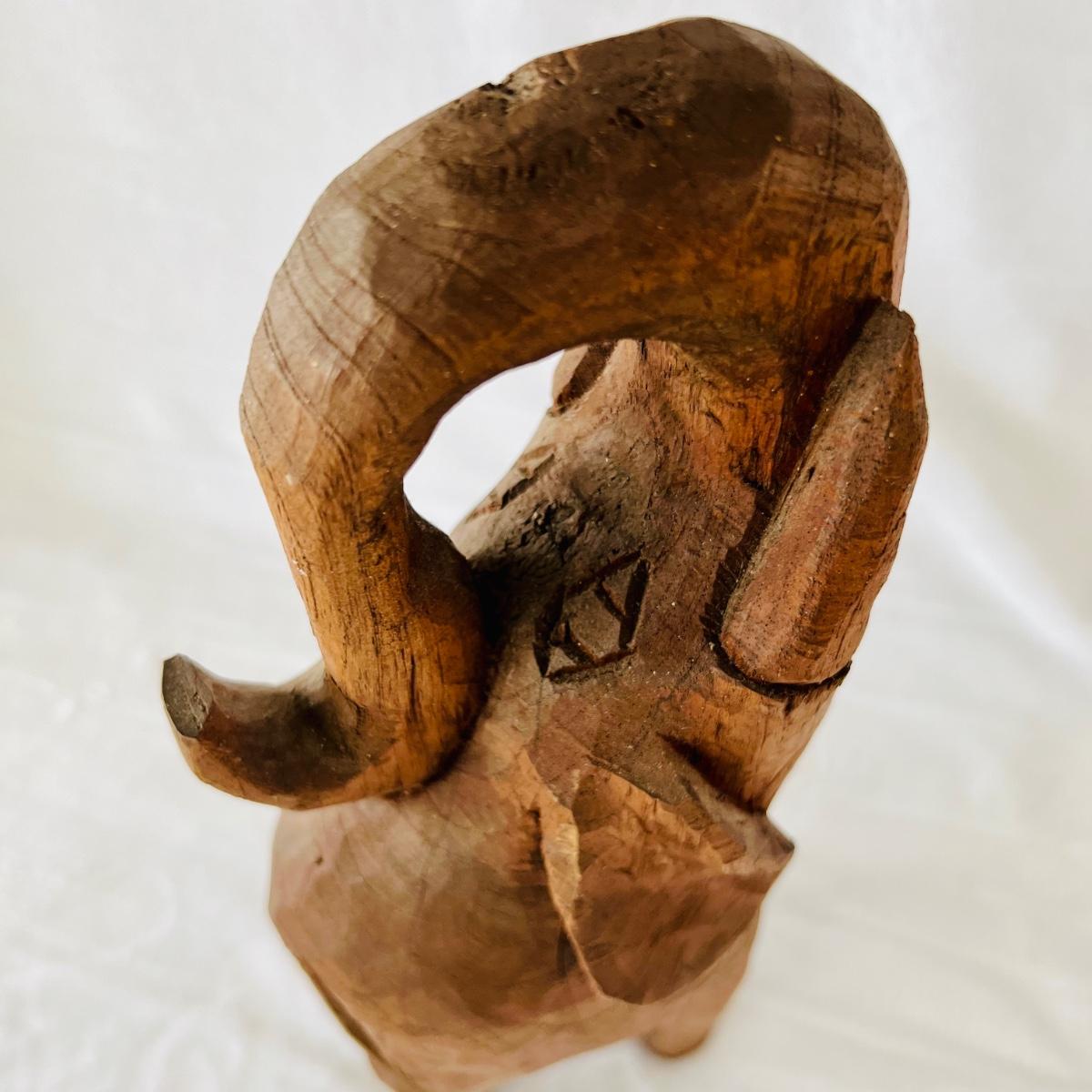 Four decorative wooden carved elephants. Taller elephant appears to be hand-carved and measures 14”H.