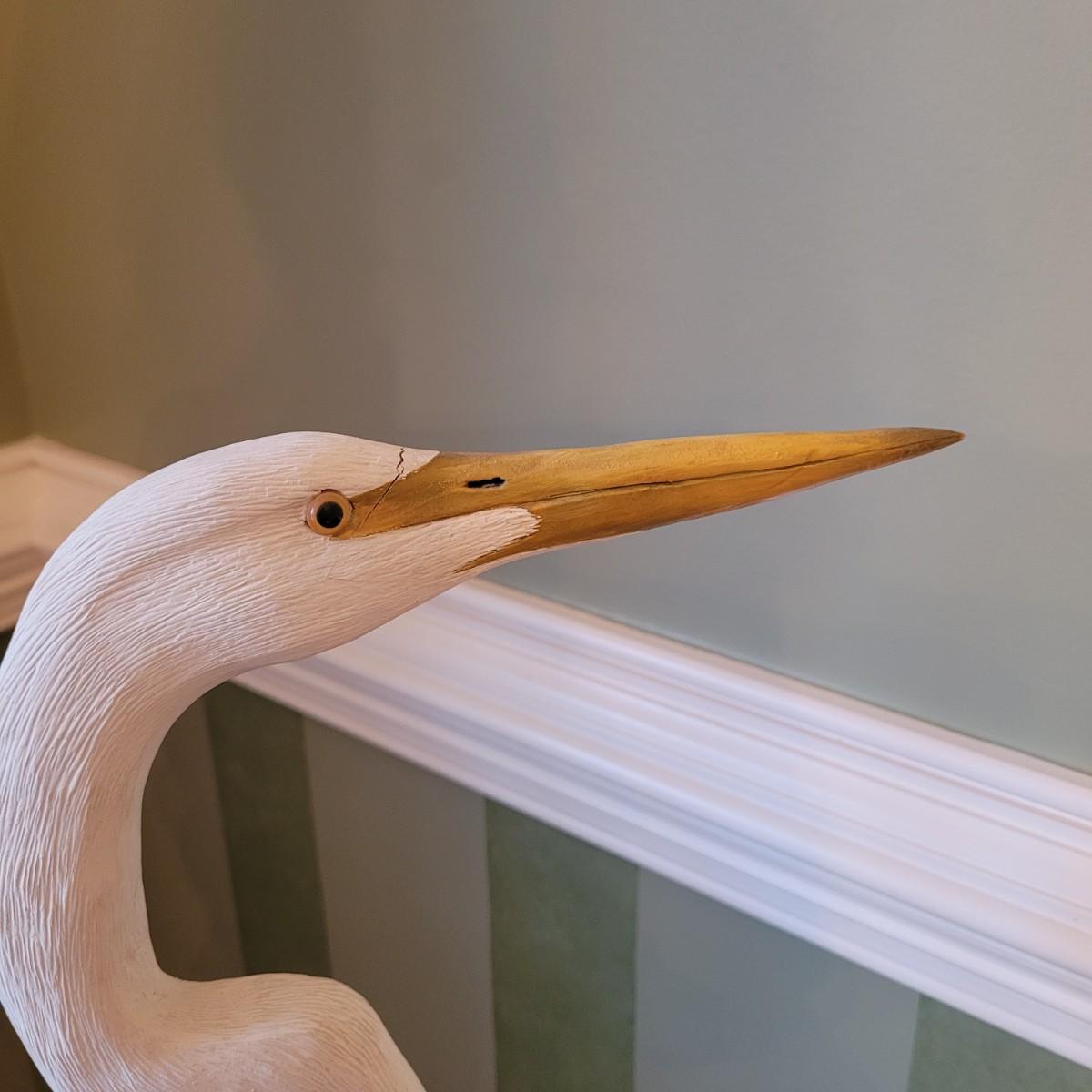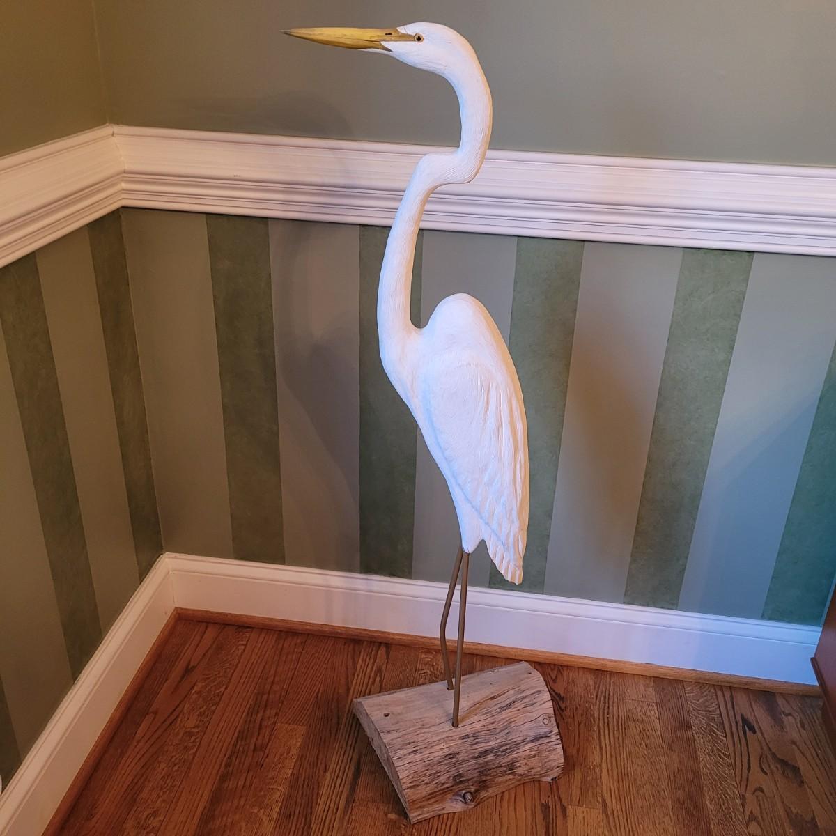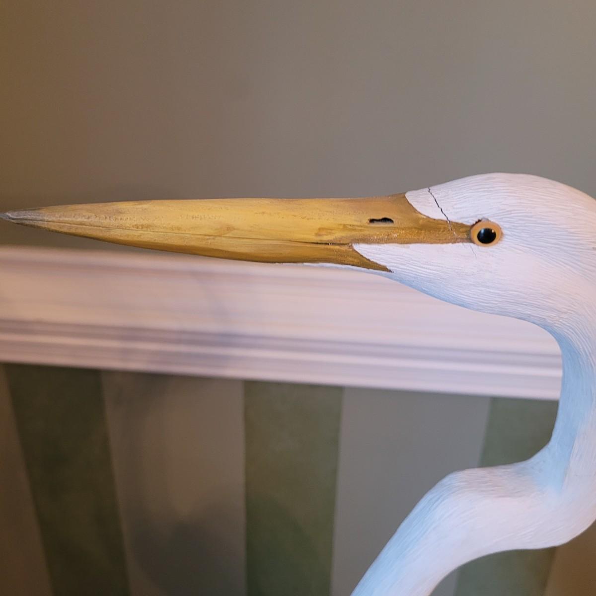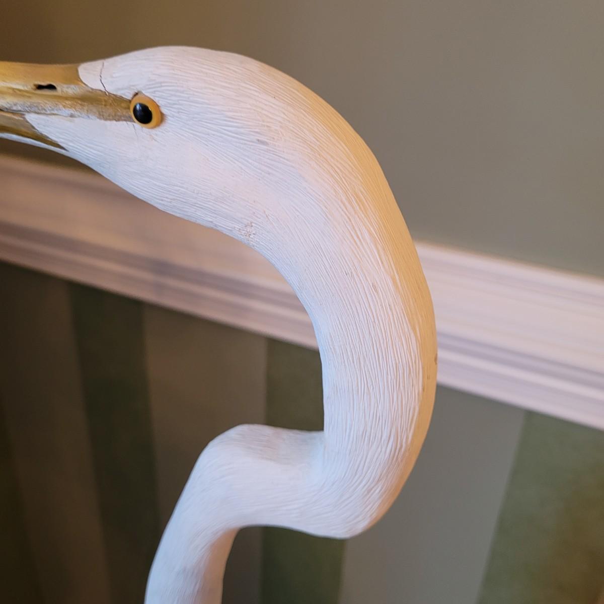 This beautiful, elegant wooden carved great egret has metal legs set in a leveled wood log. Some small cracks in wooden bird body. Measures approximately 46”H. Please see photos for details. Shipping available. Shipping art can be costly. We suggest contacting our preferred local shipping provider, Postage Express, with dimensions and getting an estimate before bidding: (828) 670-5501 or shipping@postageexpressnc.com.