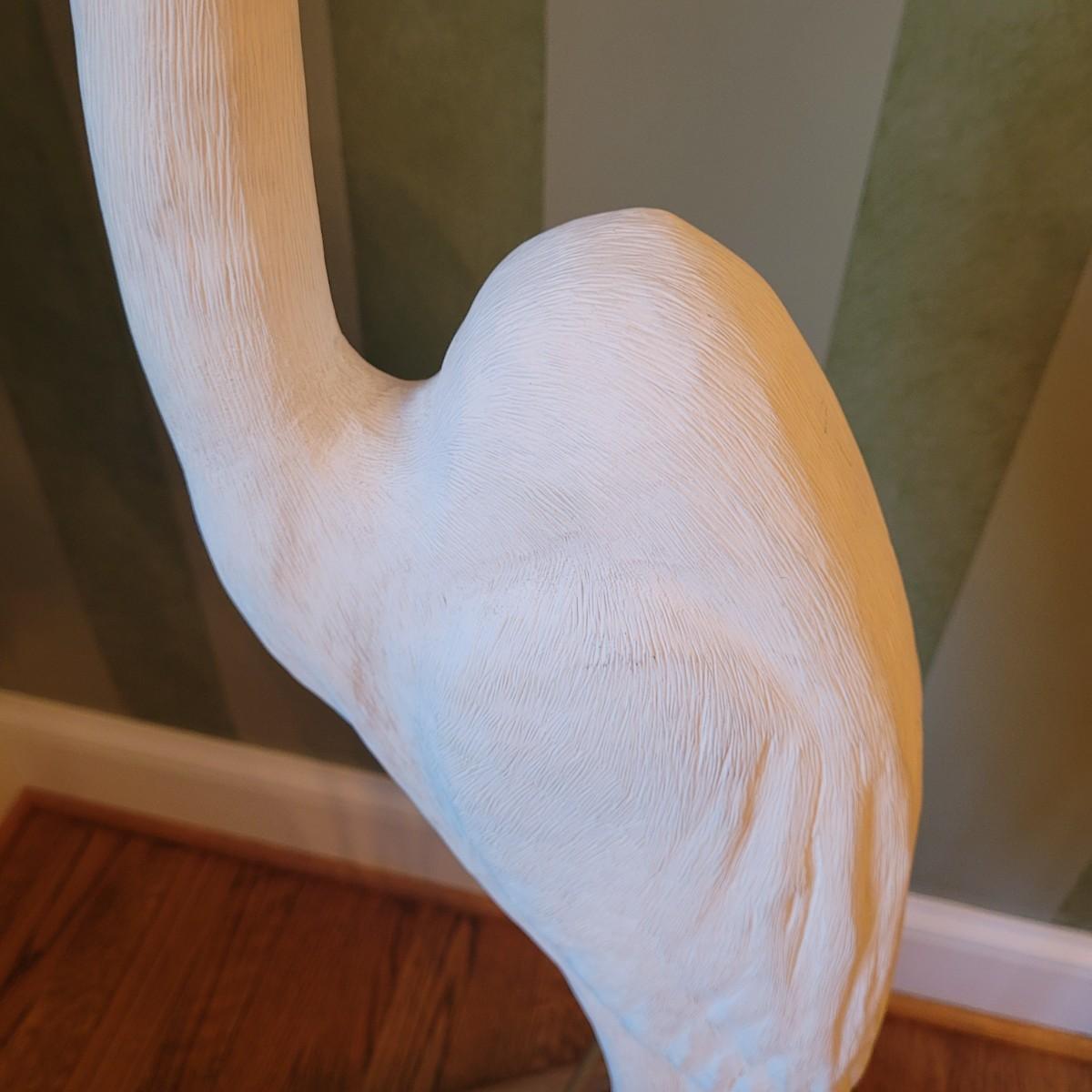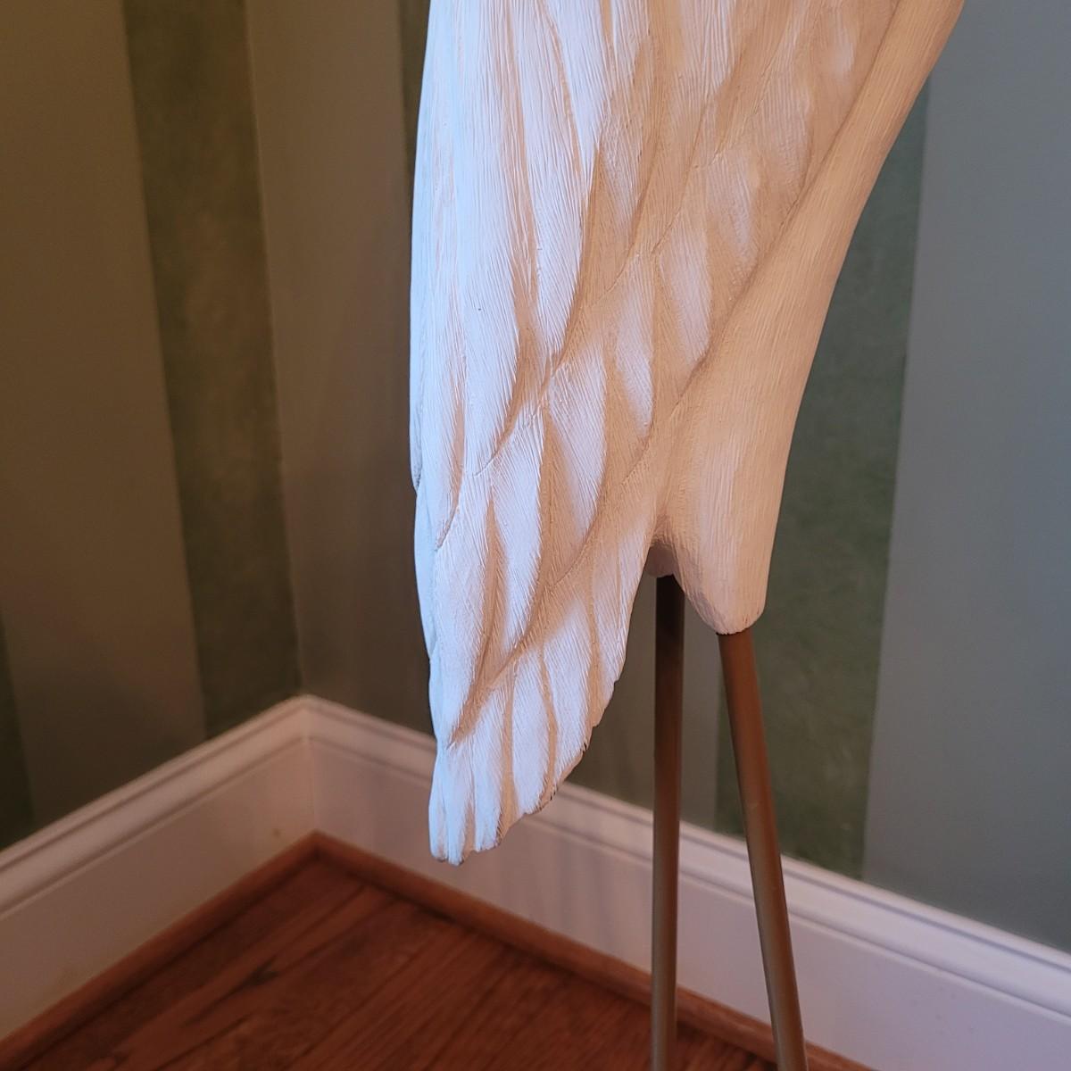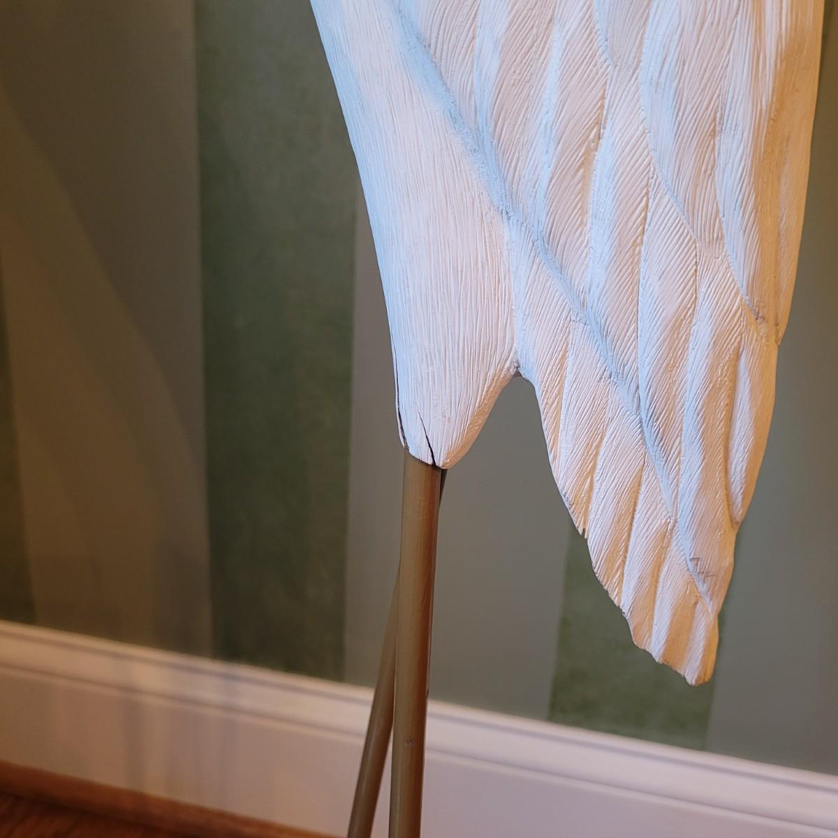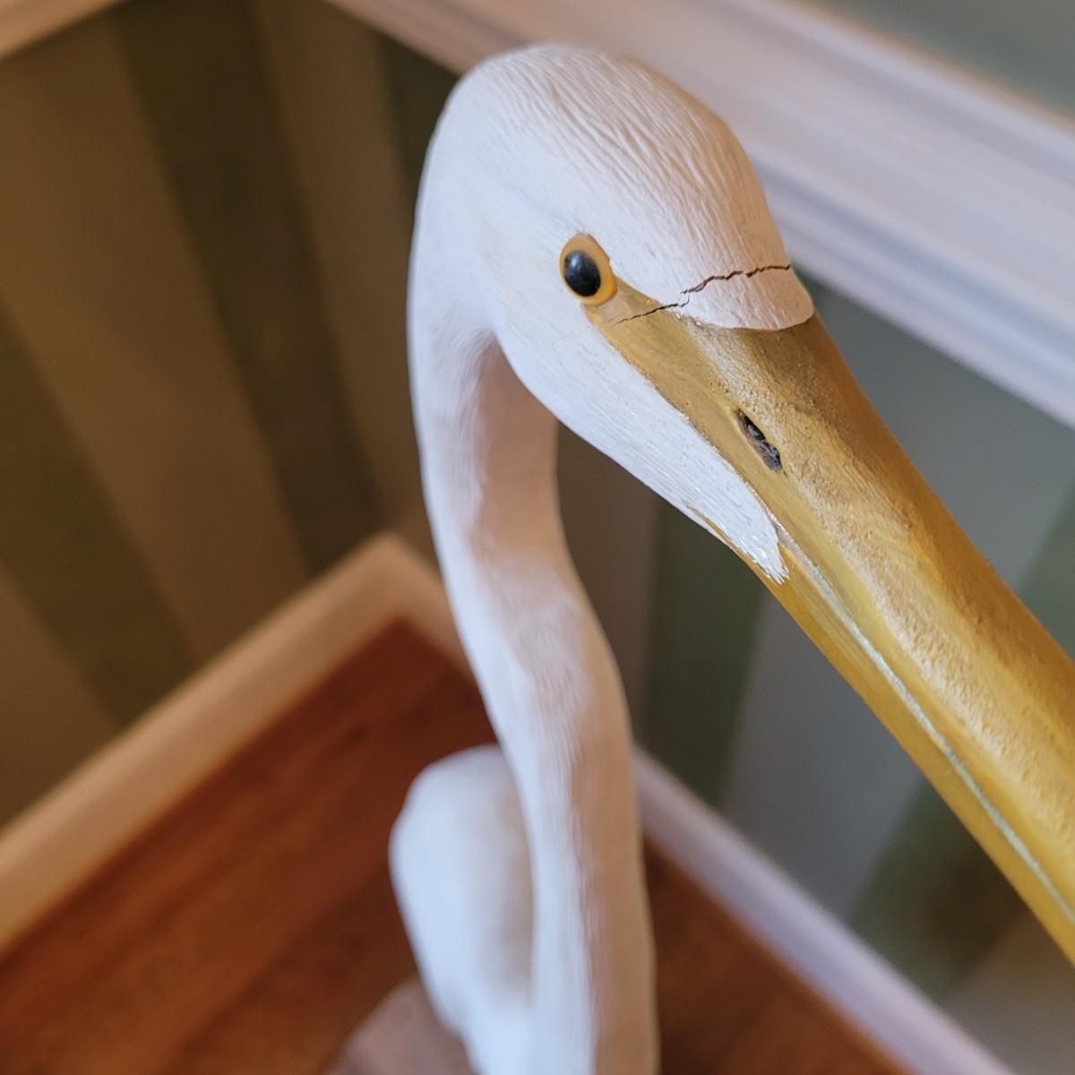 This beautiful, elegant wooden carved great egret has metal legs set in a leveled wood log. Some small cracks in wooden bird body. Measures approximately 46”H. Please see photos for details. Shipping available. Shipping art can be costly. We suggest contacting our preferred local shipping provider, Postage Express, with dimensions and getting an estimate before bidding: (828) 670-5501 or shipping@postageexpressnc.com.