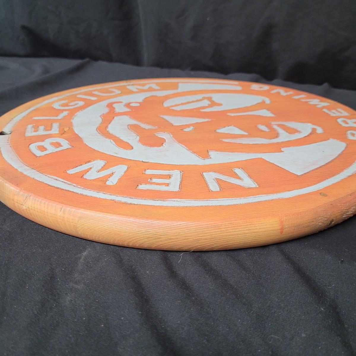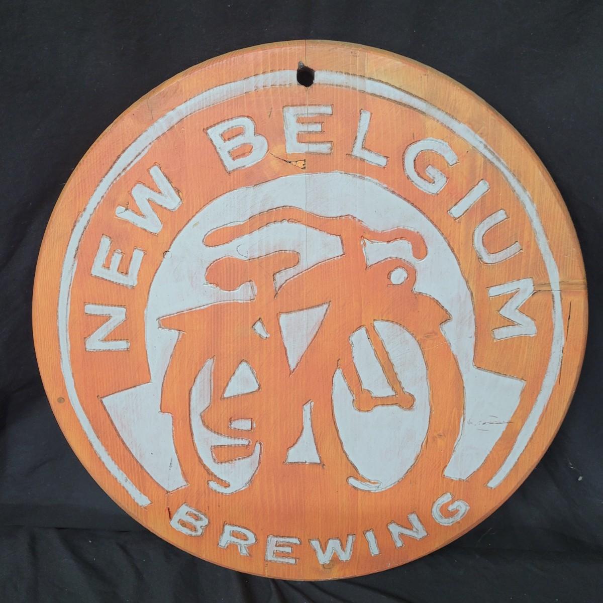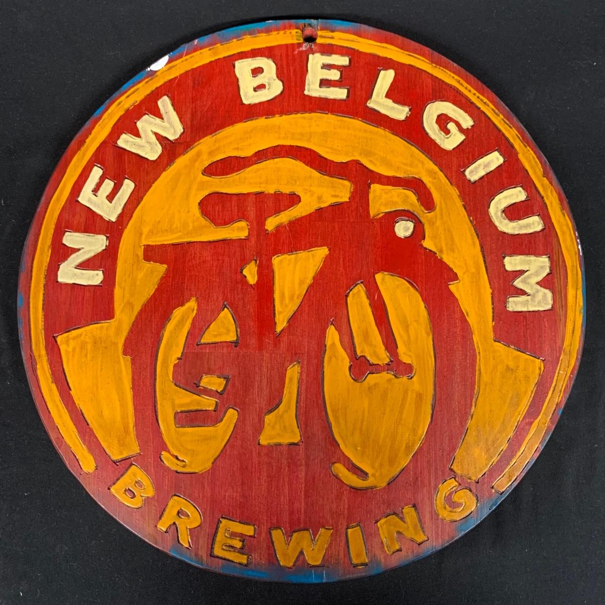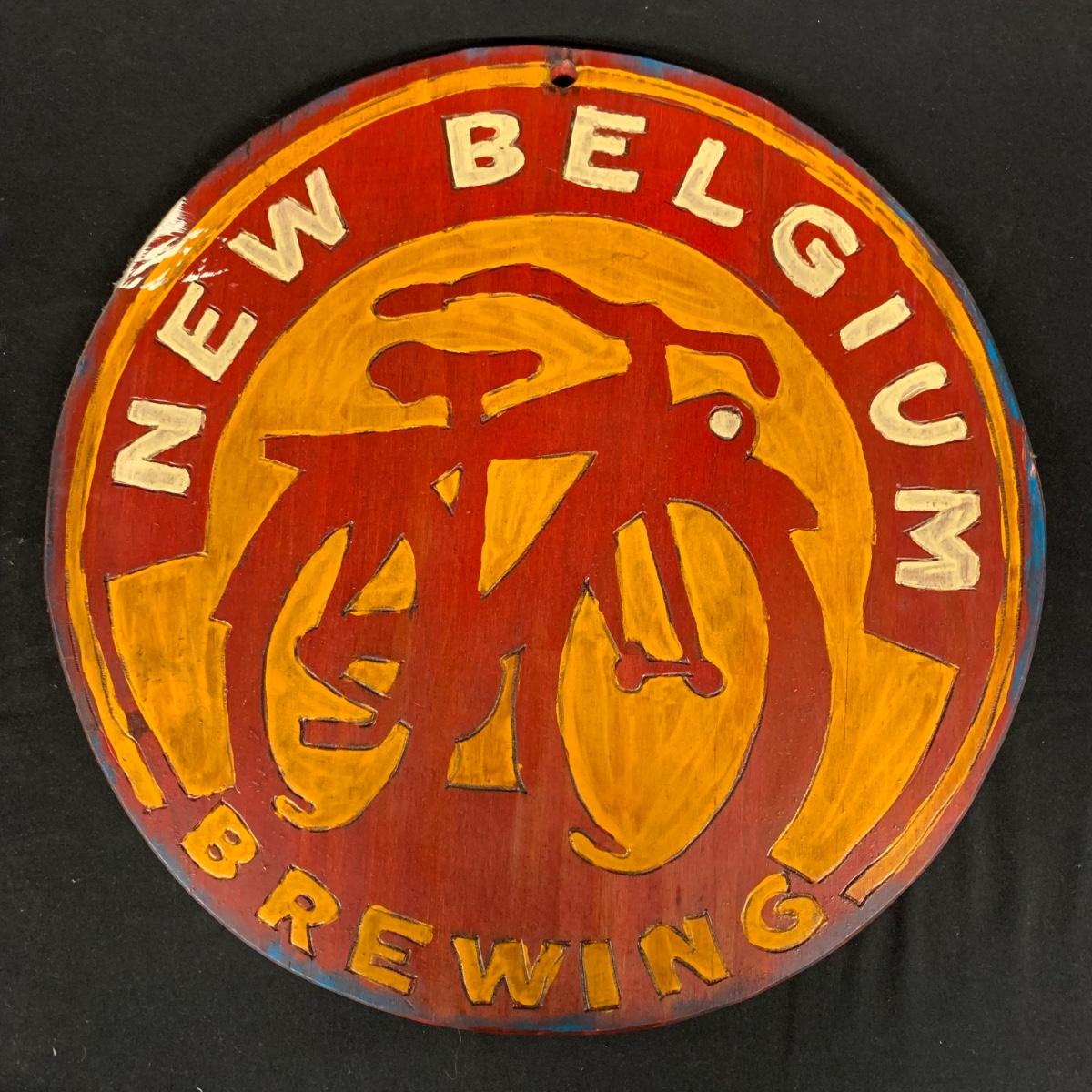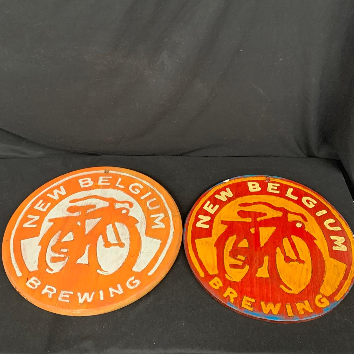Two wooden carved New Belgium circular signs. Both are double sided. The white and red one is colored with paint and stain. The yellow and red one is paint. Normal wear and tear (see pictures). The red and white one is 18"D. Both have a hole for hanging. Shipping available.