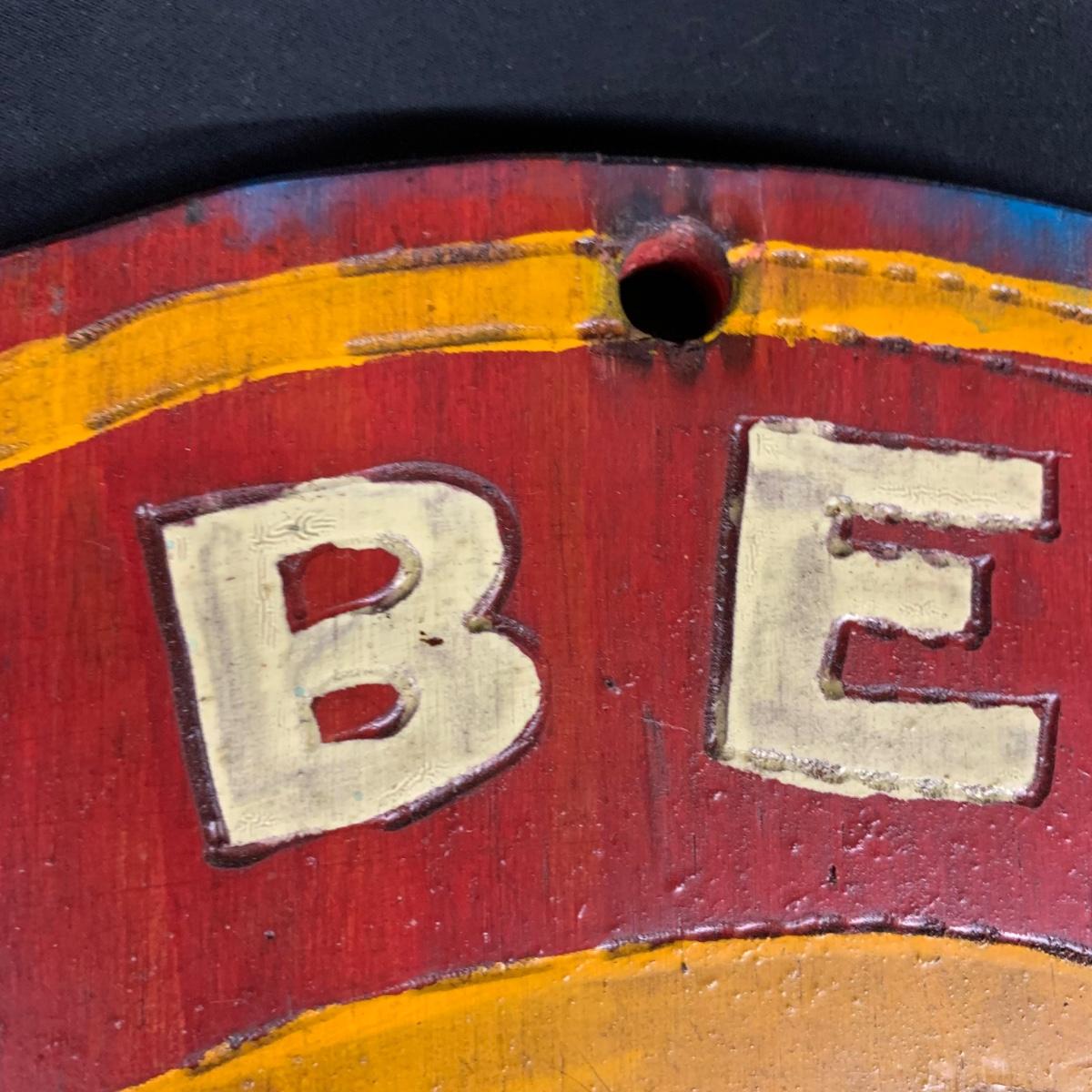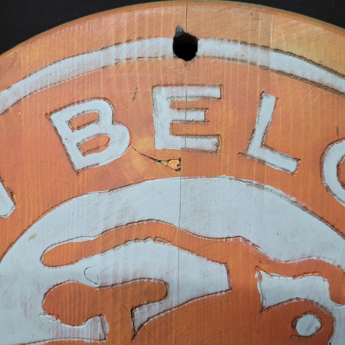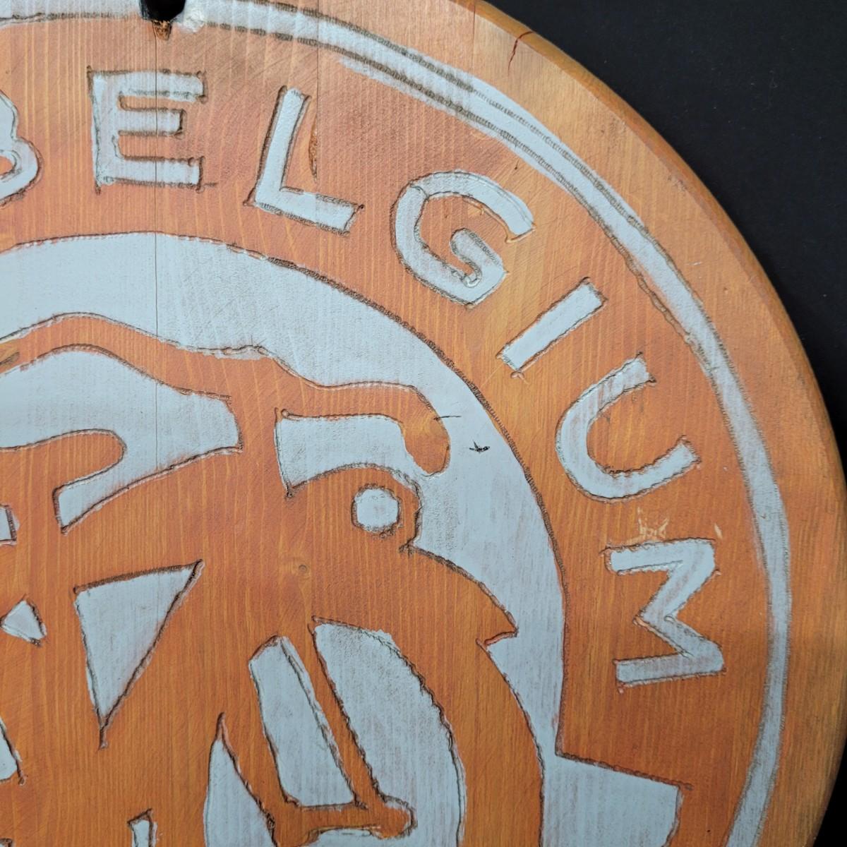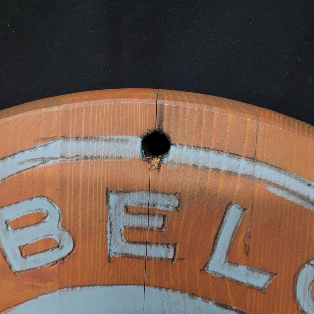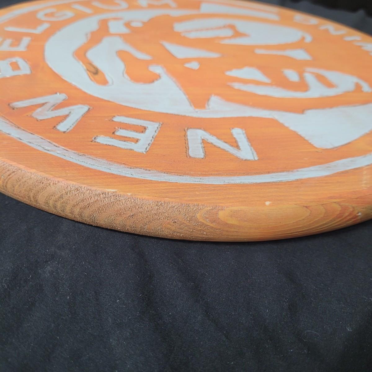 Two wooden carved New Belgium circular signs. Both are double sided. The white and red one is colored with paint and stain. The yellow and red one is paint. Normal wear and tear (see pictures). The red and white one is 18"D. Both have a hole for hanging. Shipping available.