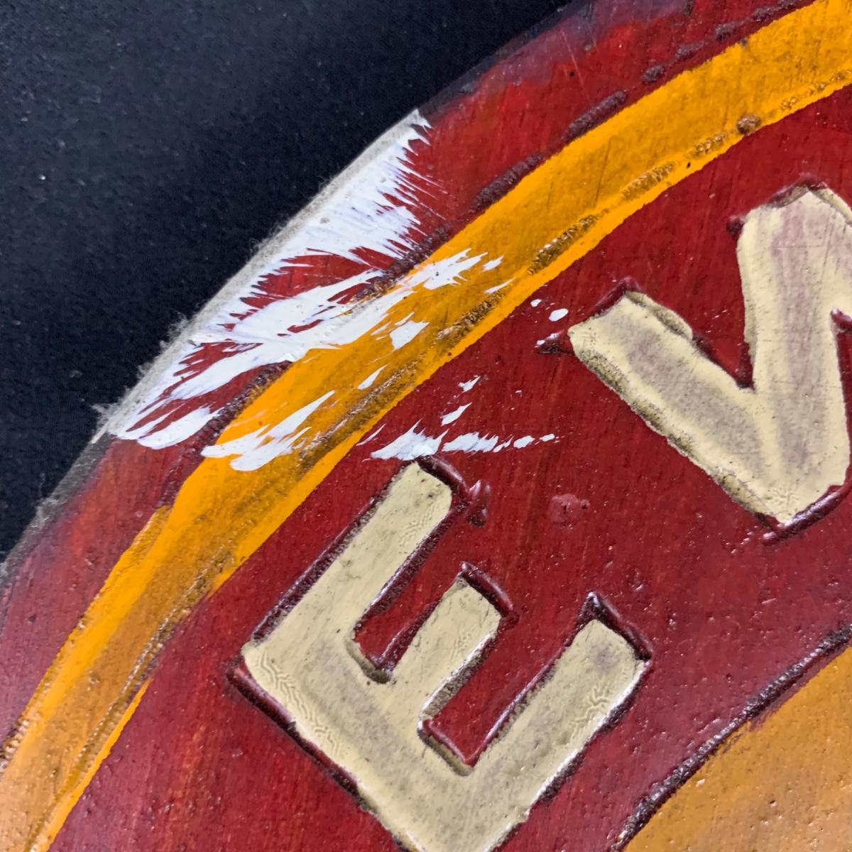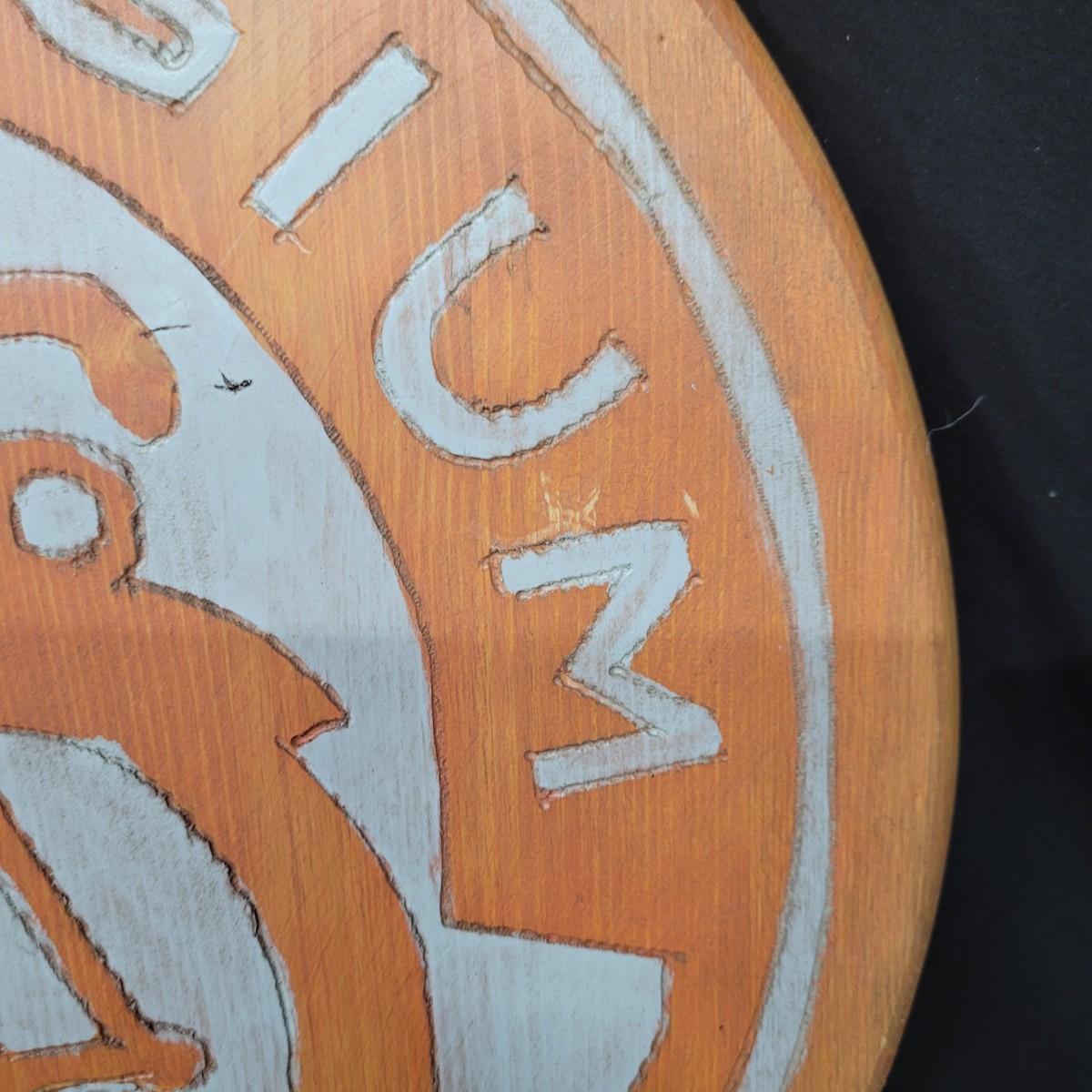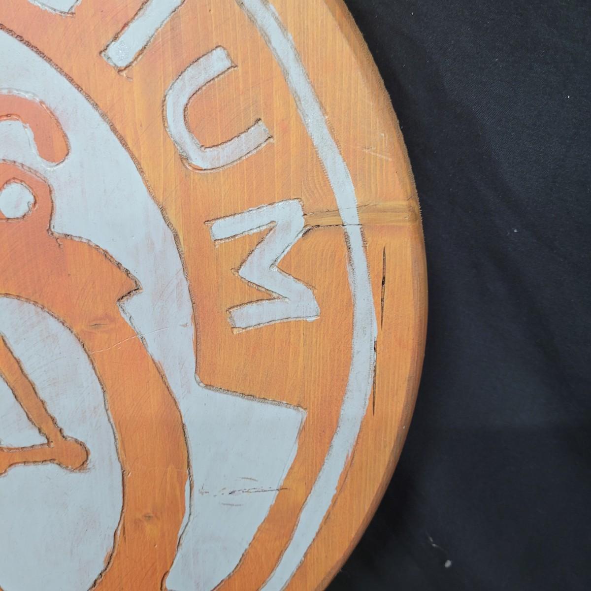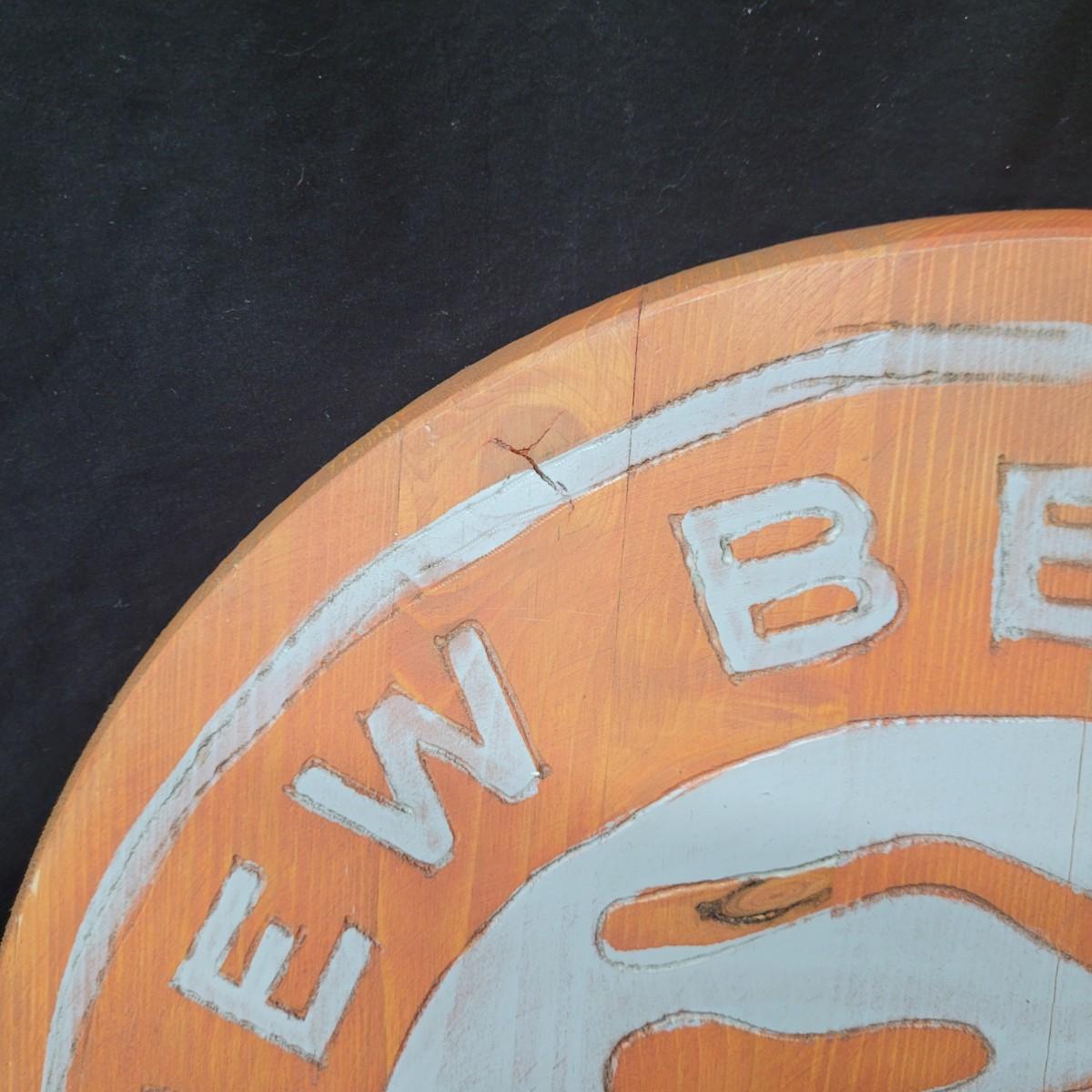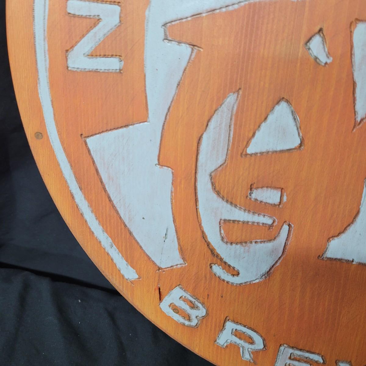 Two wooden carved New Belgium circular signs. Both are double sided. The white and red one is colored with paint and stain. The yellow and red one is paint. Normal wear and tear (see pictures). The red and white one is 18"D. Both have a hole for hanging. Shipping available.
