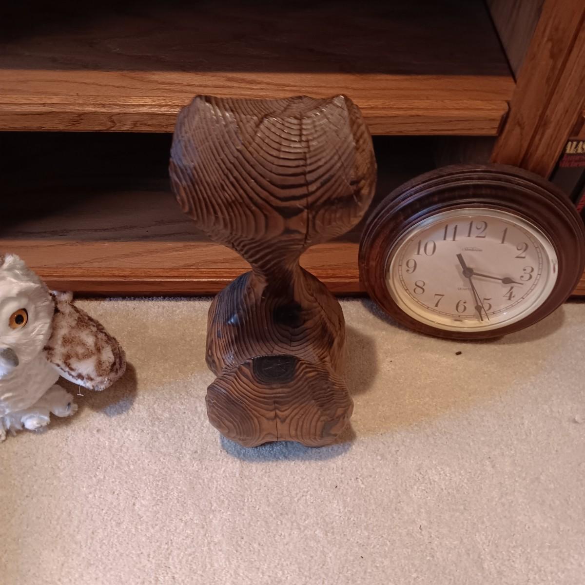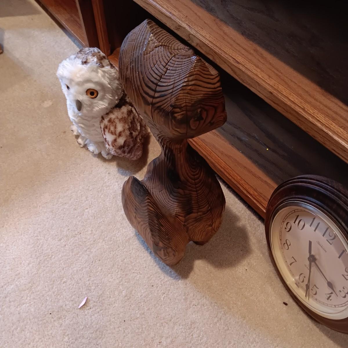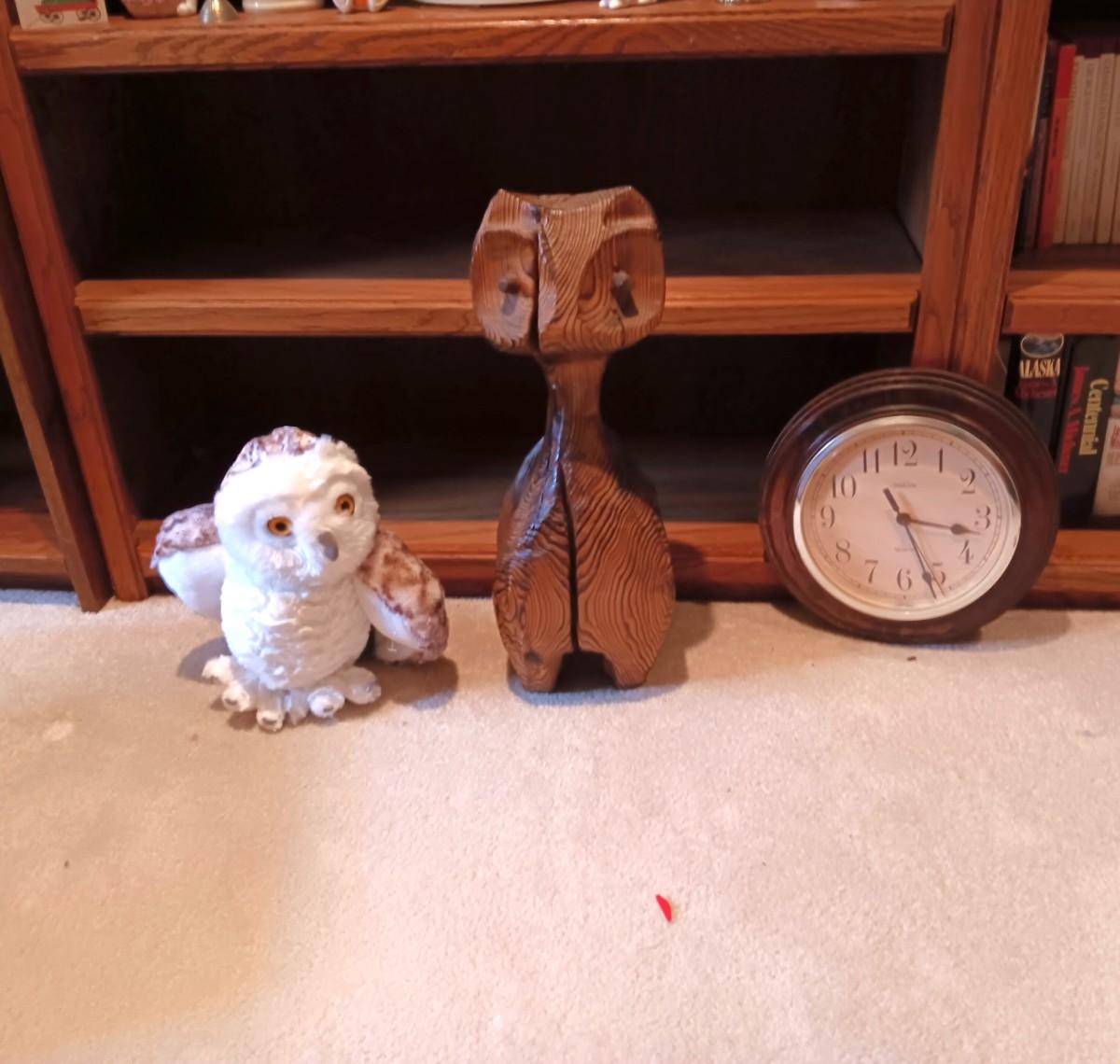 WOODEN CARVED OWL, PICTURE AND PLUSH OWLS PLUS A WALL CLOCK