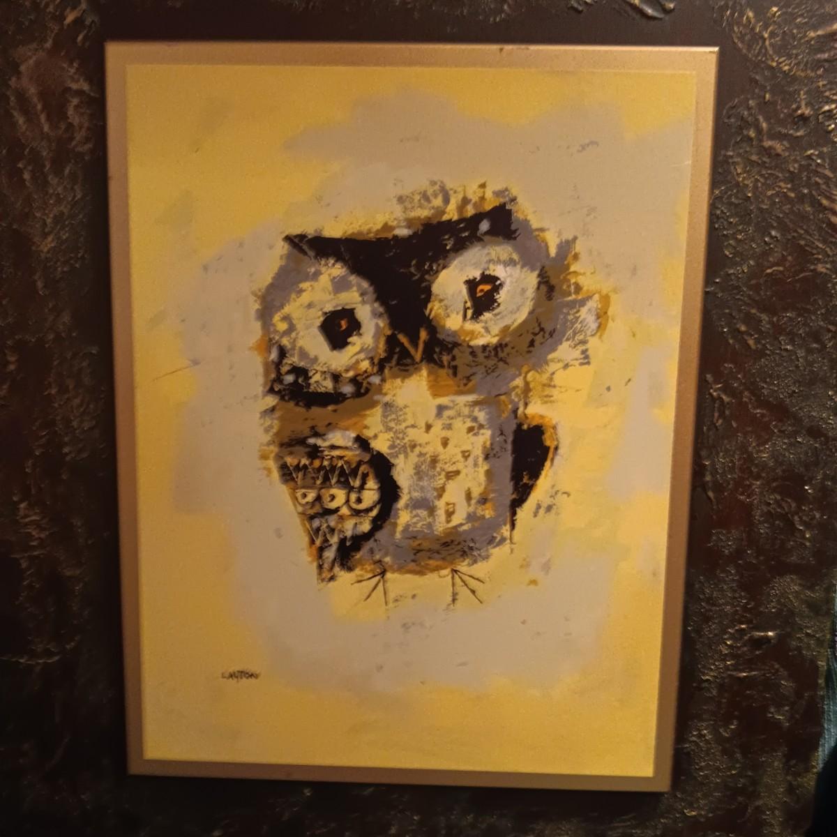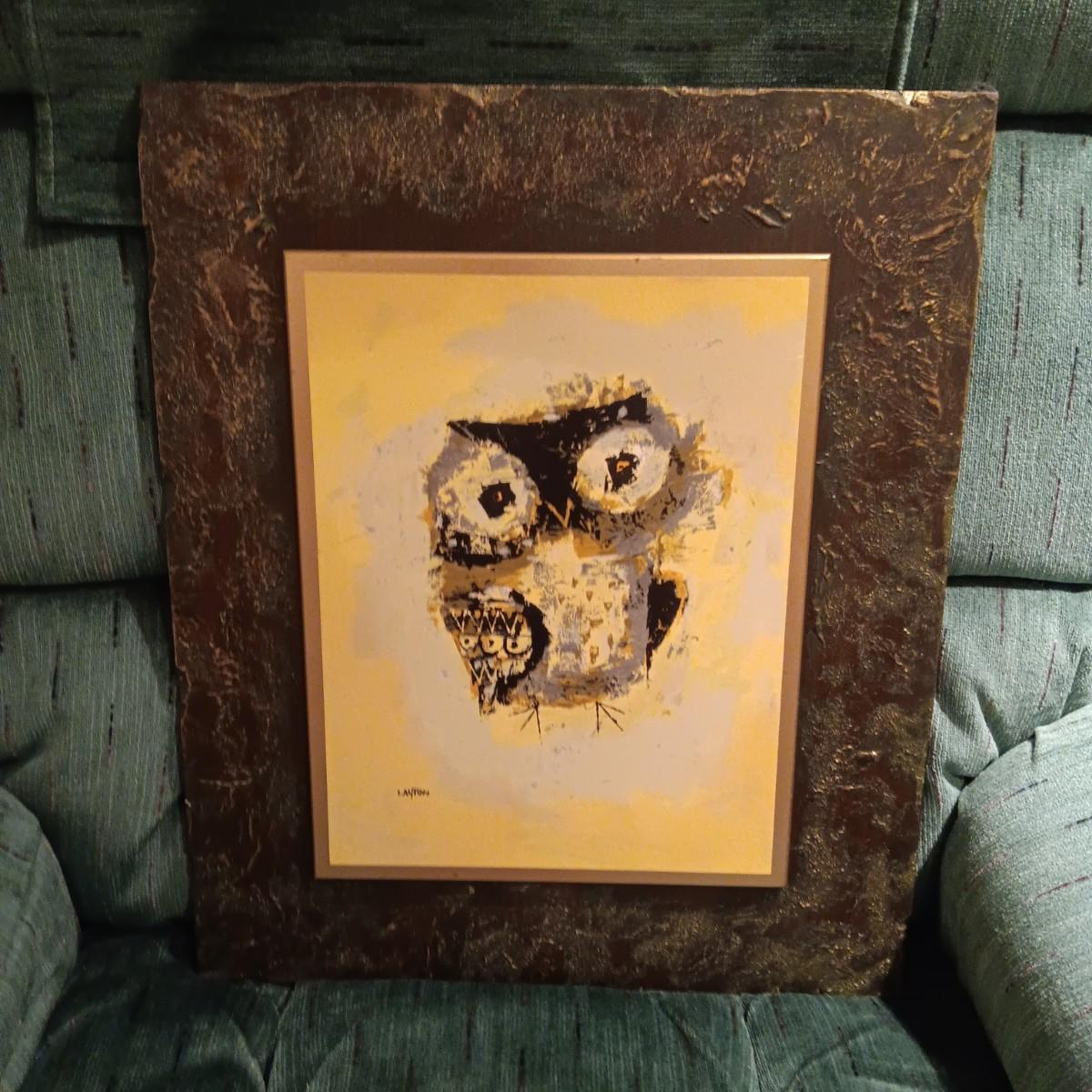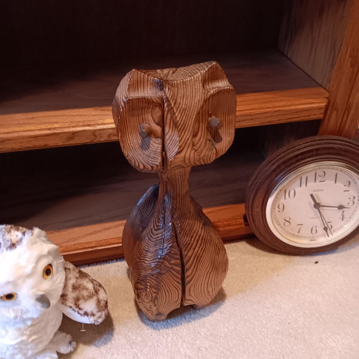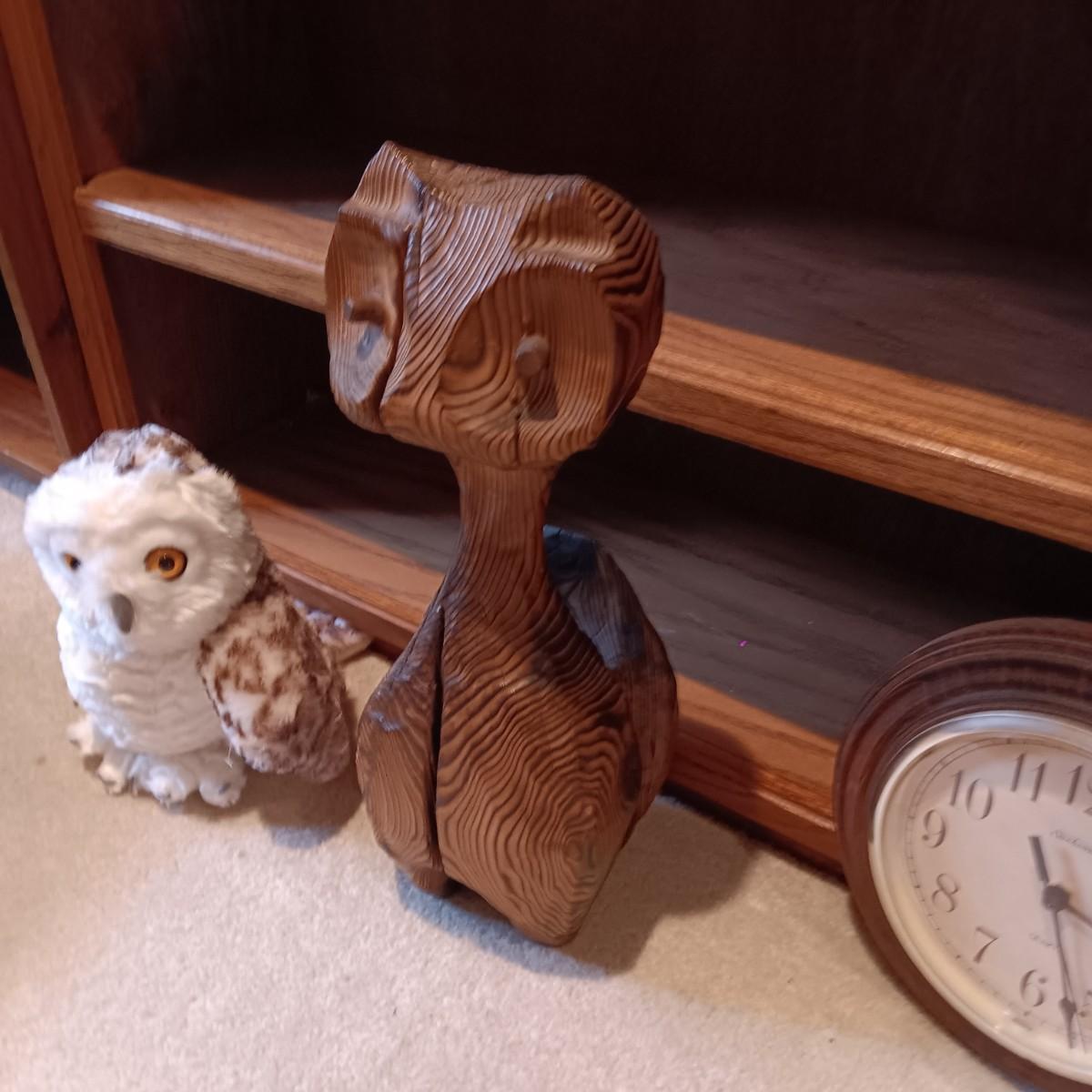 WOODEN CARVED OWL, PICTURE AND PLUSH OWLS PLUS A WALL CLOCK