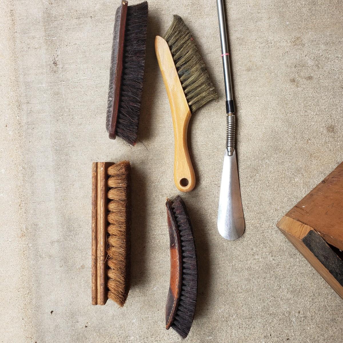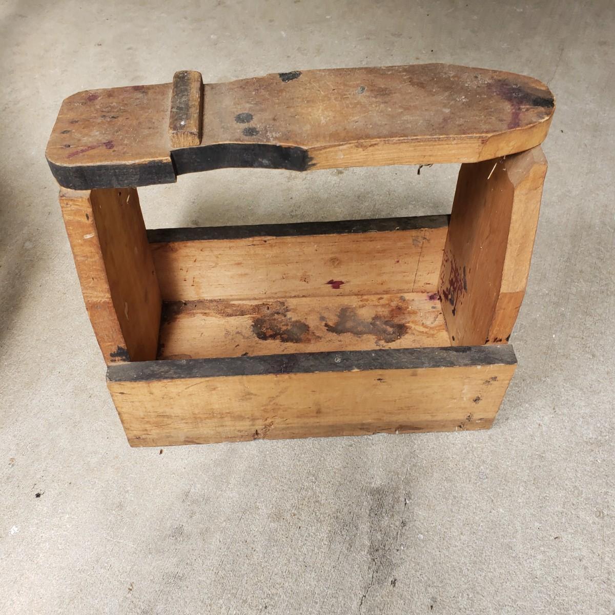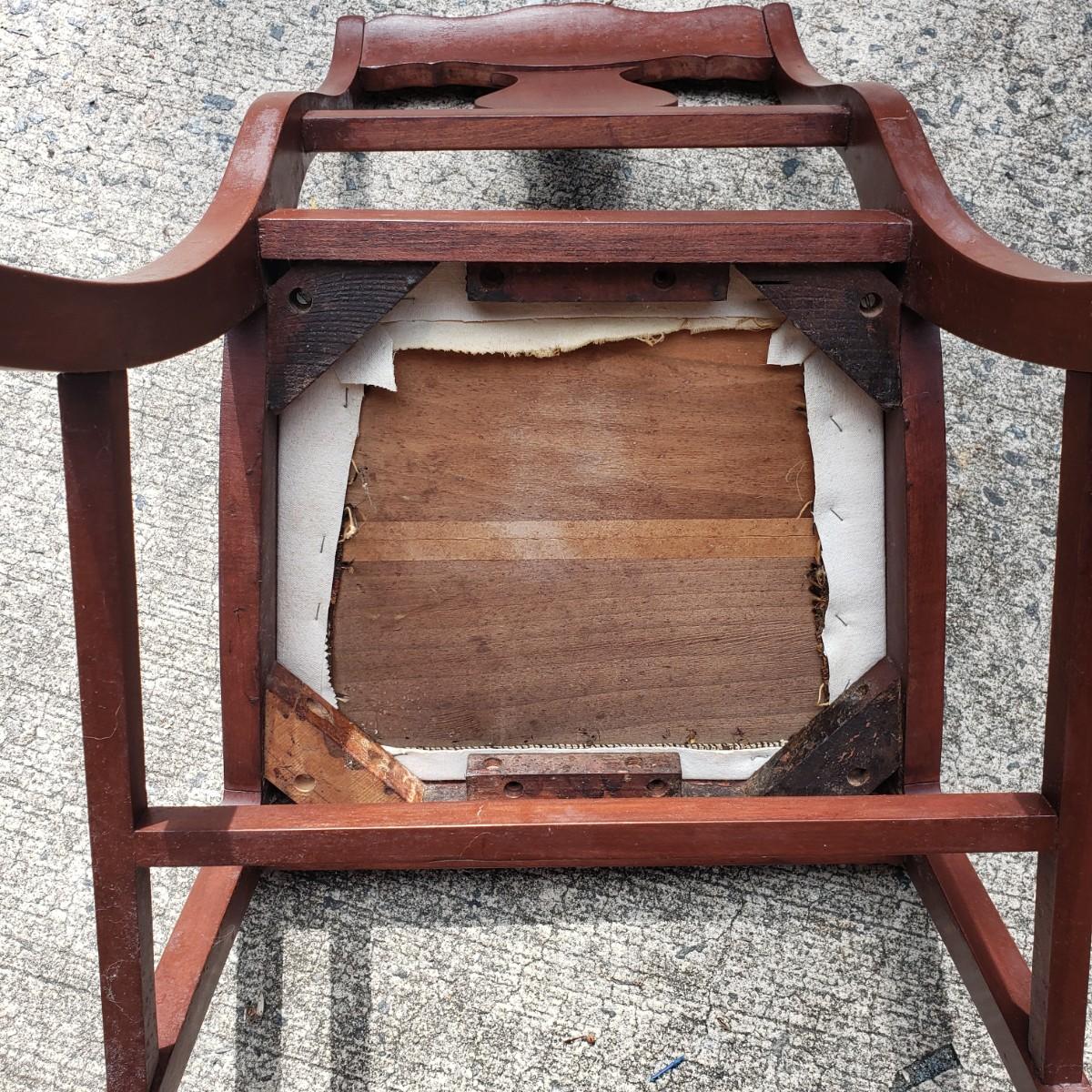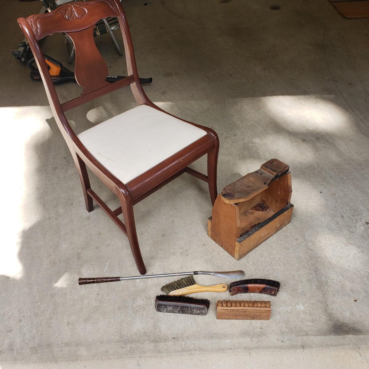This wood chair measures 18" x 18" x 33"H, with a seat height of 18". The upholstery does have a stain, see picture. The wooden caddy measures 13" x 7" x 11"H and comes with four brushes. Don't forget the golf club like shoe horn!