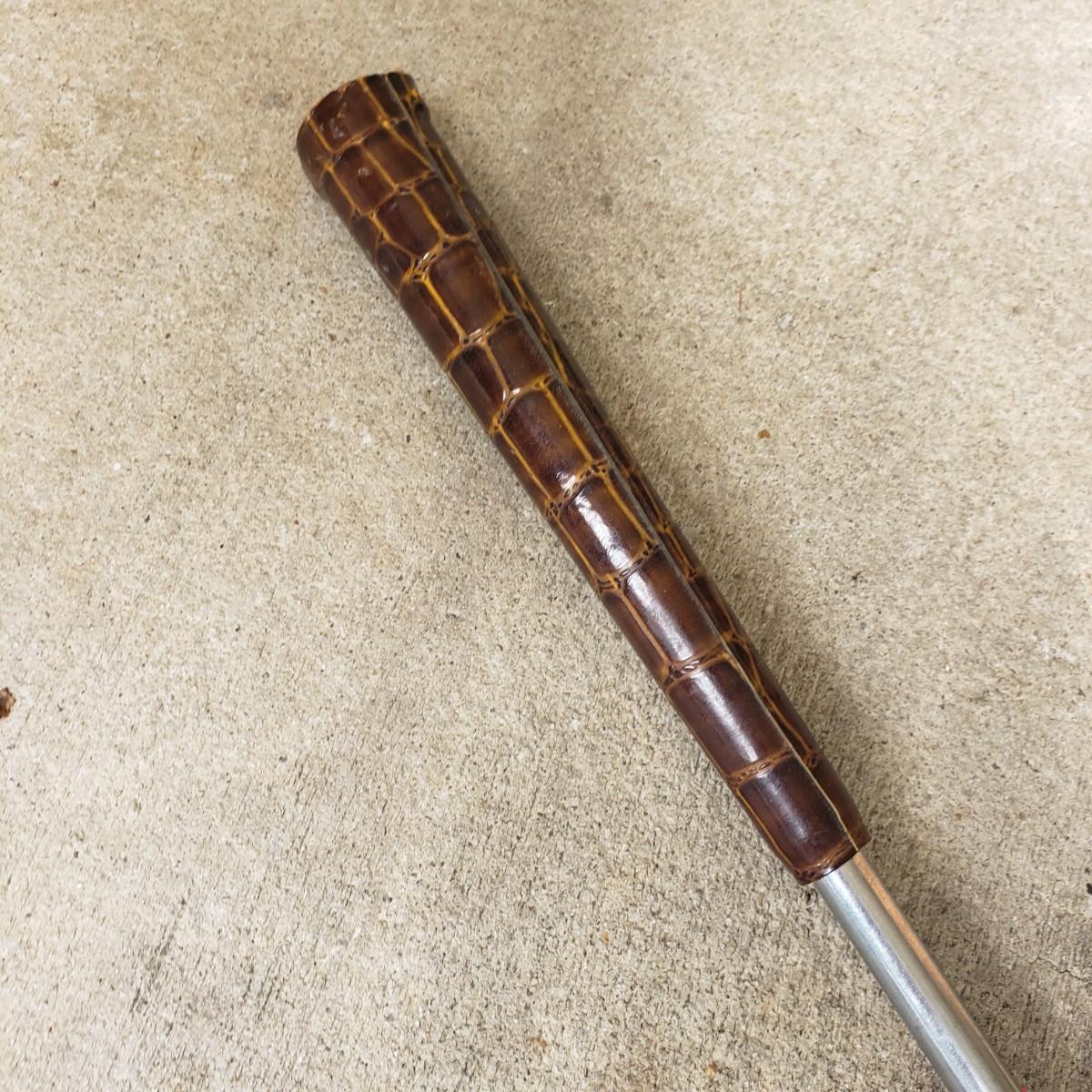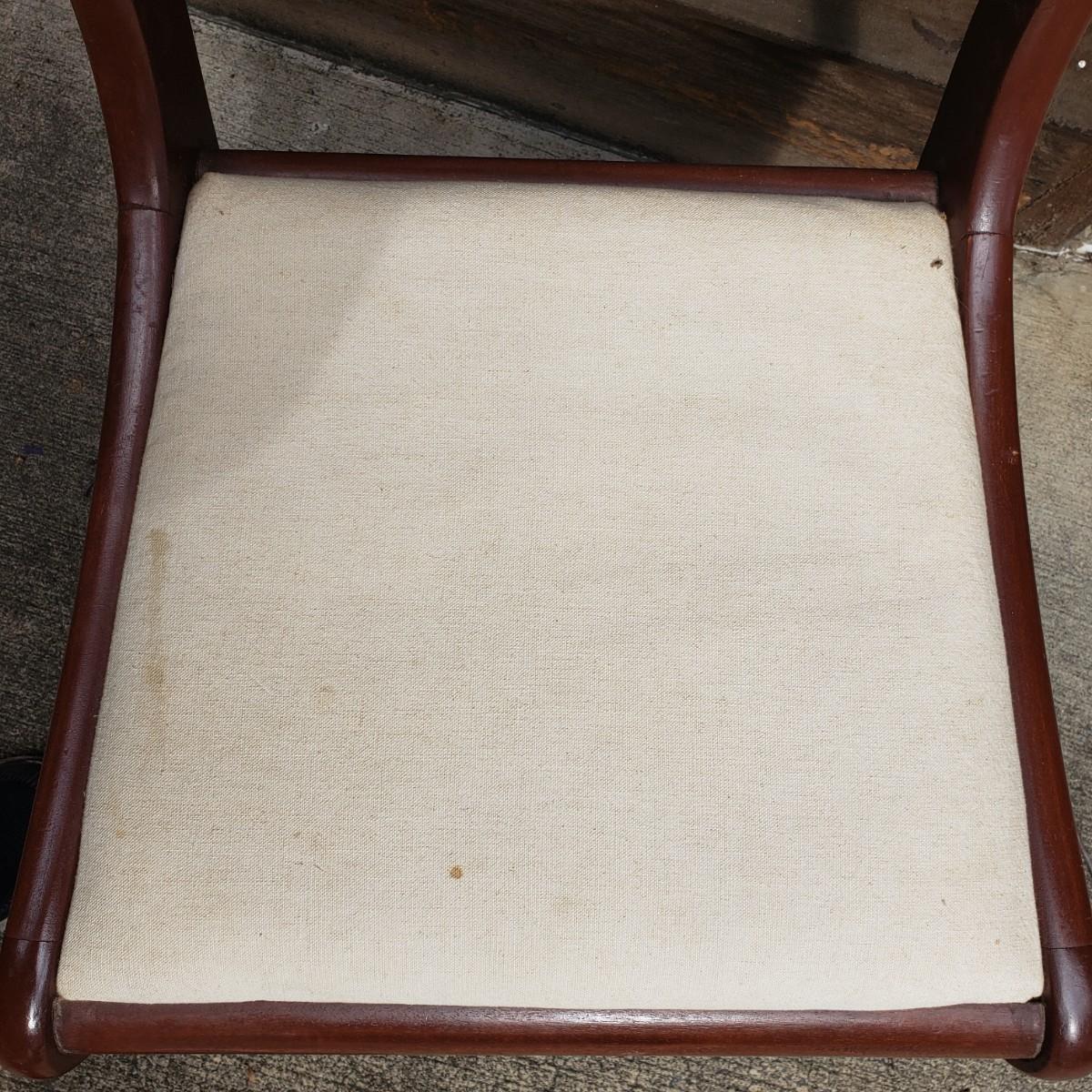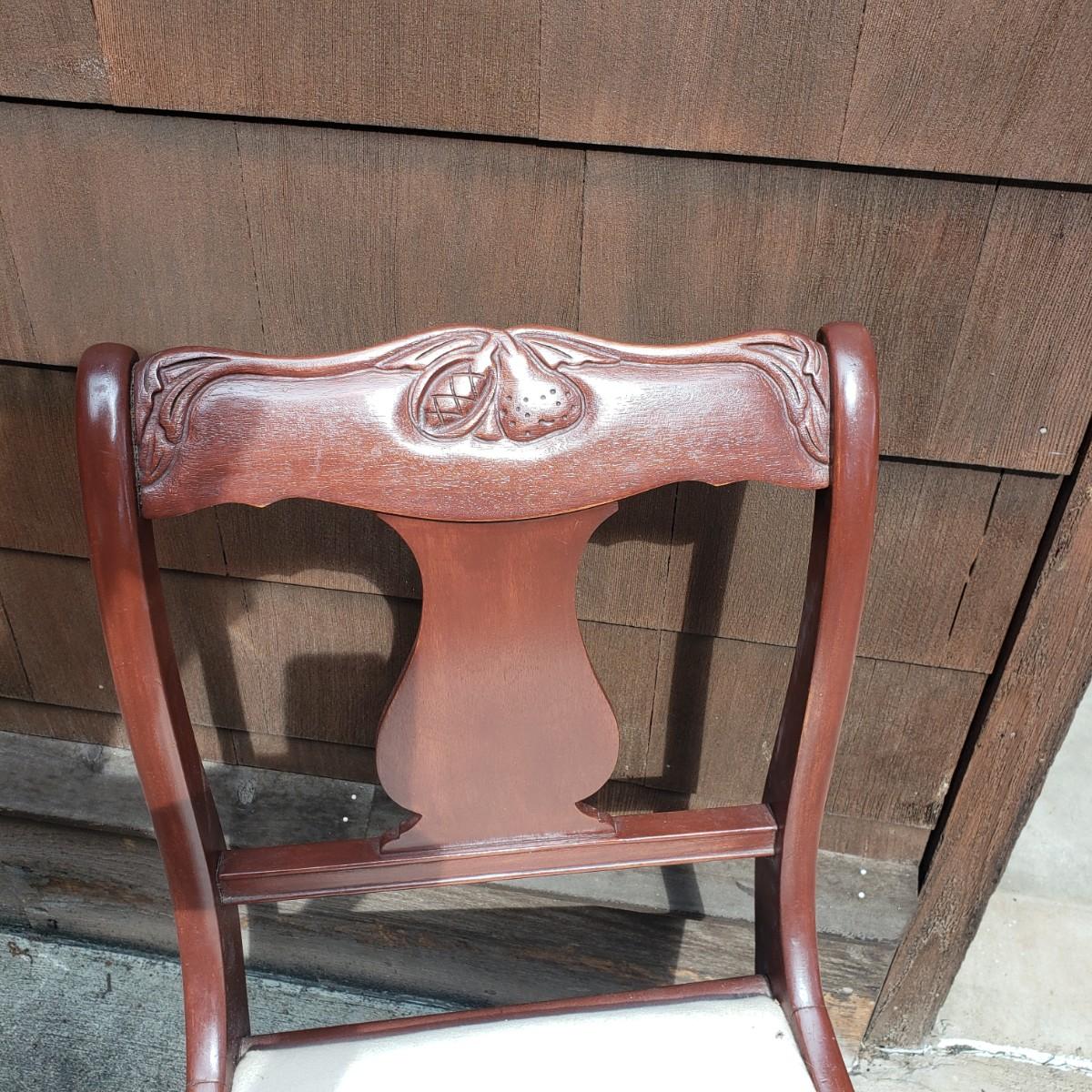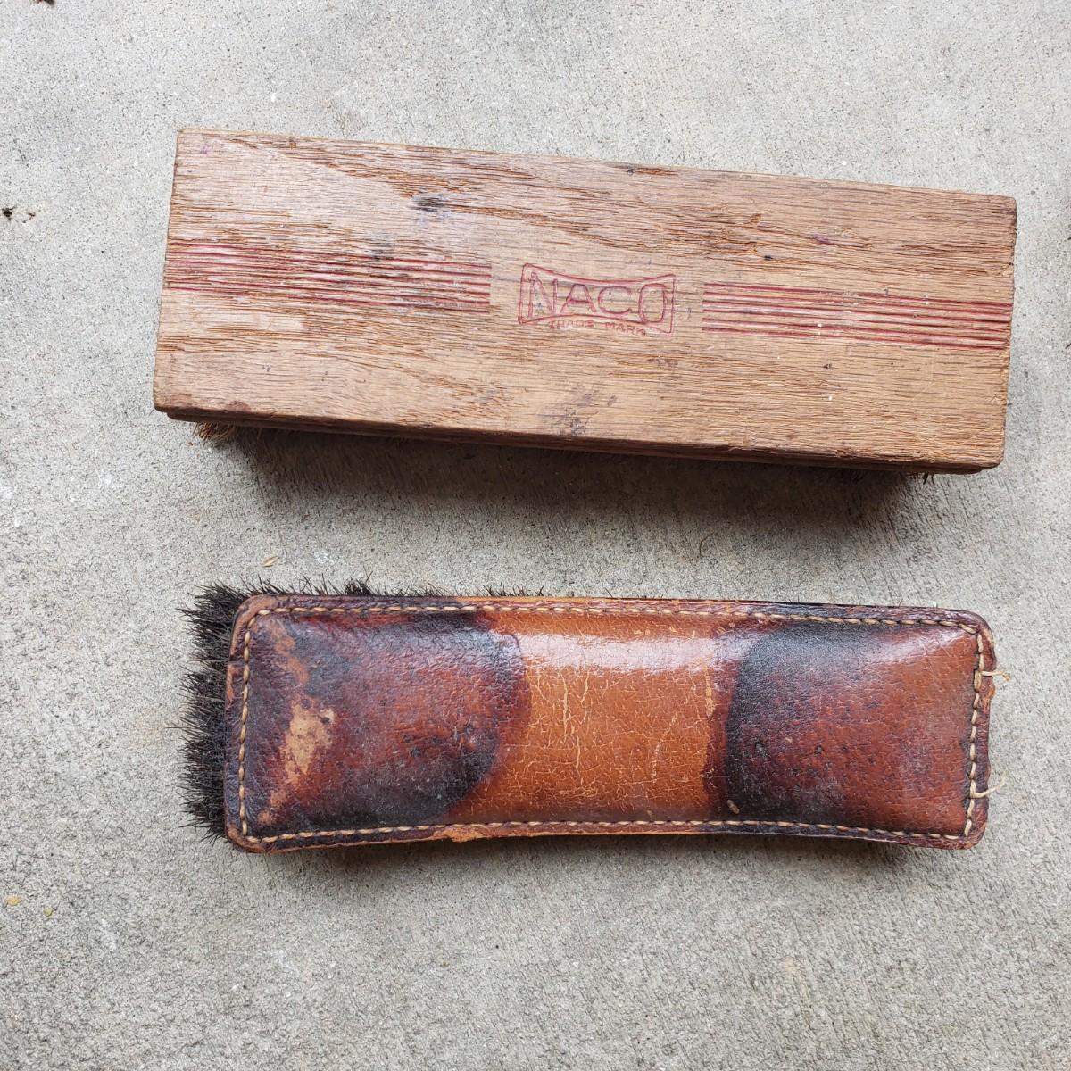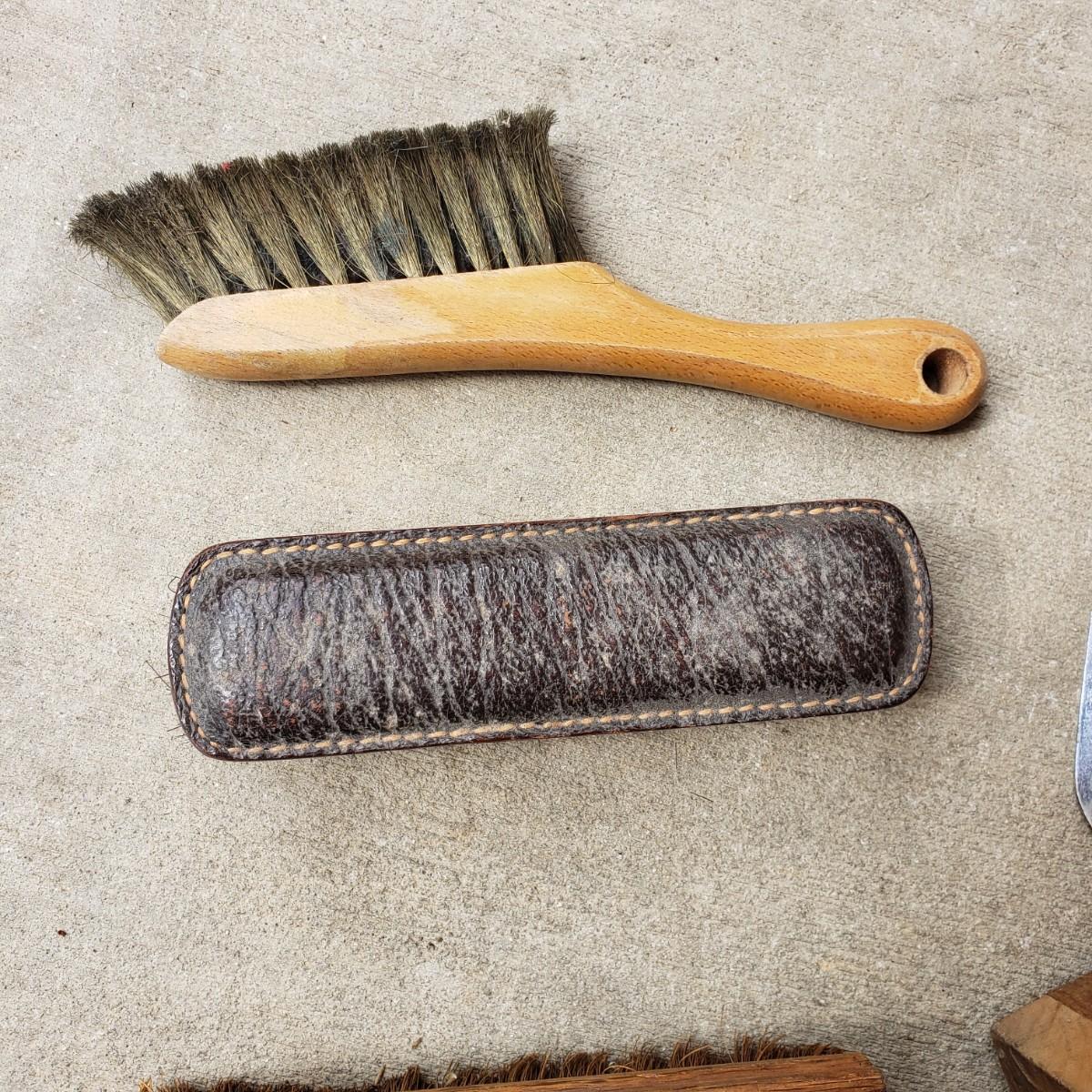 This wood chair measures 18" x 18" x 33"H, with a seat height of 18". The upholstery does have a stain, see picture. The wooden caddy measures 13" x 7" x 11"H and comes with four brushes. Don't forget the golf club like shoe horn!