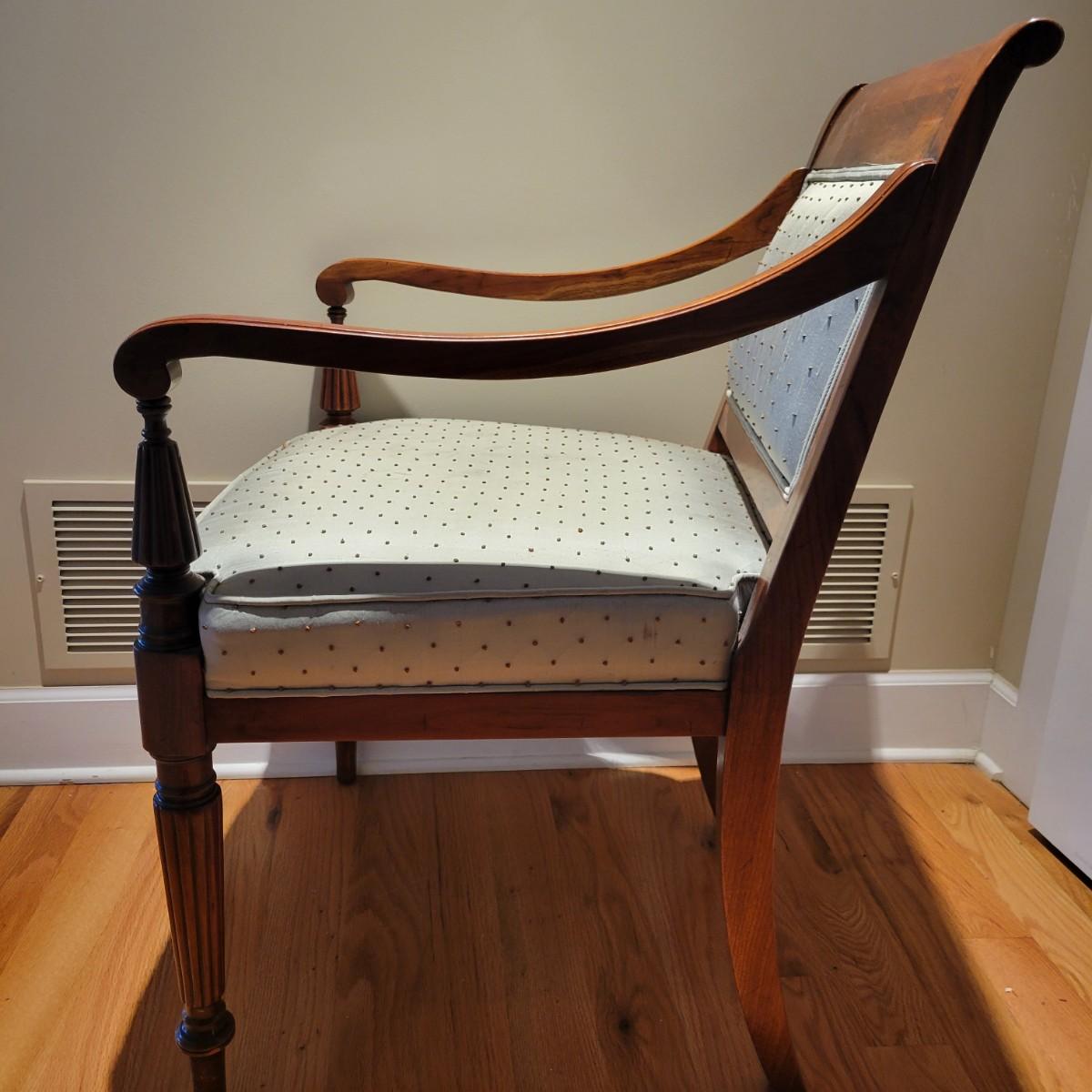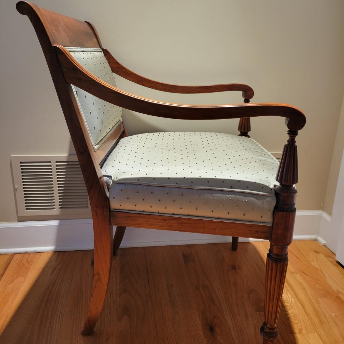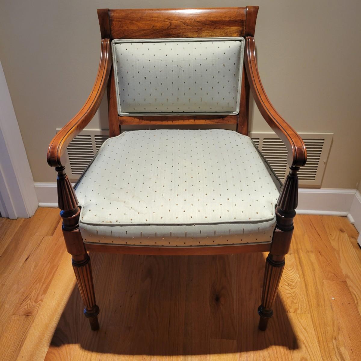 A wooden chair in good condition with some minor blemishes. The cushion does have some minor staining. This chair is made of wood and has a rich walnut finish. There are decorative details on the arms and legs, and the fabric has a silk like feel to it. Measures approximately 23" x 24" x 34" with a seat height of 19" Local pickup only