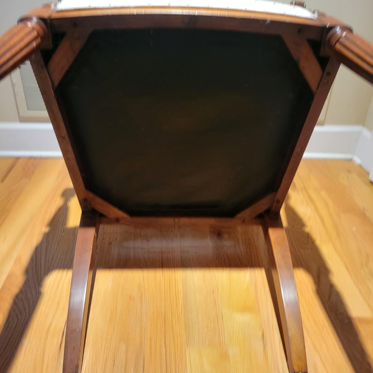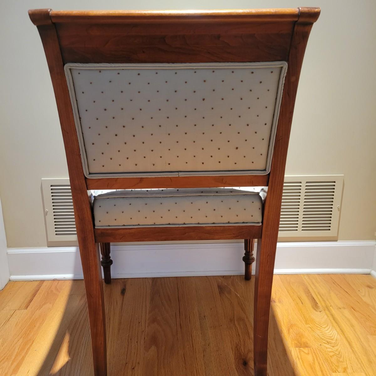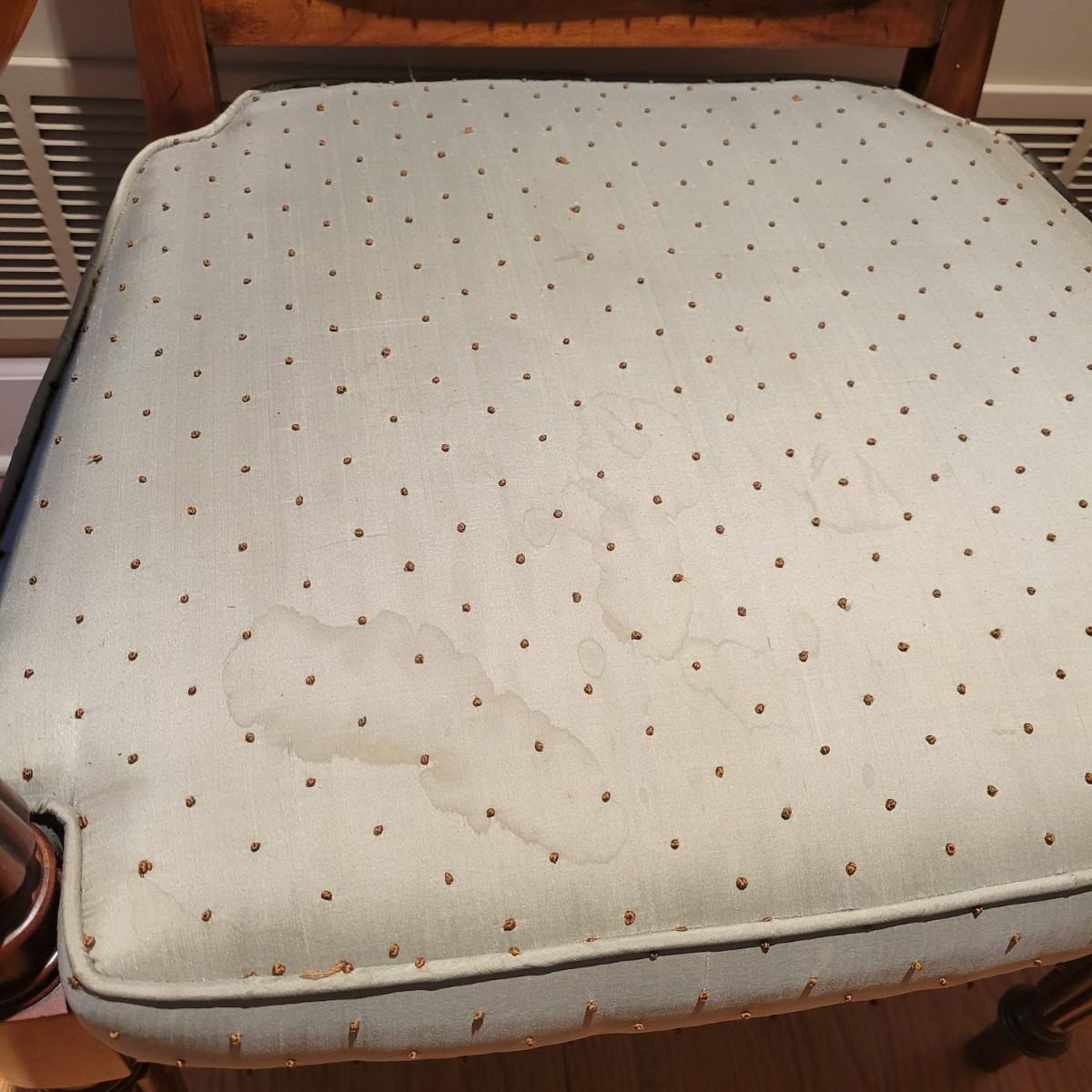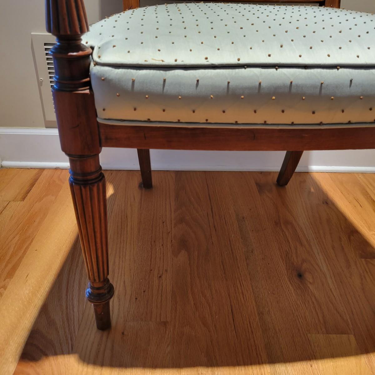 A wooden chair in good condition with some minor blemishes. The cushion does have some minor staining. This chair is made of wood and has a rich walnut finish. There are decorative details on the arms and legs, and the fabric has a silk like feel to it. Measures approximately 23" x 24" x 34" with a seat height of 19" Local pickup only