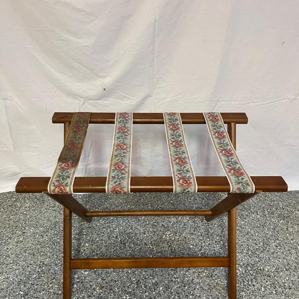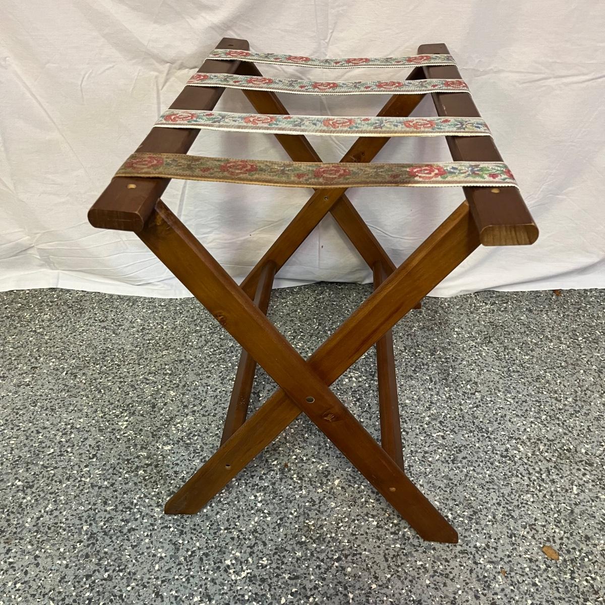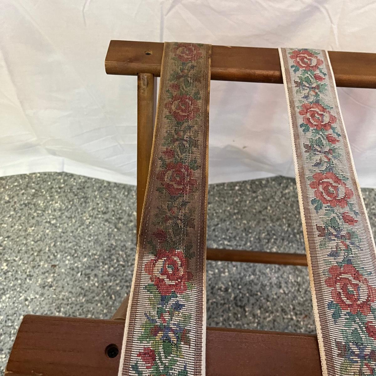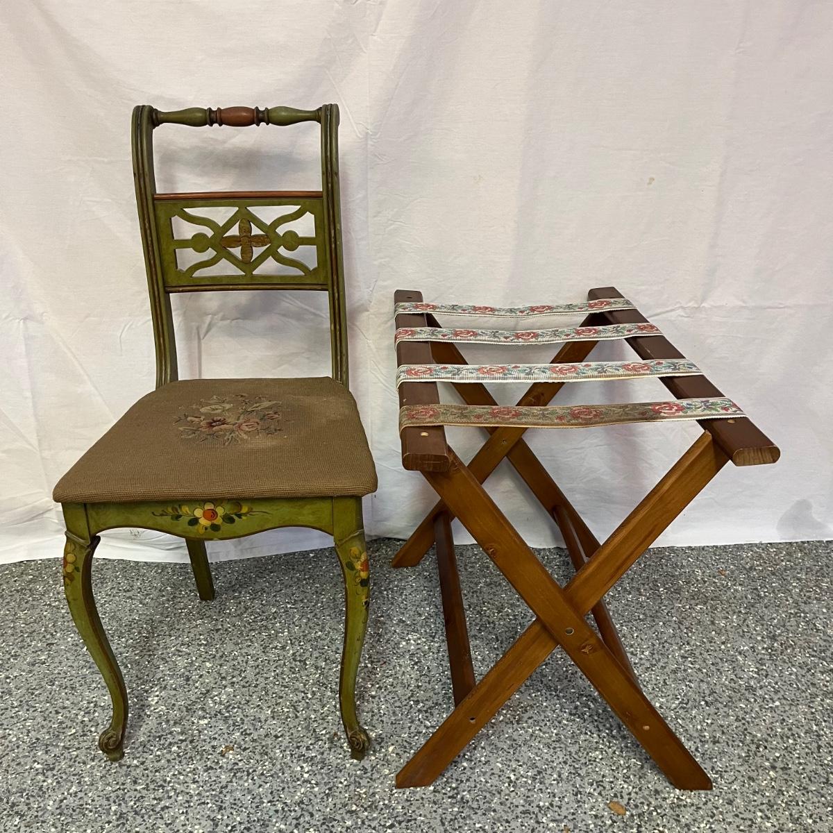 Lot includes a wooden chair with a floral embroidered seat and a wooden framed suitcase stand with webbing. Chair measures 15” x 17” x 33”H with a 17.5” seat height. One piece of webbing has a stain, see pictures.