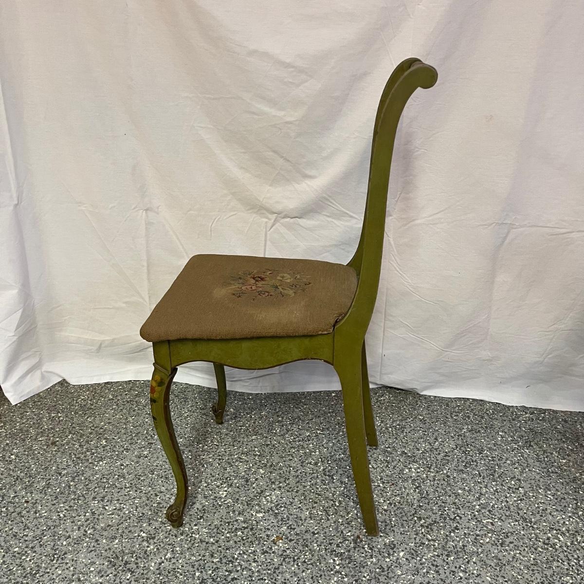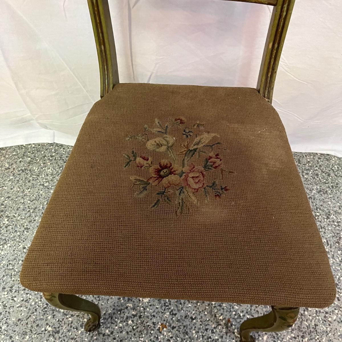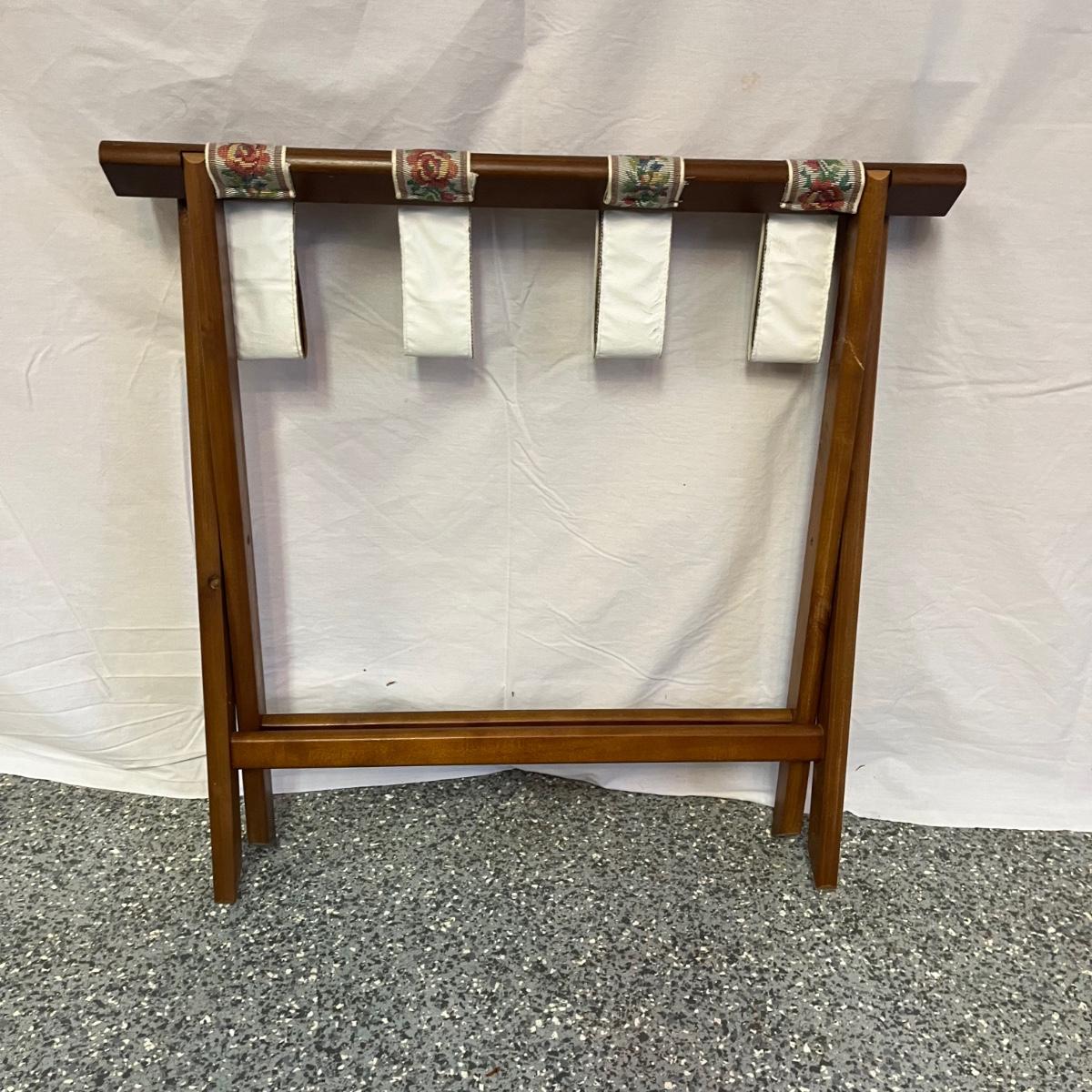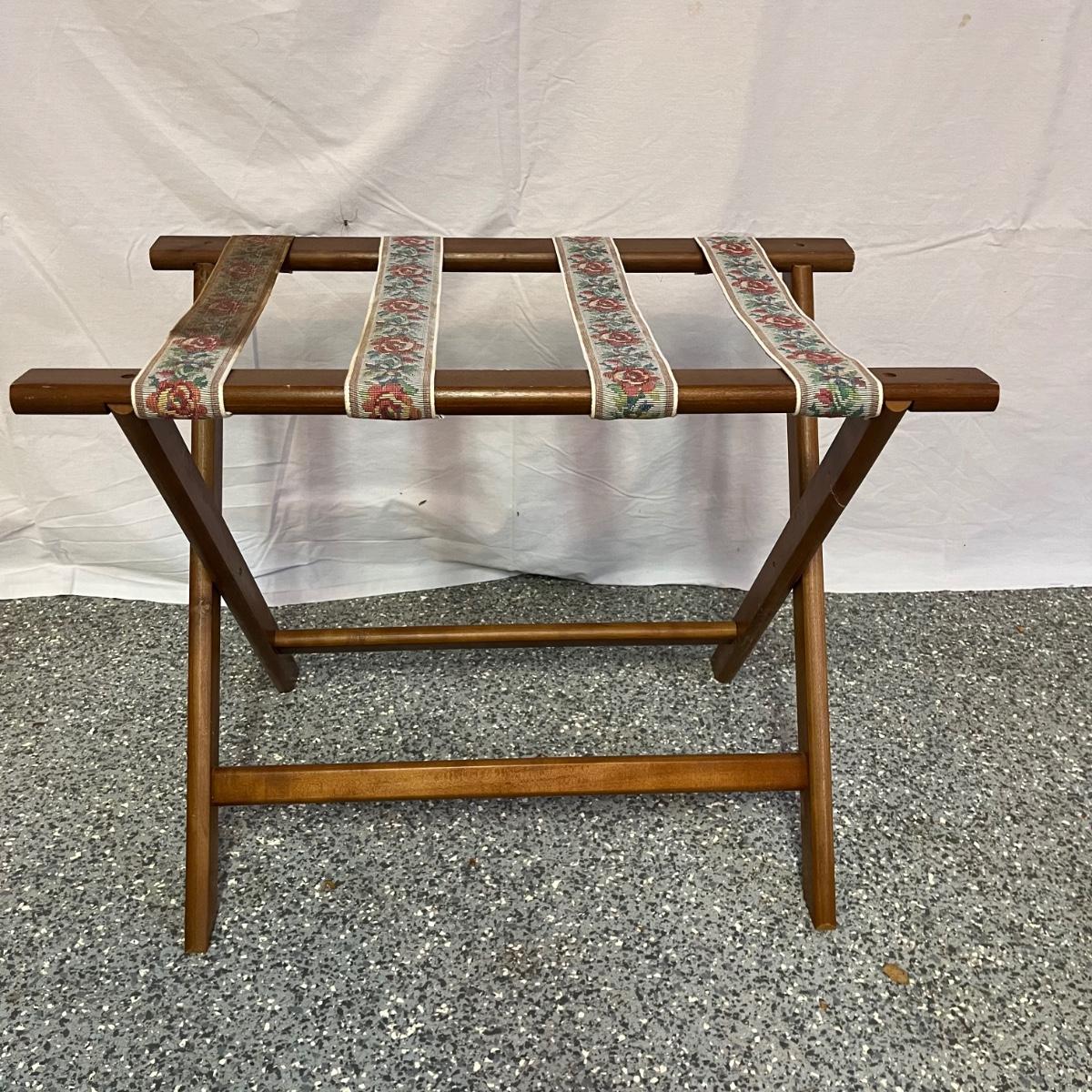 Lot includes a wooden chair with a floral embroidered seat and a wooden framed suitcase stand with webbing. Chair measures 15” x 17” x 33”H with a 17.5” seat height. One piece of webbing has a stain, see pictures.