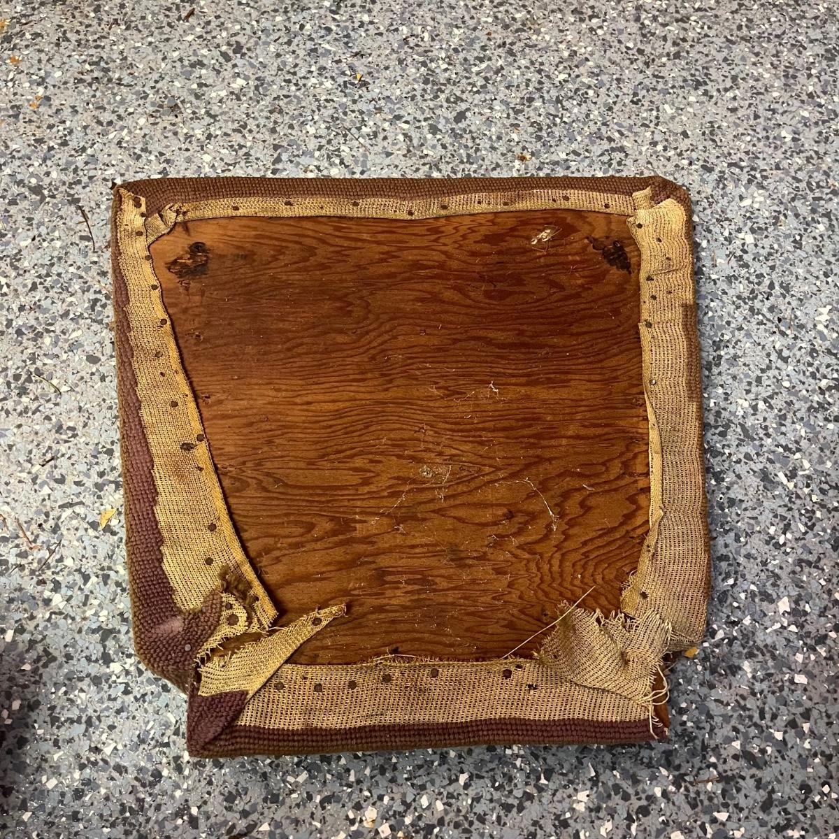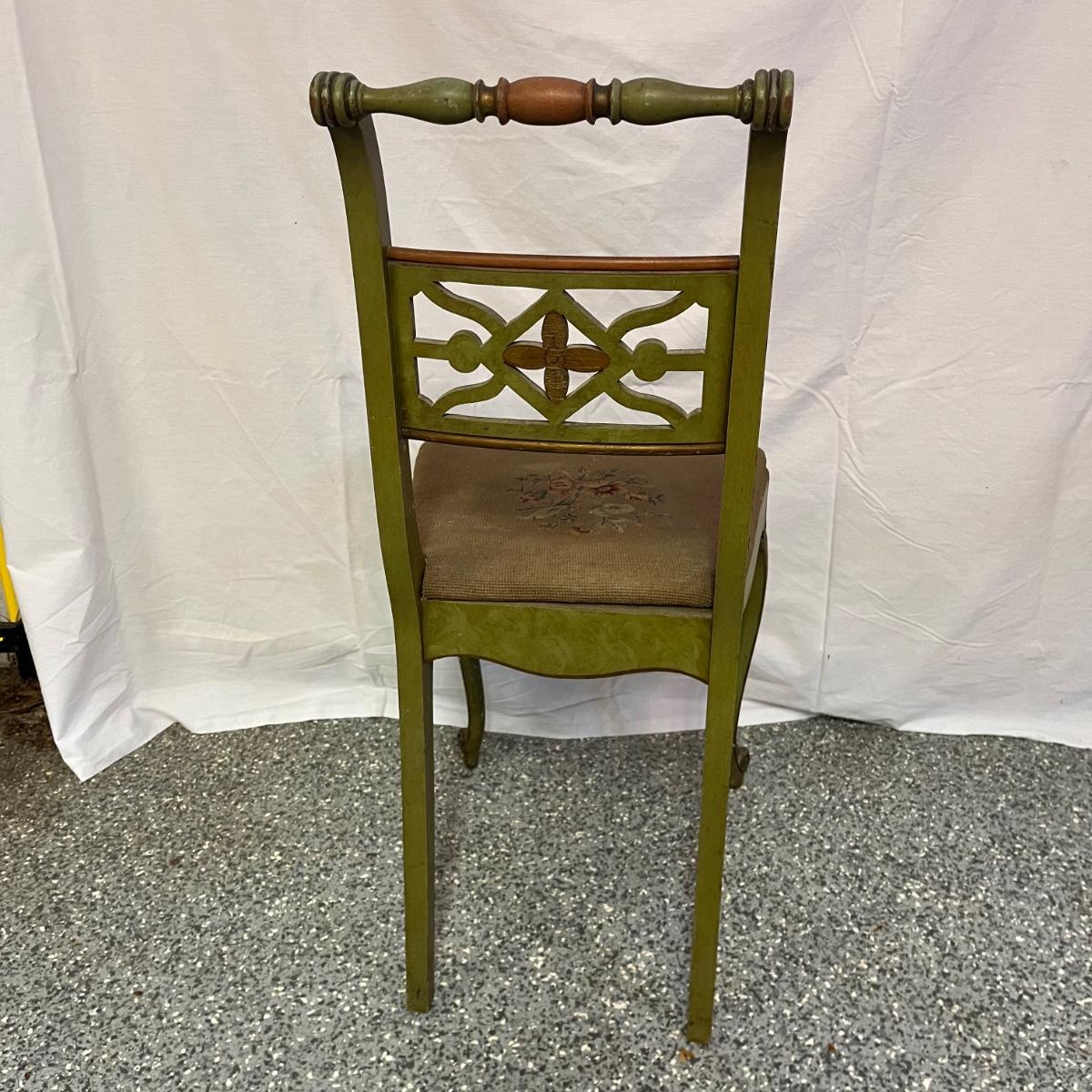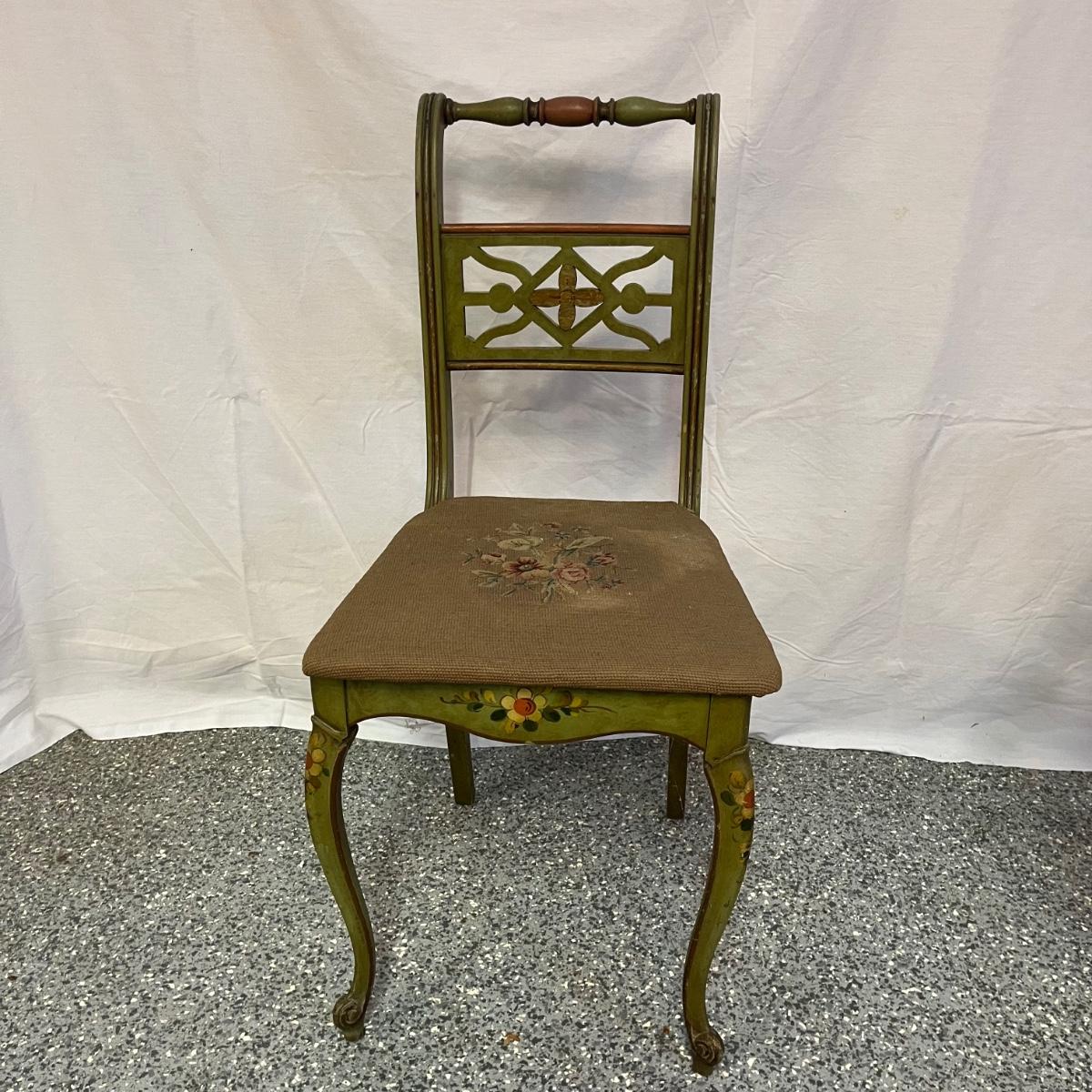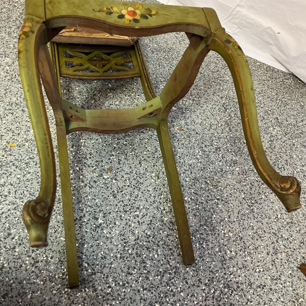 Lot includes a wooden chair with a floral embroidered seat and a wooden framed suitcase stand with webbing. Chair measures 15” x 17” x 33”H with a 17.5” seat height. One piece of webbing has a stain, see pictures.