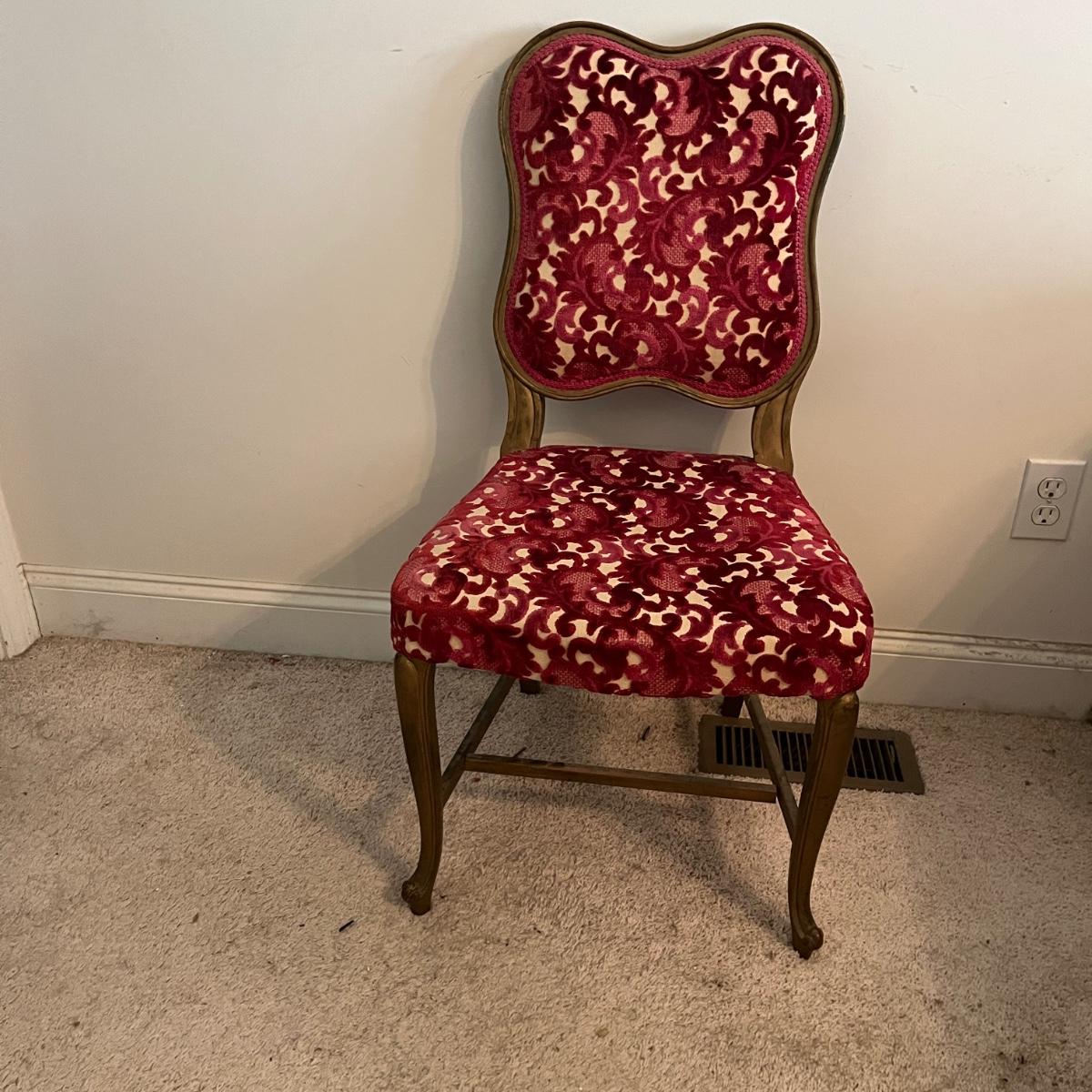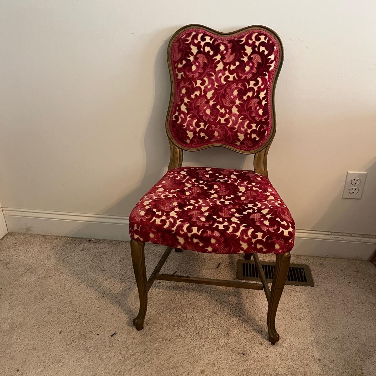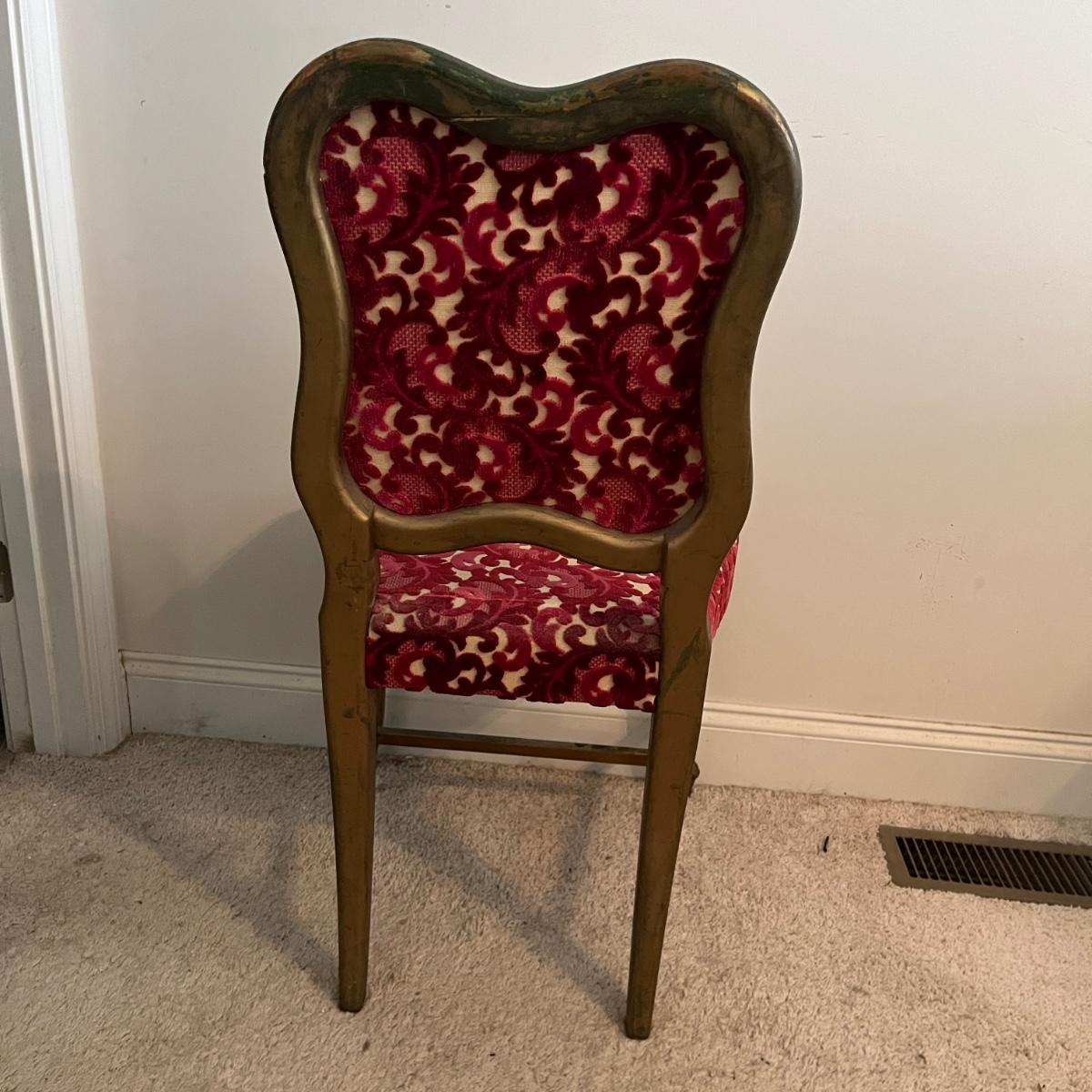 Lot includes a painted gold wooden framed chair with an upholstered and padded seat and back. Chair measures 19” x 18” x 34”H with a 17.5”seat height. Underneath seat has pet hair, see pictures.
